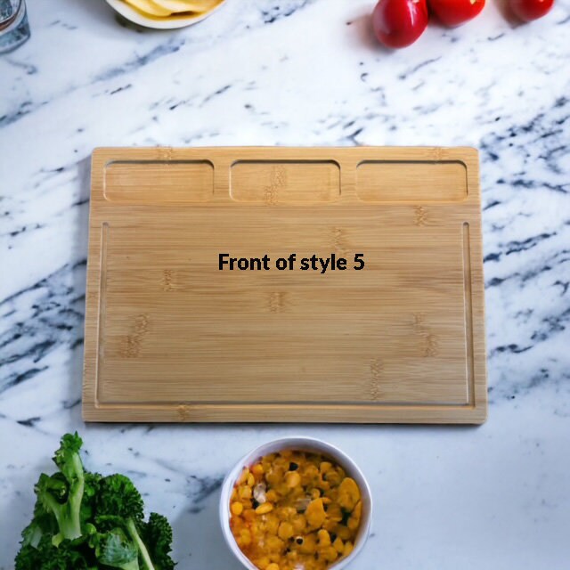 Style 5- 11" x 16" 1/2" thick bamboo with 3 small sections at the top for separating. It has a juice well.