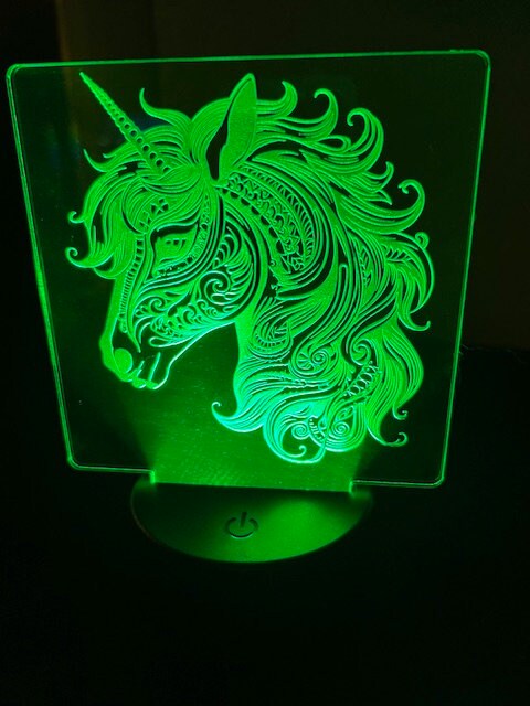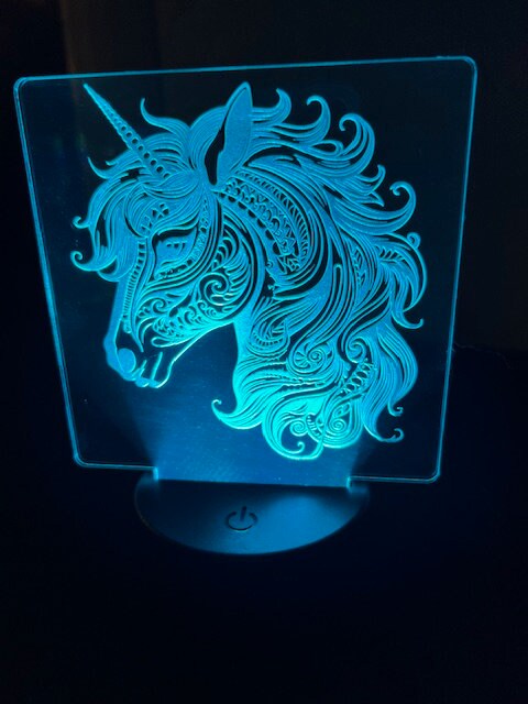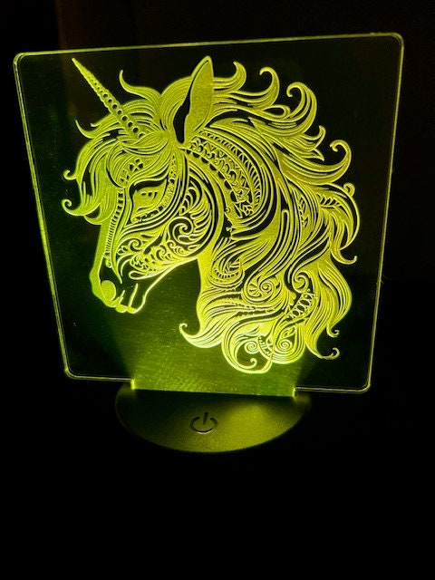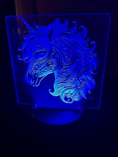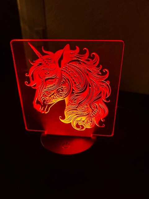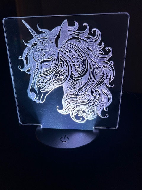 This night light is laser engraved on 3mm clear acrylic. It measures 5 inches wide, 7 inches tall and the base is 3 1/2 inches in depth. It takes a small amount of space for such a stunning light.