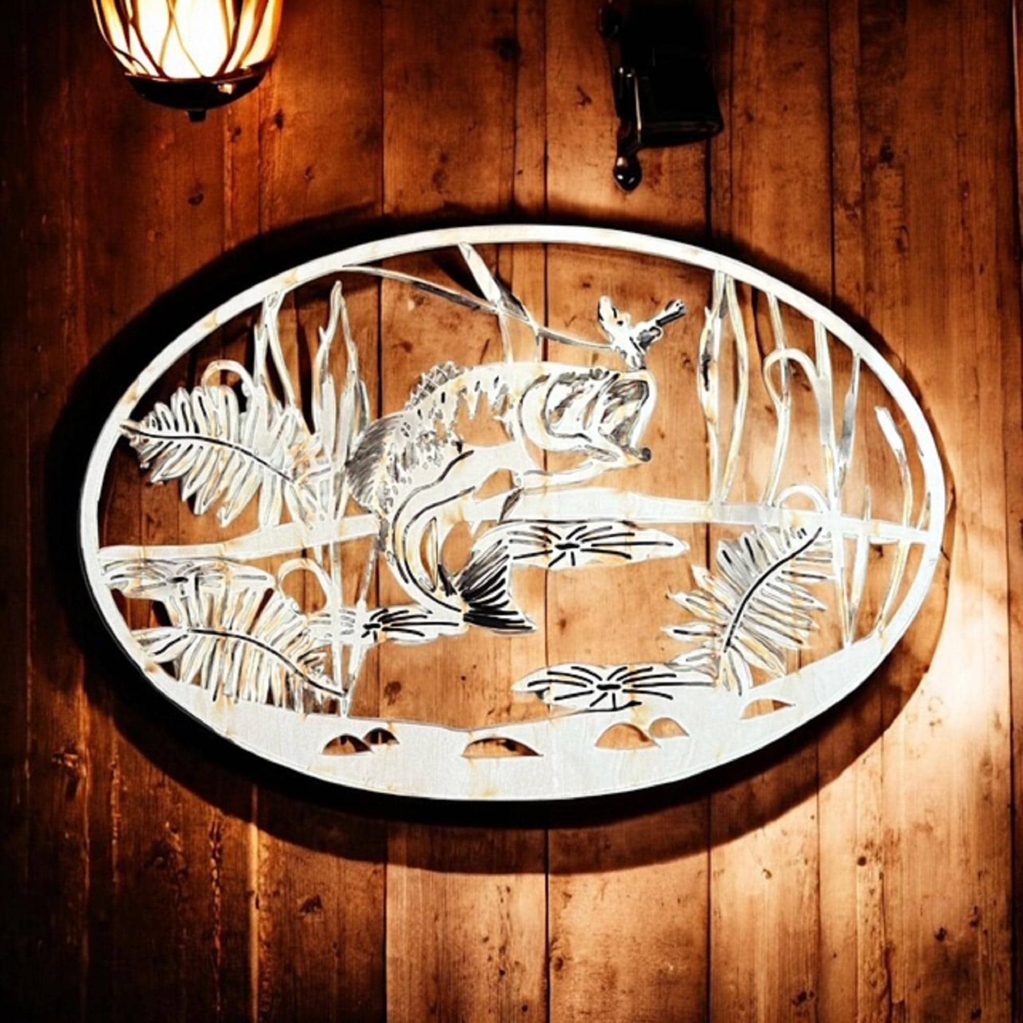 This rustic wooden wall hanging features a beautifully carved bass fish design, perfect for adding a touch of cabin lodge charm to any space. Handcrafted with care, this fishing sign stands out as a genuine piece of décor that fishing enthusiasts and nature lovers will appreciate for its authentic, rugged appeal.