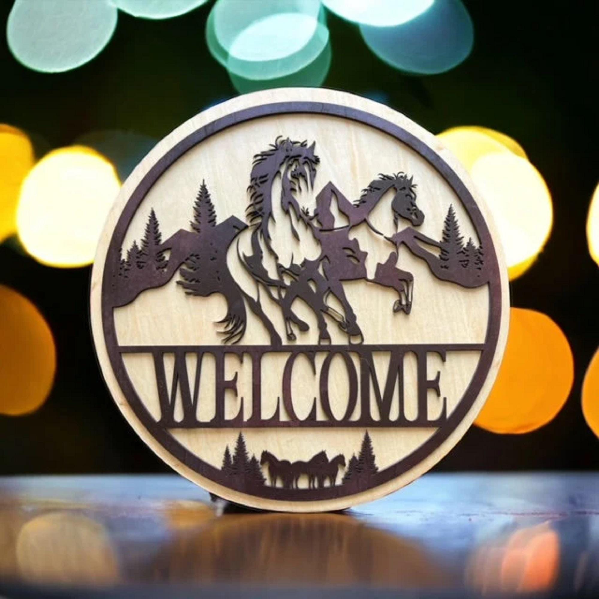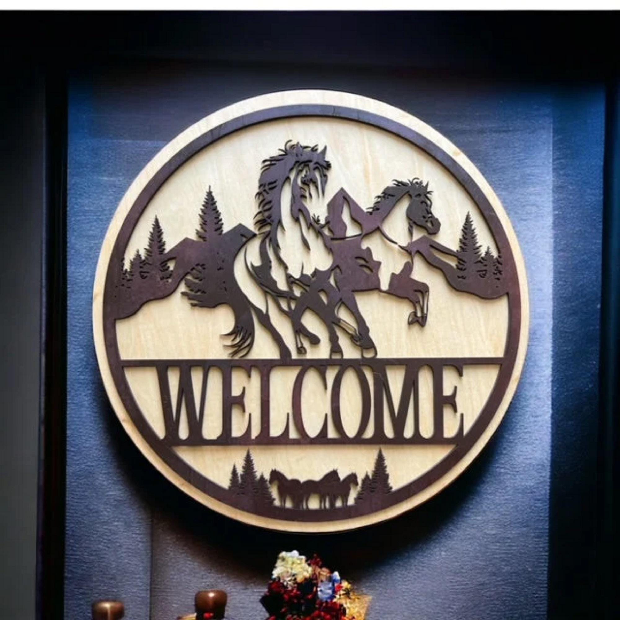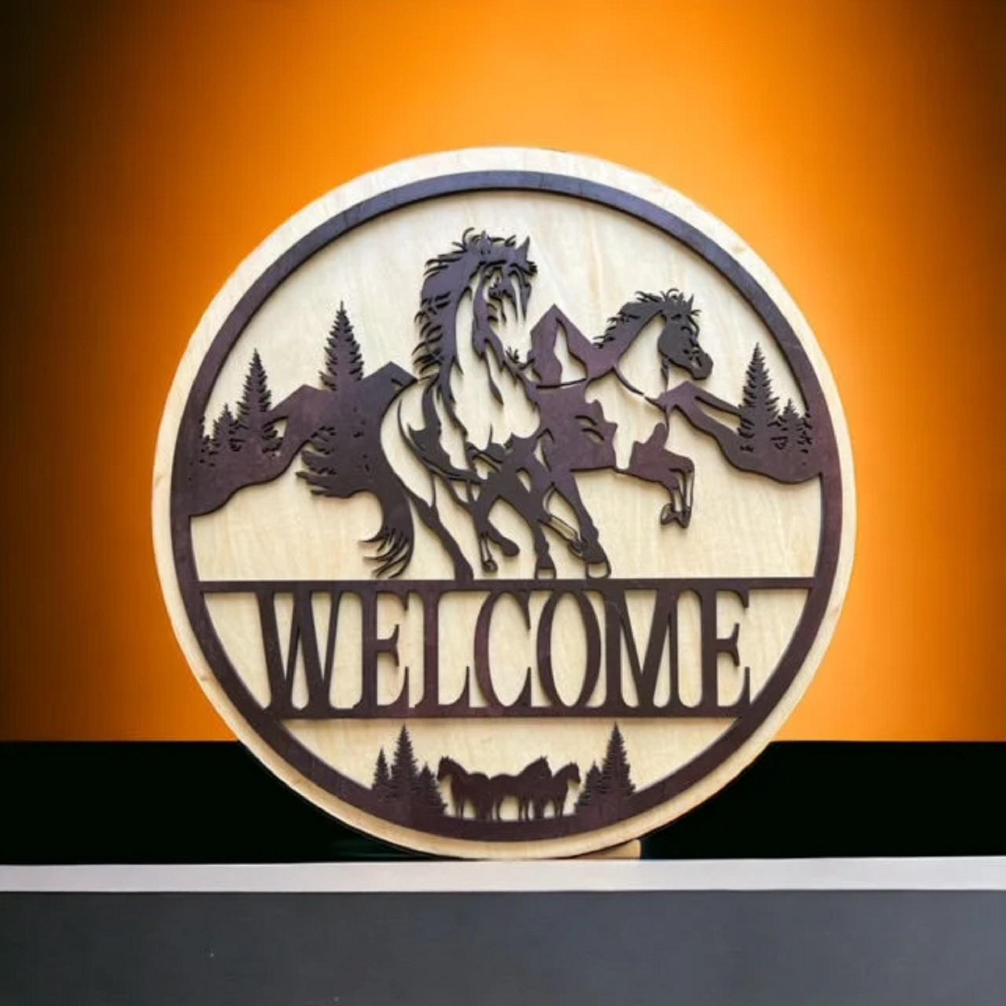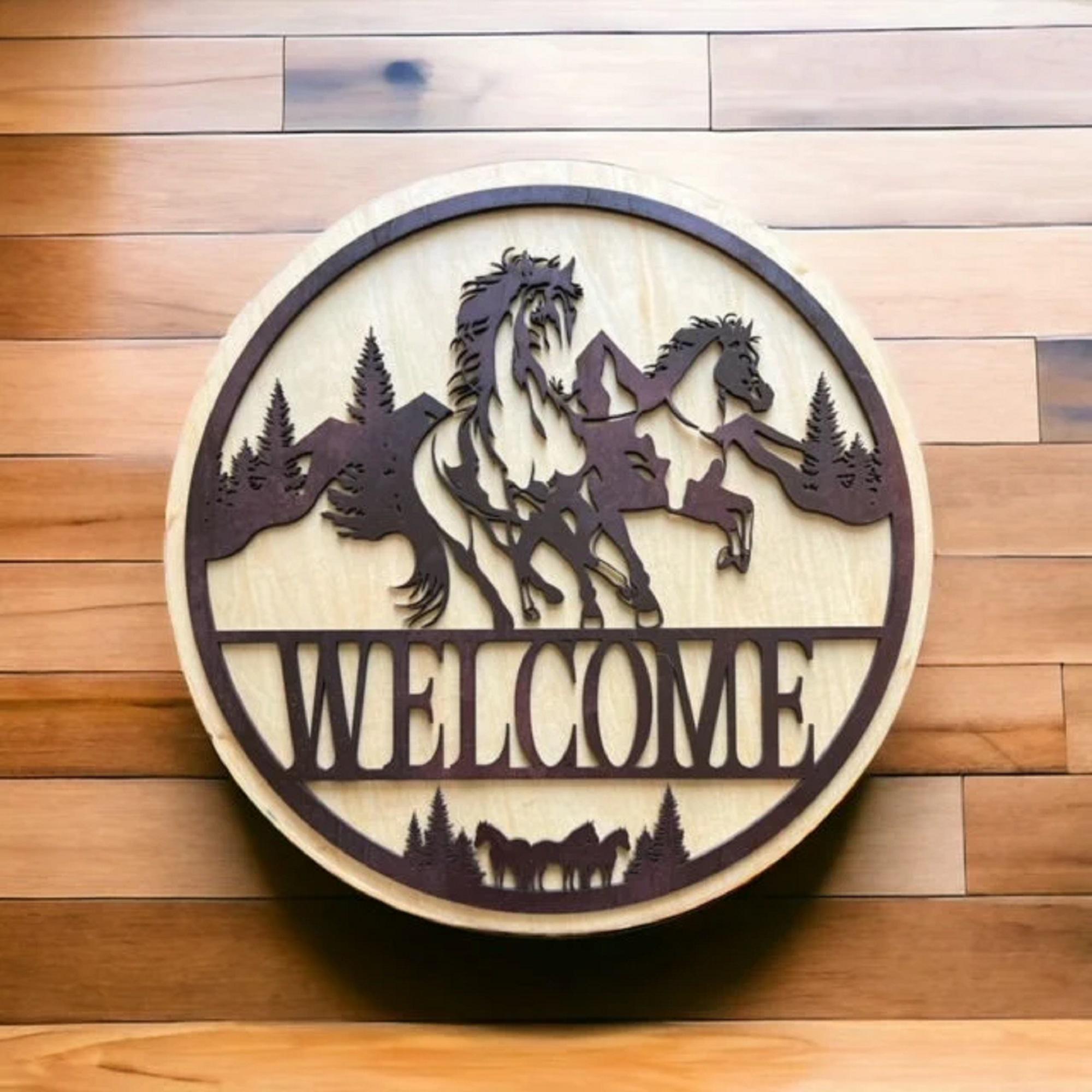 Running Horses Welcome Sign, Rustic Farmhouse Door Hanger