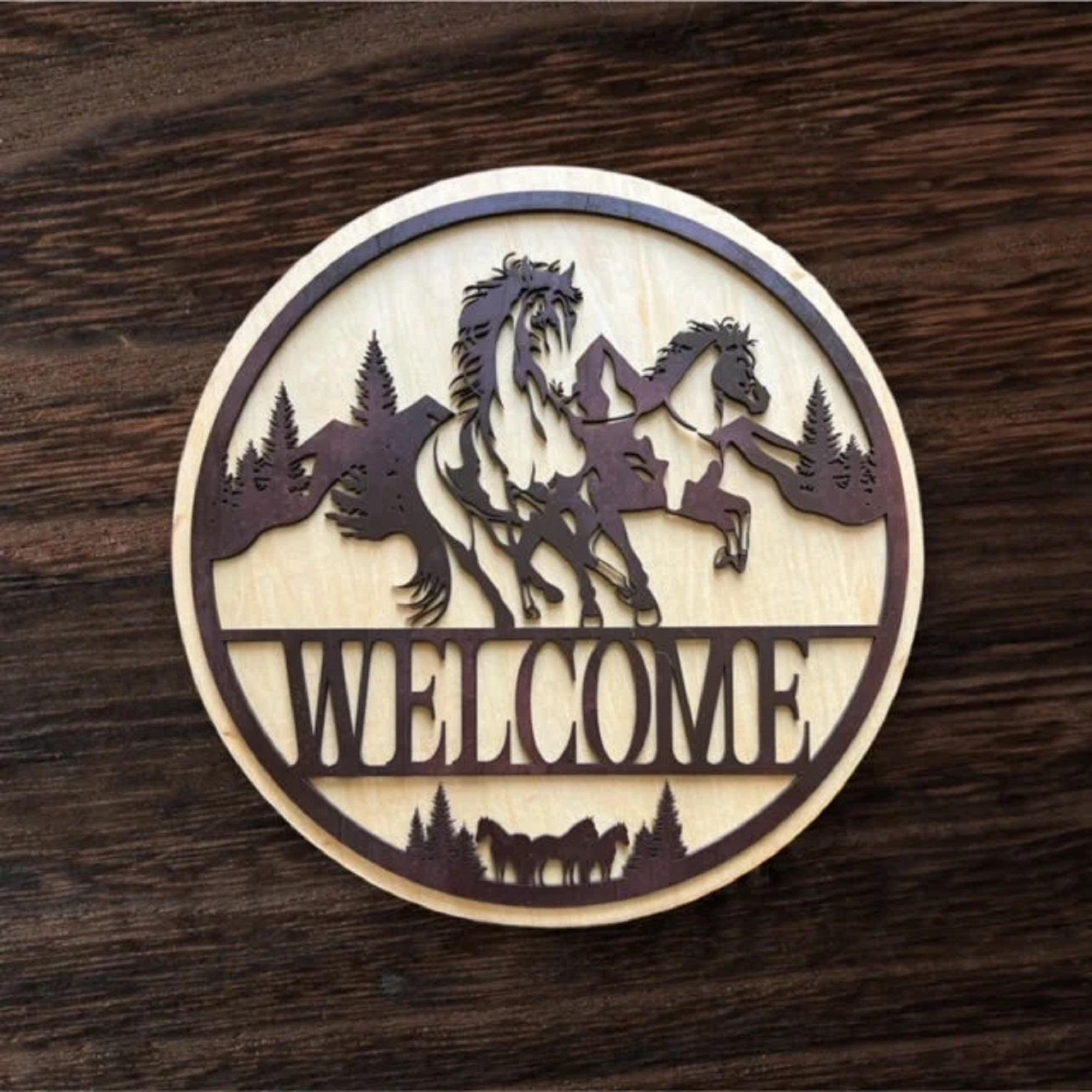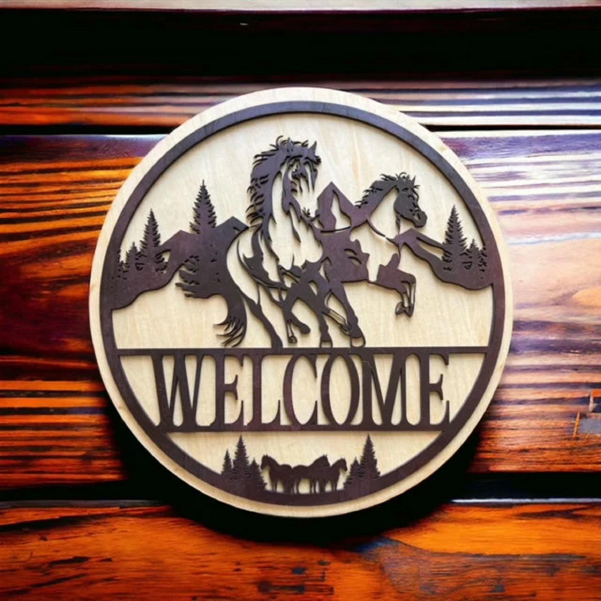 Enhance your entryway with this rustic Running Horses welcome door hanger, designed specifically for horse lovers who appreciate authentic farmhouse décor. Crafted from 3mm basswood, this charming piece stands out with its natural finish and lively horse motif, making it a warm and inviting addition to both indoor and outdoor spaces.