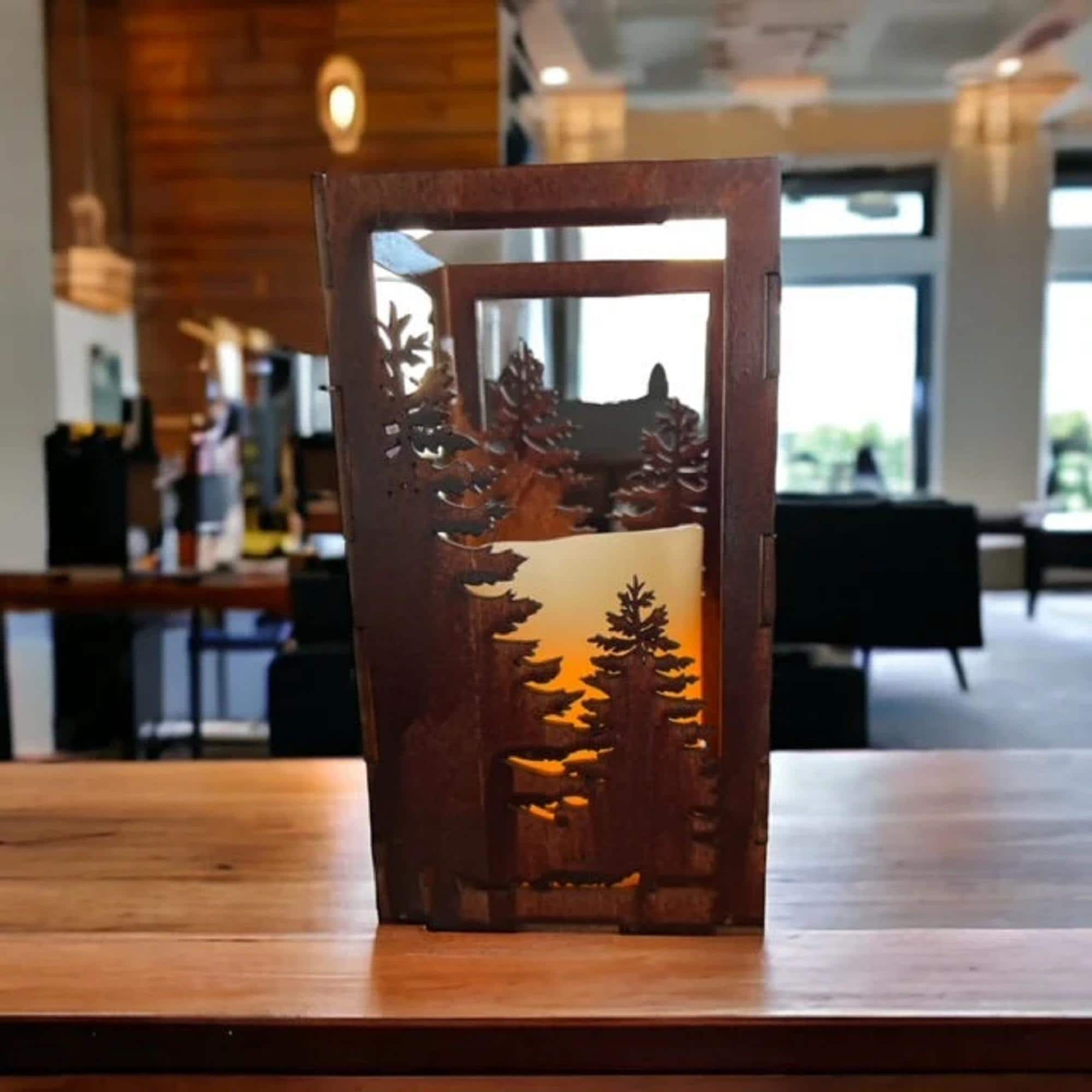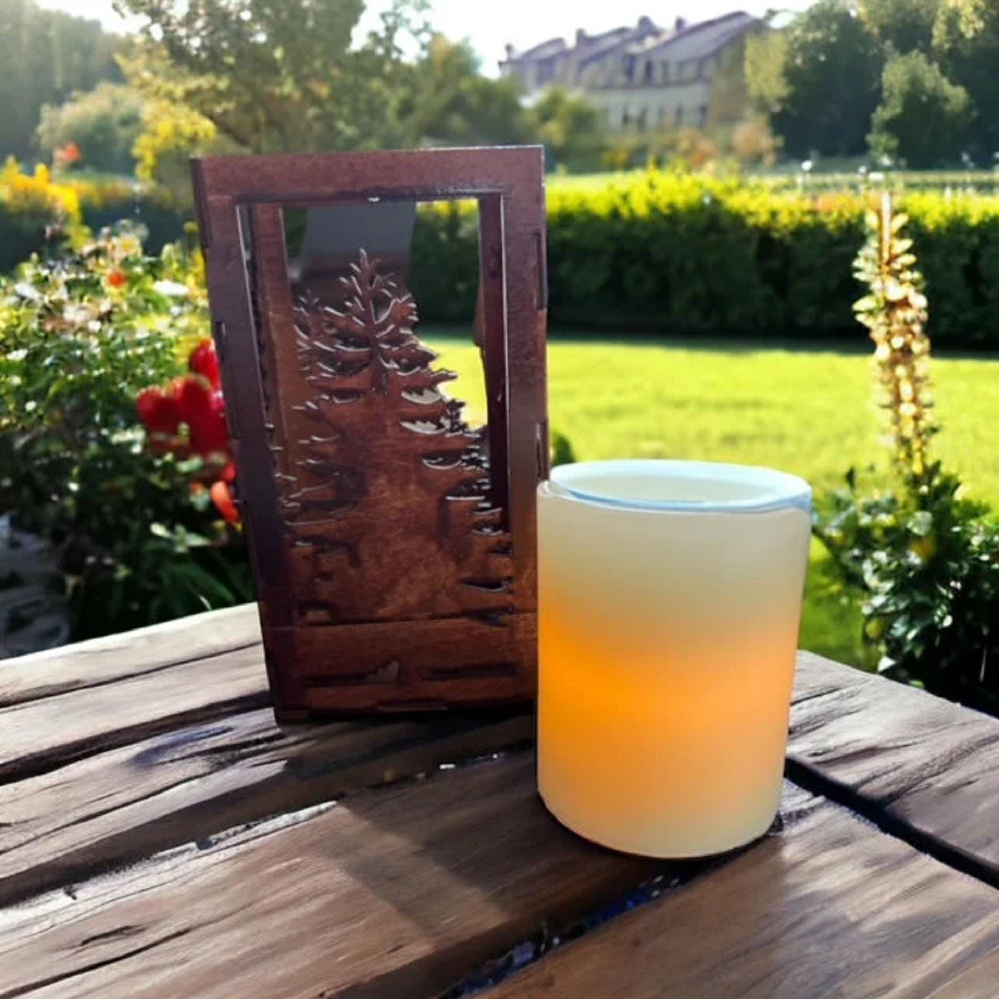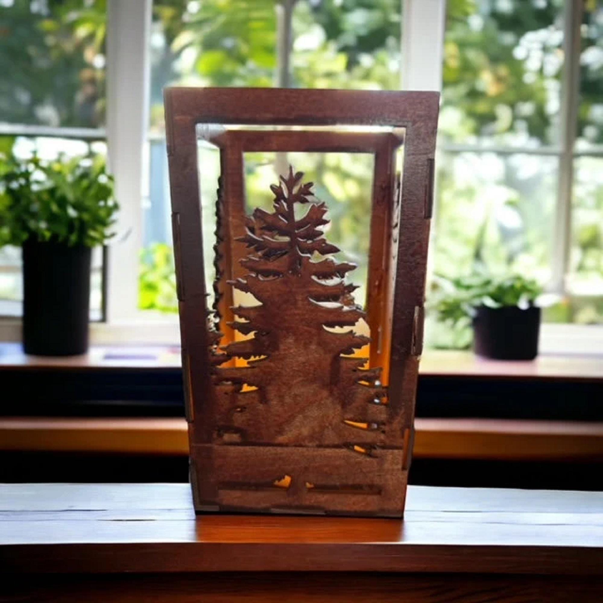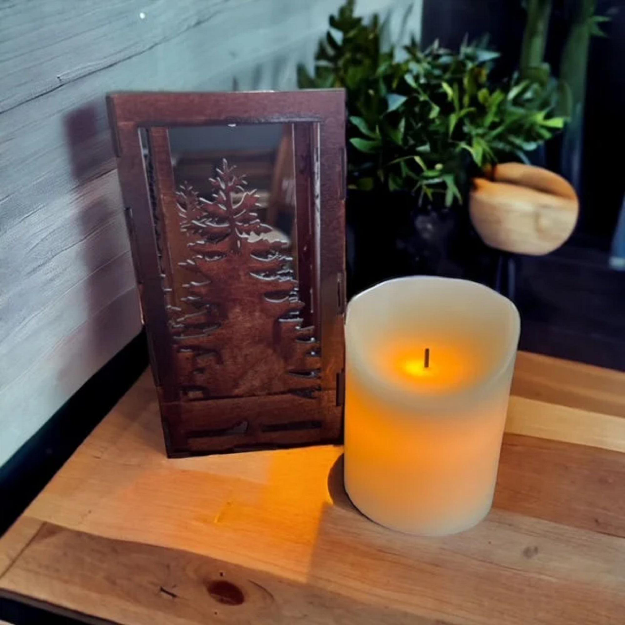 Laser Cut Wood Forest Lantern: Flameless Candle, Rustic Cabin Decor
