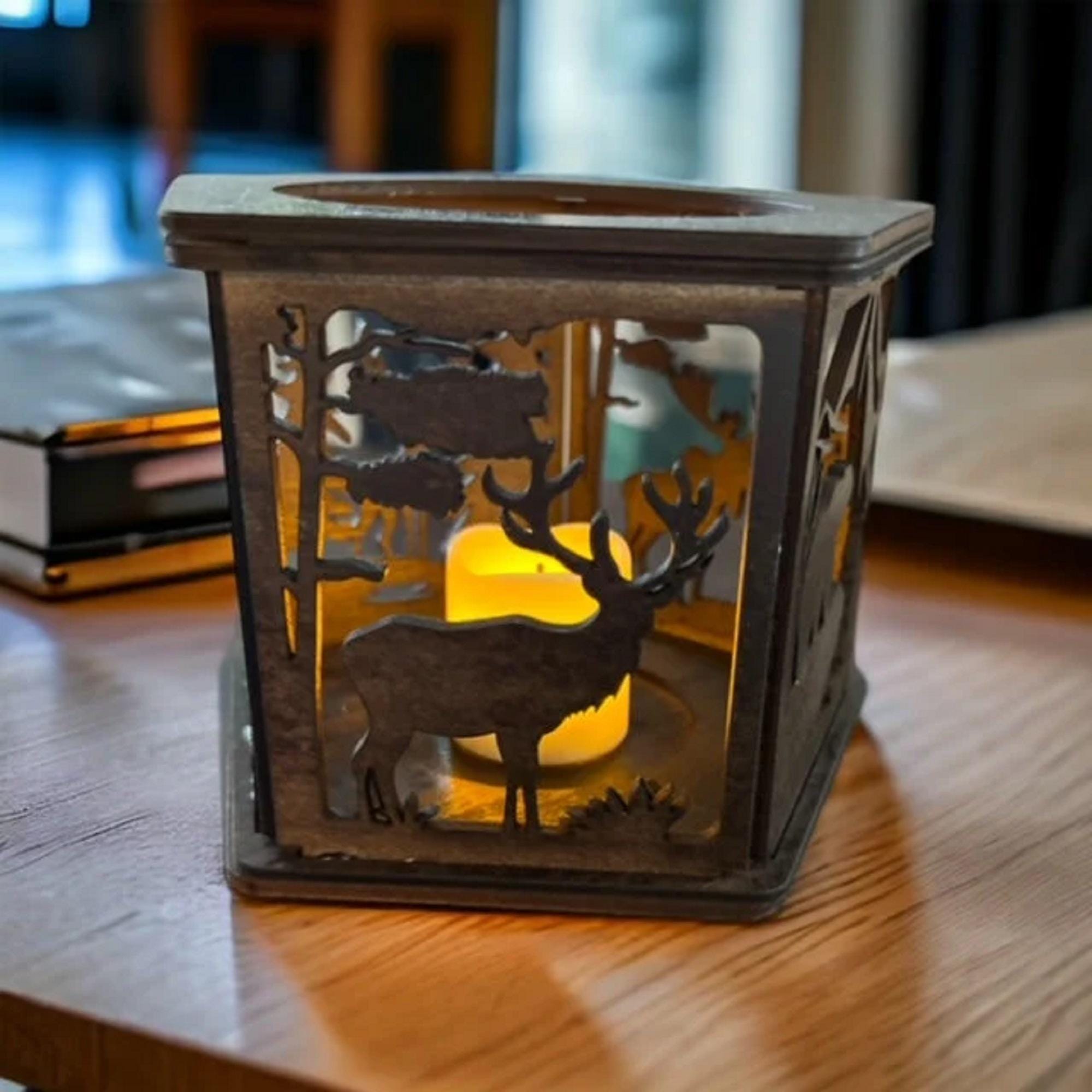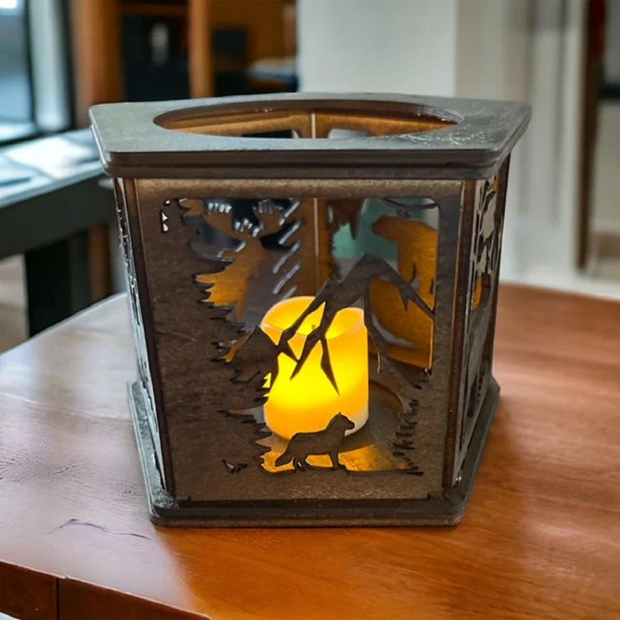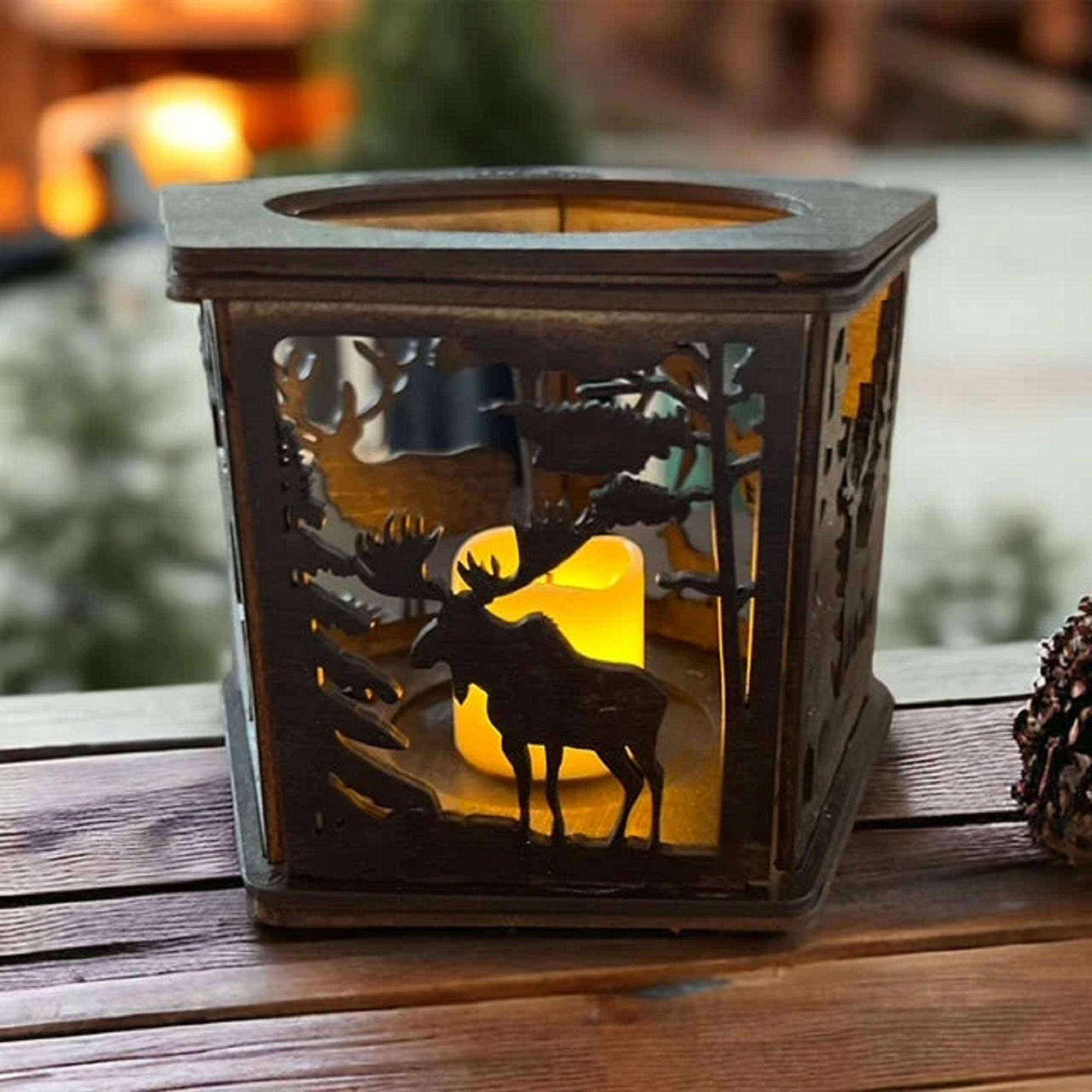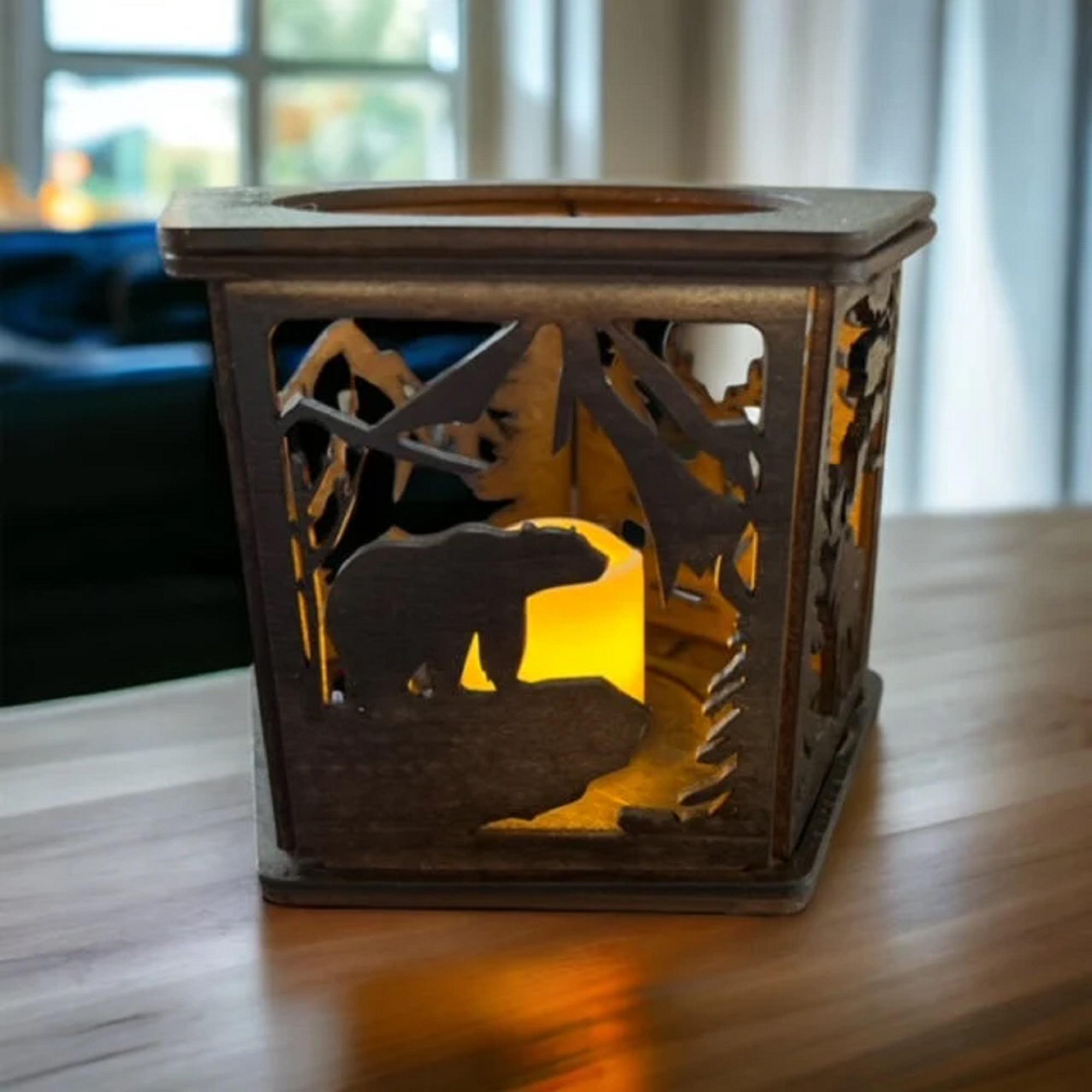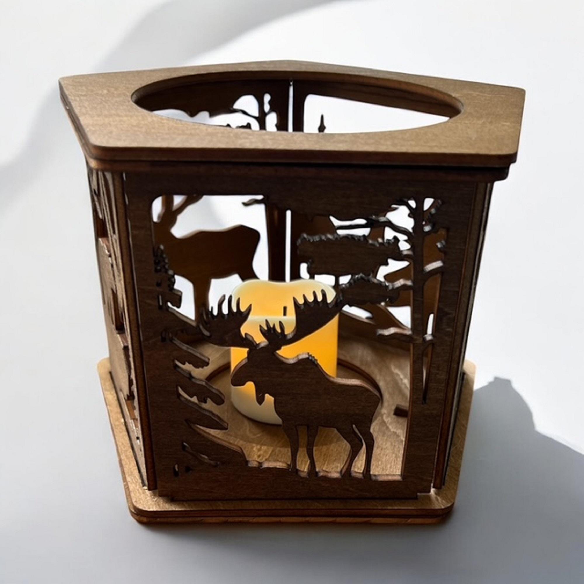 Handmade from 3mm basswood, this candle holder measures 4 1/4 inches tall and 5 1/2 inches in diameter, showcasing detailed wildlife motifs that bring the outdoors inside. The flickering LED light mimics real candlelight without the risks of open flames or soot, ideal for homes with children or pets. Battery operated and easy to clean, it provides hassle-free ambiance wherever placed.