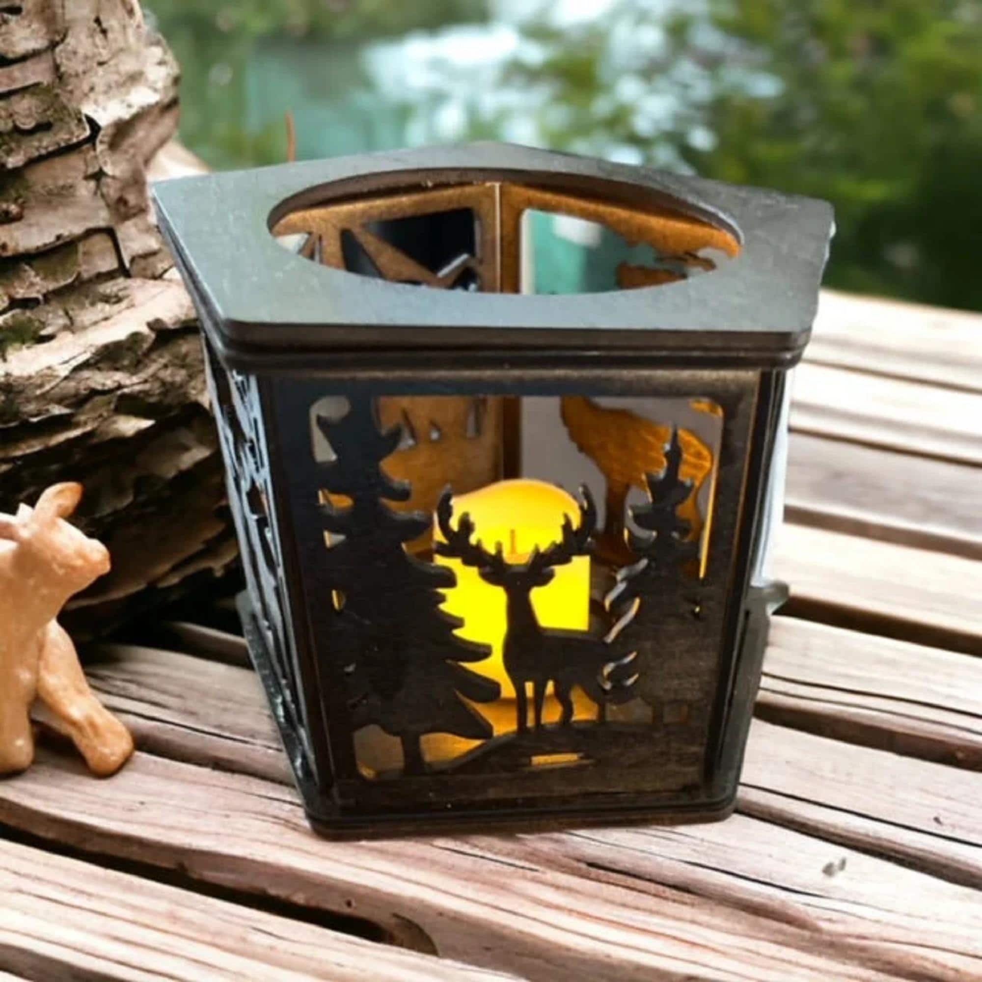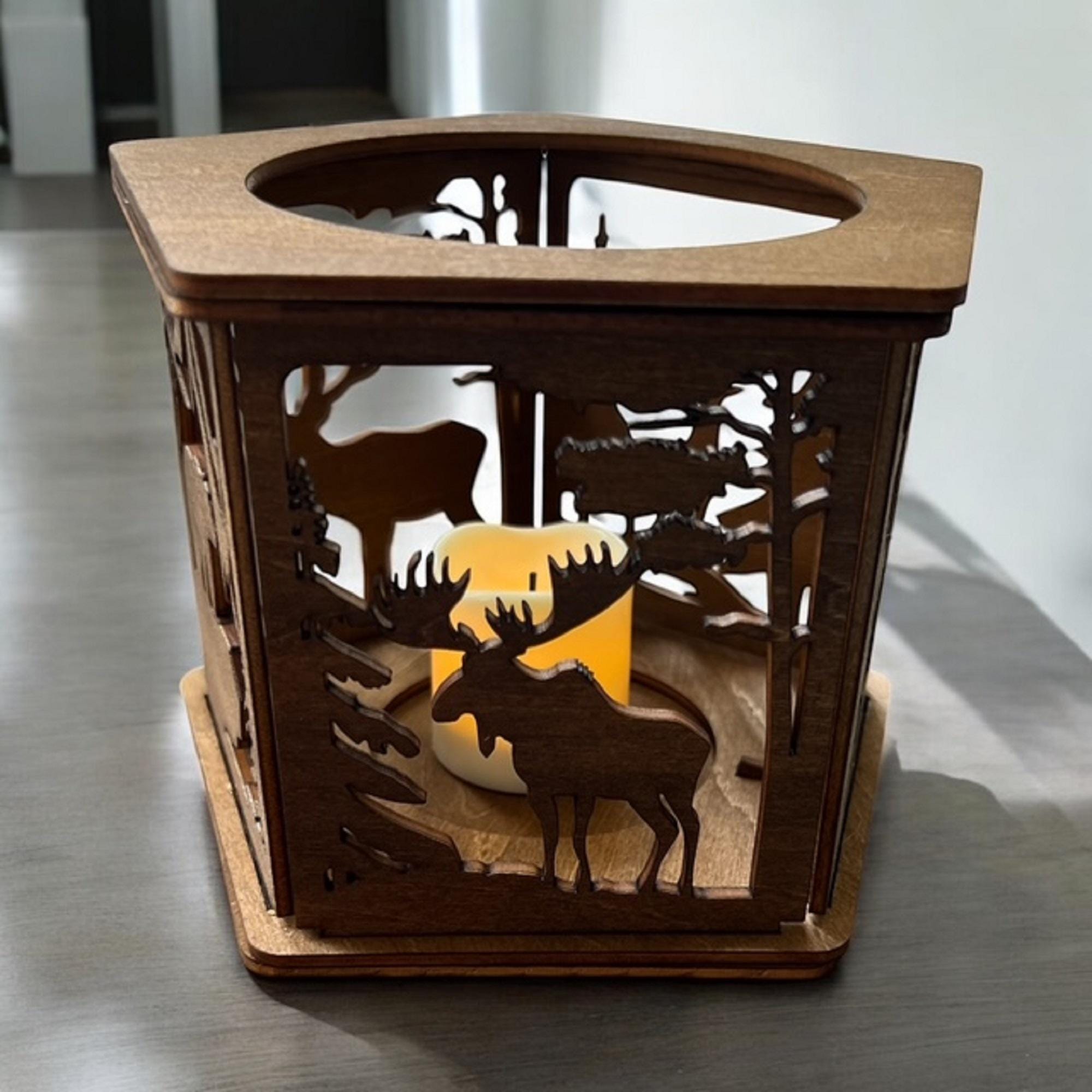 Imagine the warm, inviting glow casting gentle shadows on your patio or living room, creating a peaceful retreat inspired by nature. This candle holder makes a thoughtful gift for nature lovers and a lasting addition to your rustic décor collection. The animals include a bear, wolf, deer, moose, and elk. The stain in the pictures is dark walnut. You may choose your stain color. Please see image for available colors.