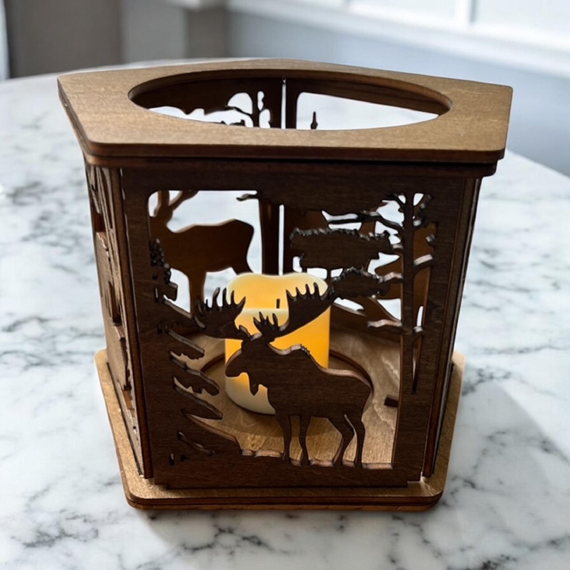 Laser Cut Wildlife Tea Light Holder: Basswood Animal Scene