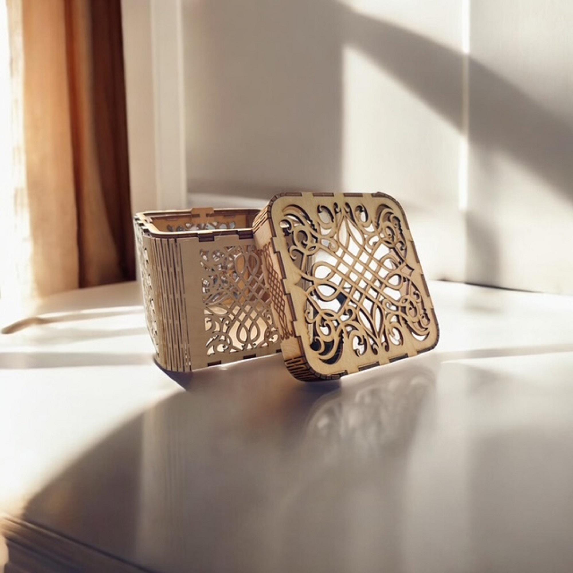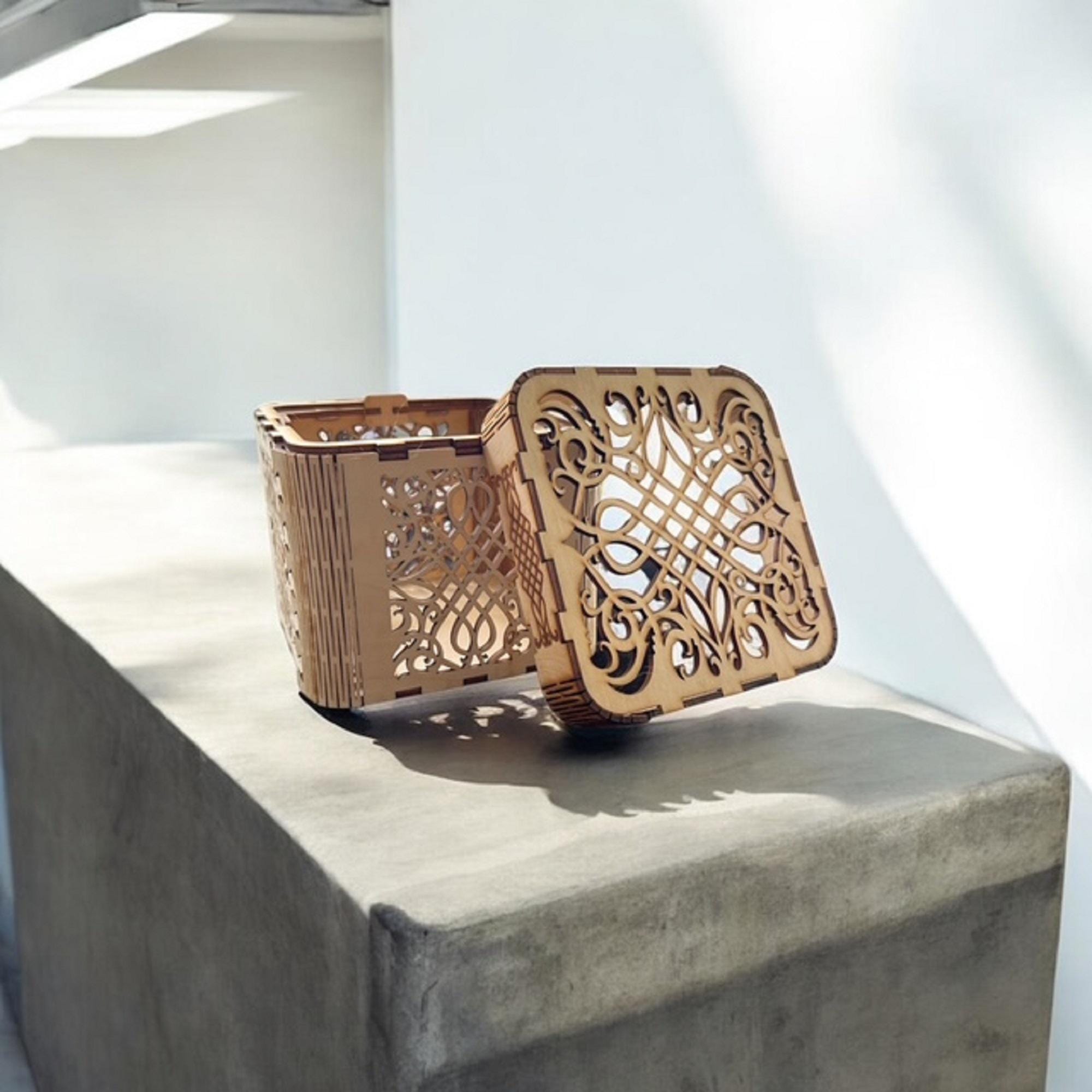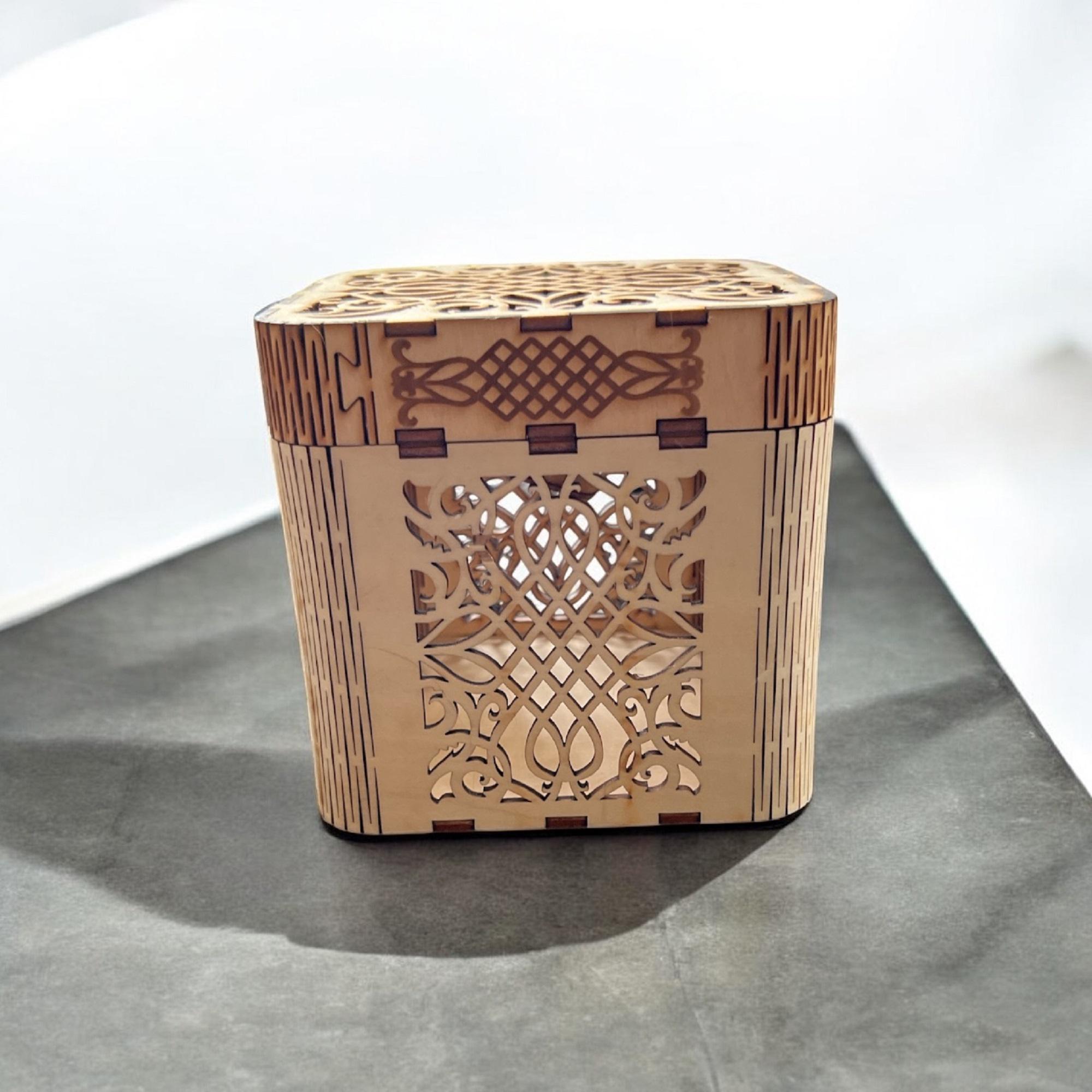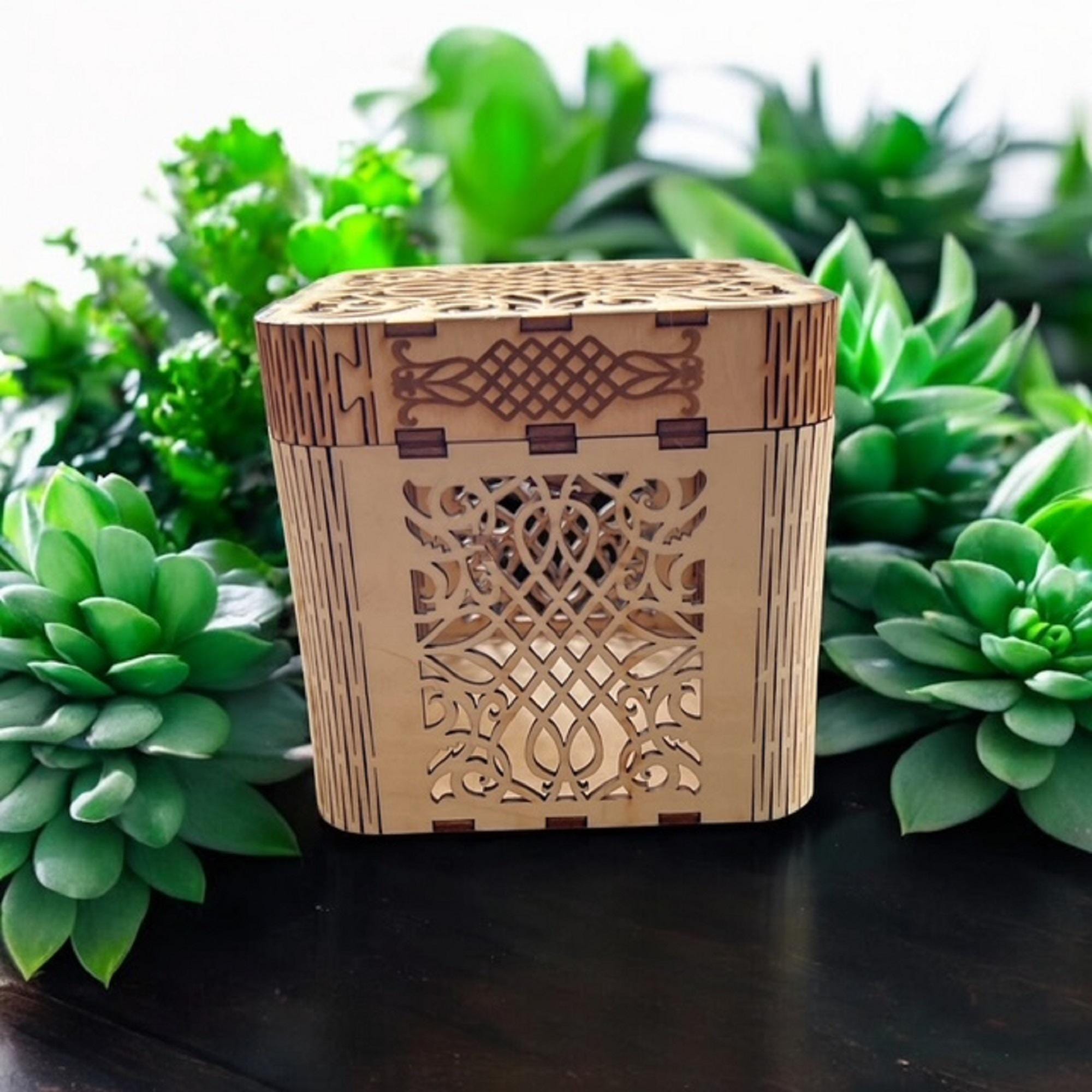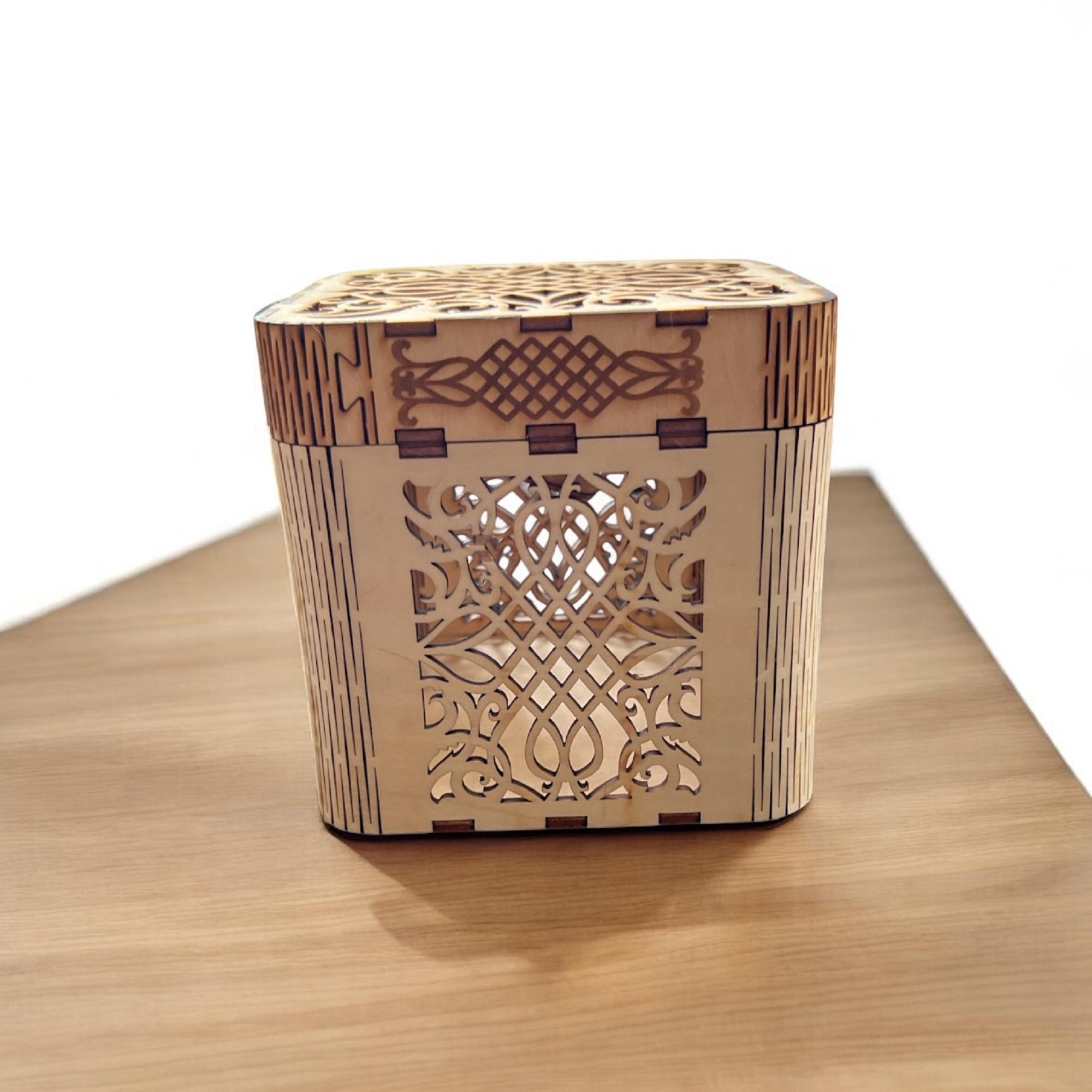 Laser Cut Wooden Cube Box: Rustic Keepsake Storage, Customizable Design