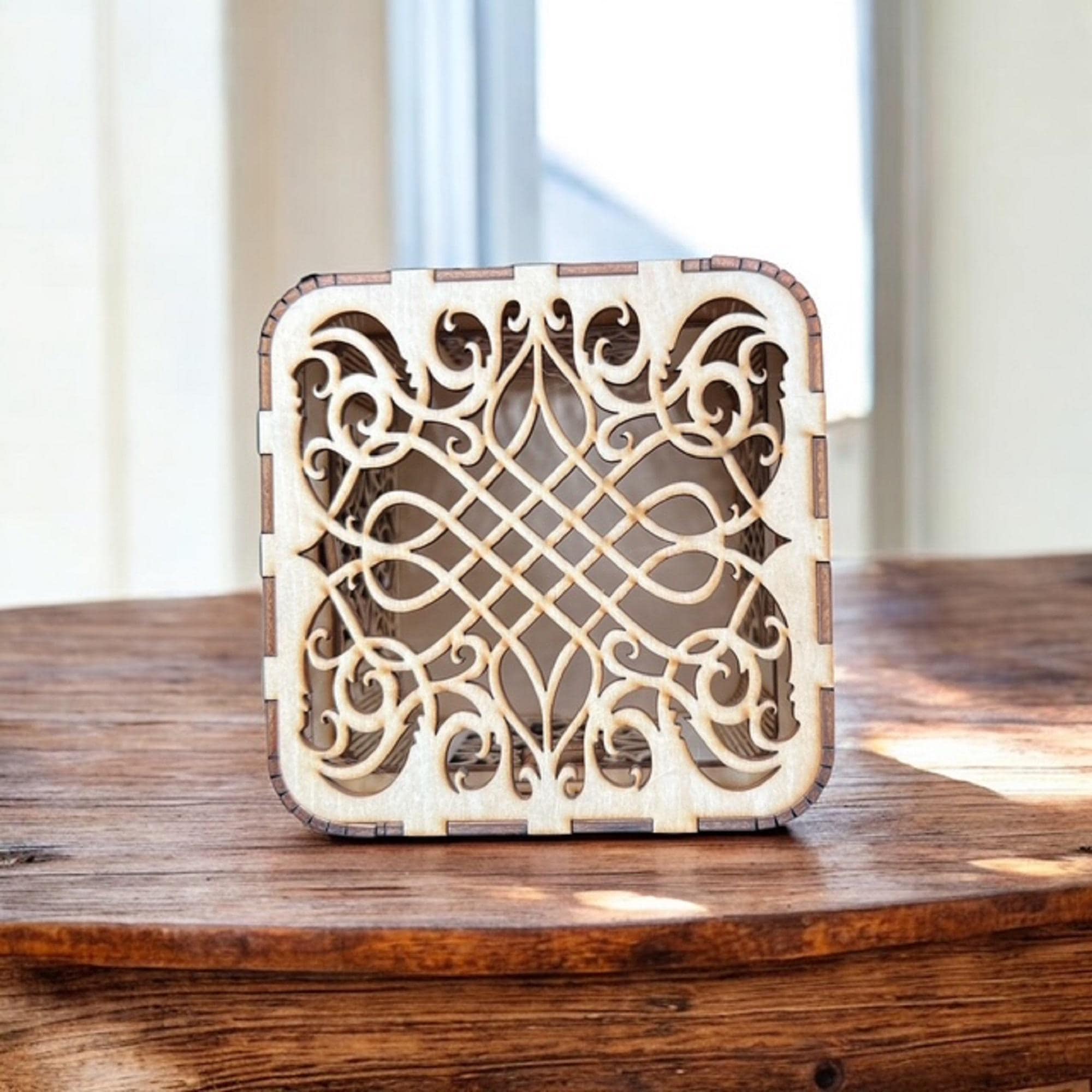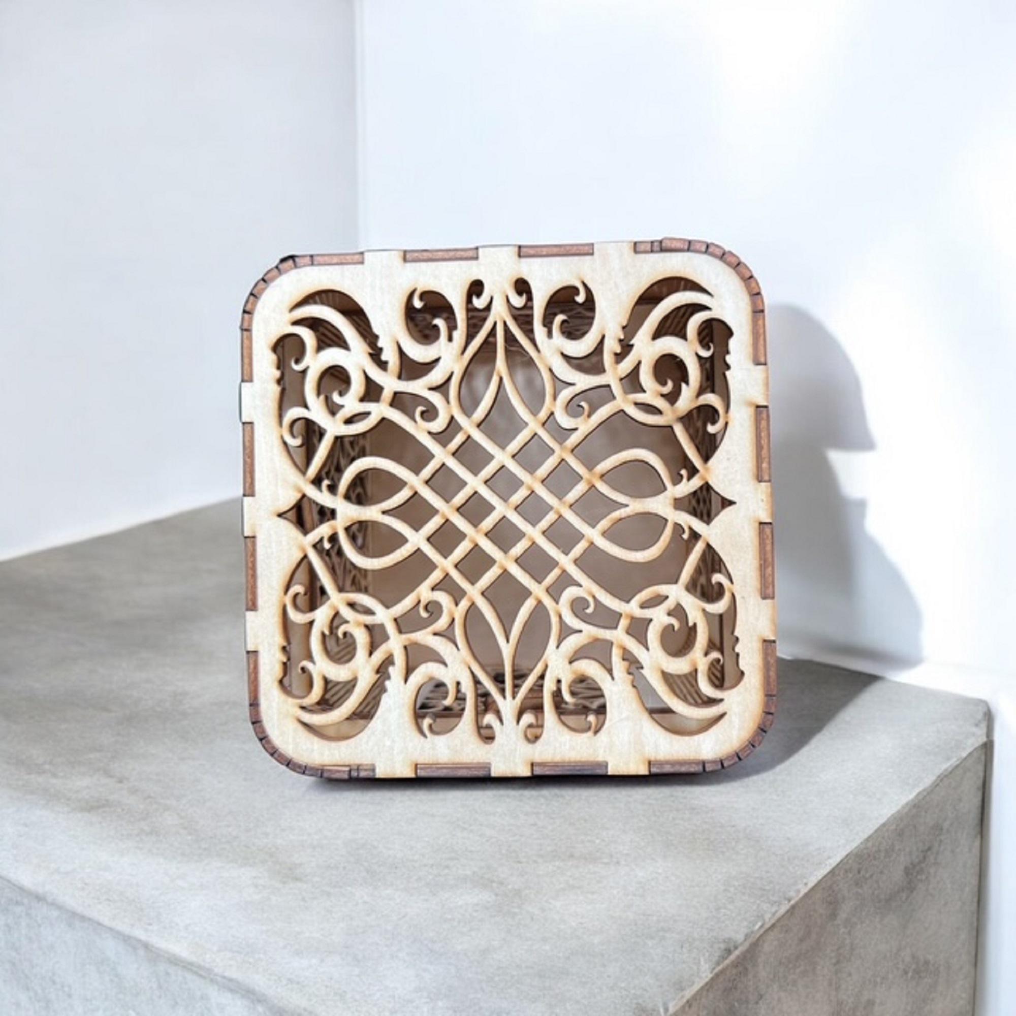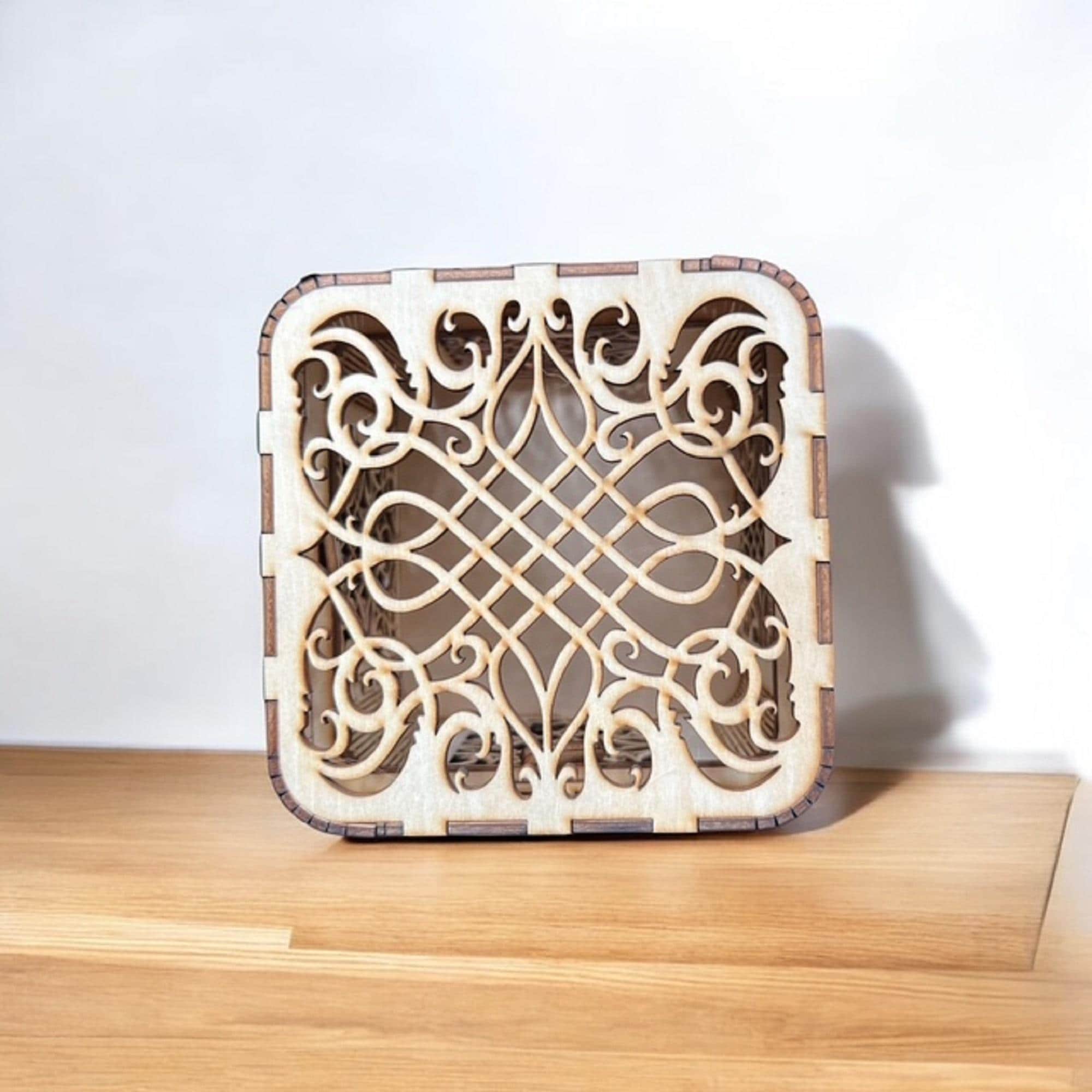Crafted from 3mm basswood, each box measures approximately 4 1/2 in x 4 1/2 in x 4 1/2 in. , providing ample space for small treasured items or office essentials. The intricate laser-cut patterns showcase skilled artisan work, while the smooth finish ensures it feels warm and sturdy in your hands. This box is perfect for those seeking a meaningful storage solution that complements any home décor style without sacrificing durability.