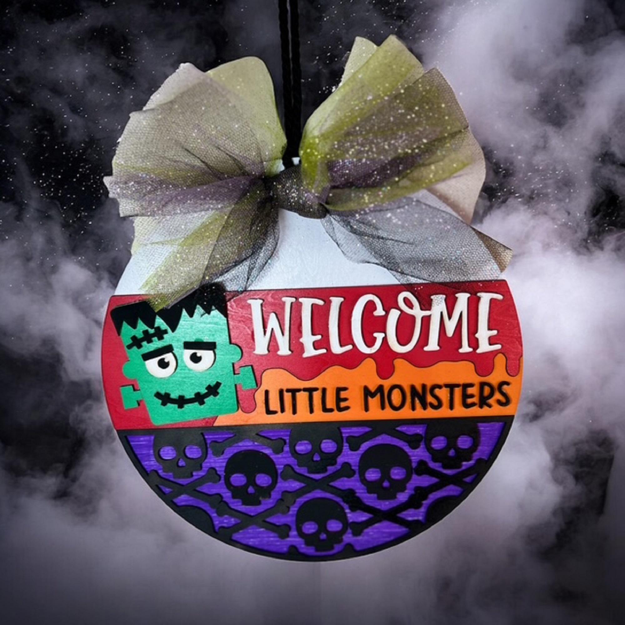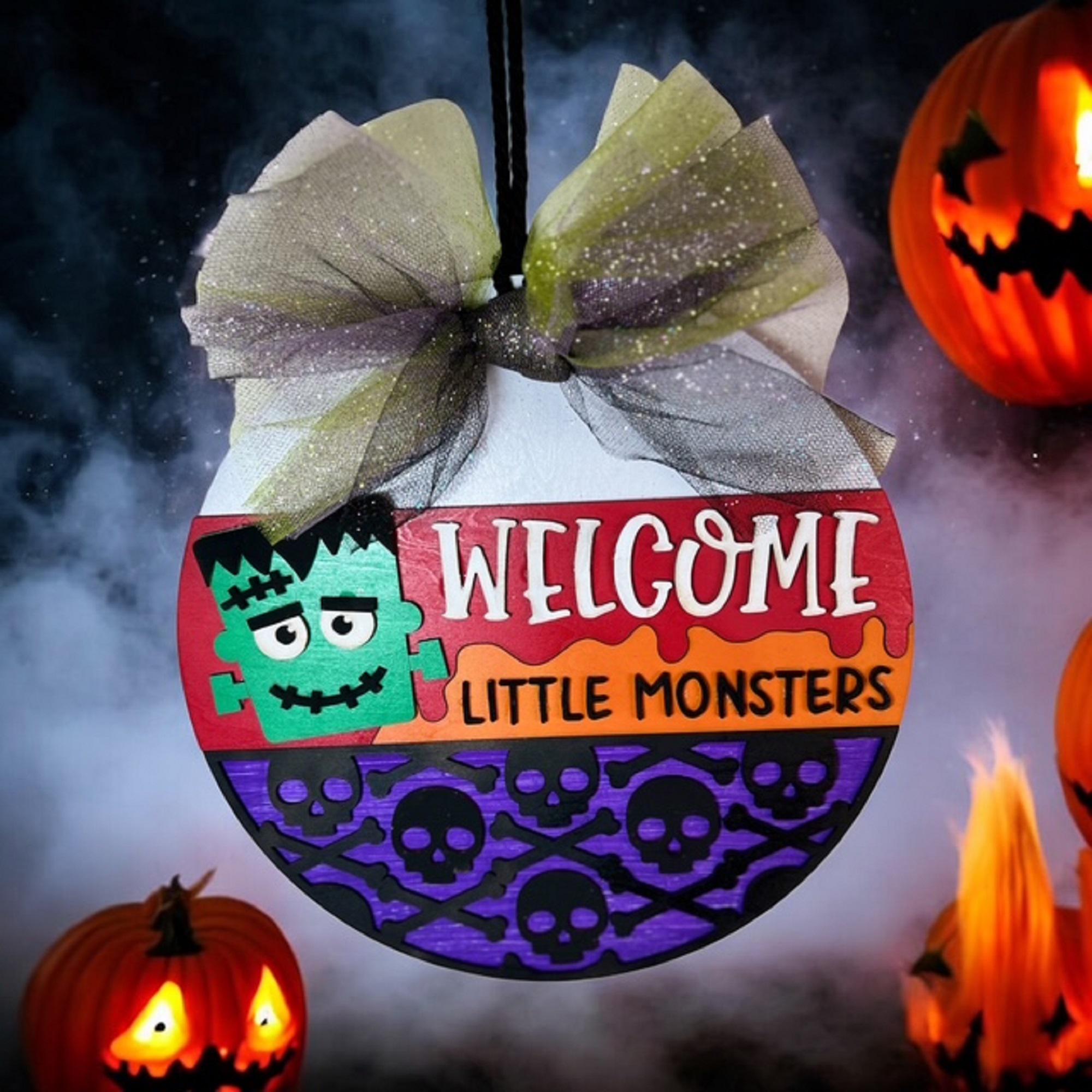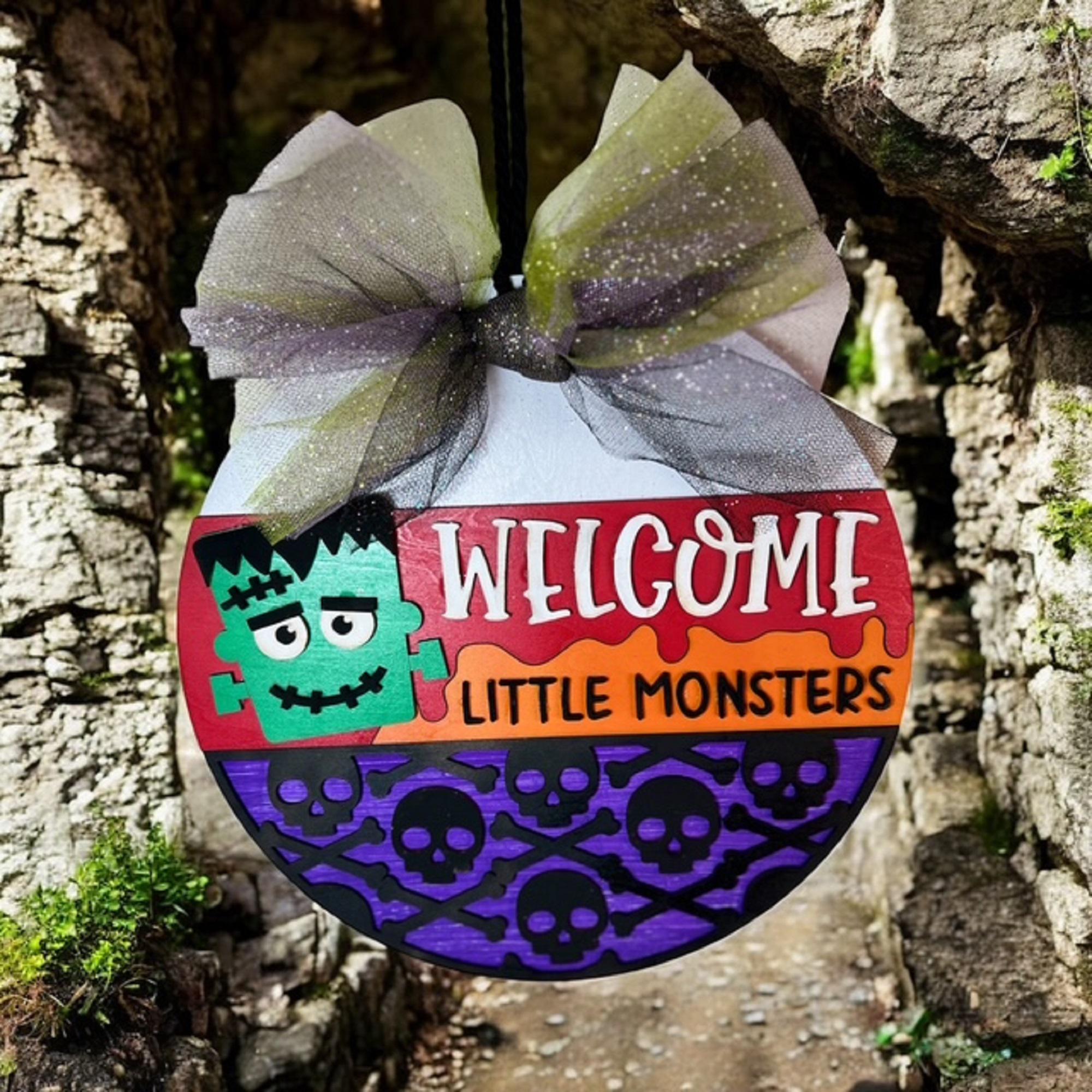 Welcome guests with our charming Little Monsters door hanger, a playful addition to your Halloween decor that doubles as a fun trick or treat sign. Crafted with care, this unique door hanger stands out by combining festive spirit with whimsical monster designs that delight both kids and adults alike.