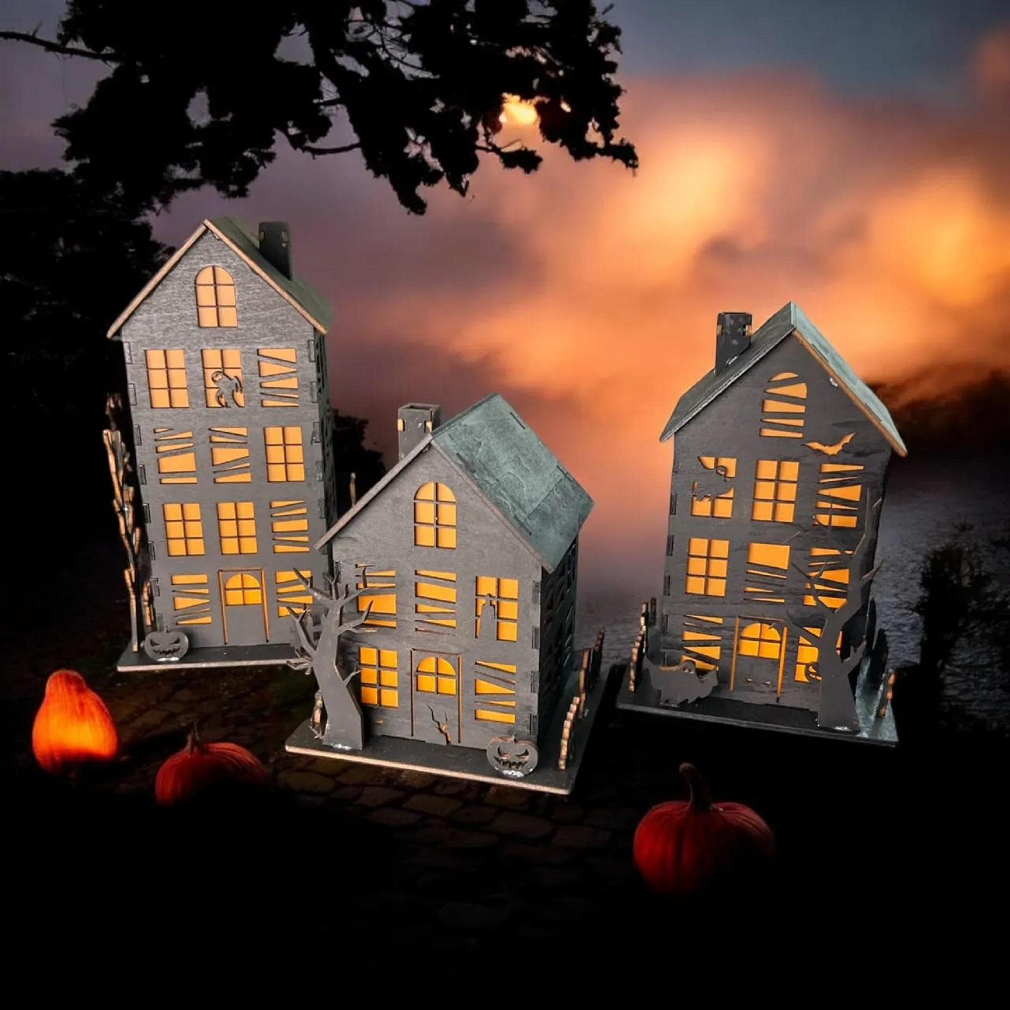 Each tea light features intricately designed haunted house silhouettes, made from 3mm basswood and comes in three sizes. The set includes flameless, battery-operated candles for safe, long-lasting use without the worry of open flames. Enjoy easy operation with included batteries and simple on/off switches, ideal for quick setup and reuse year after year.