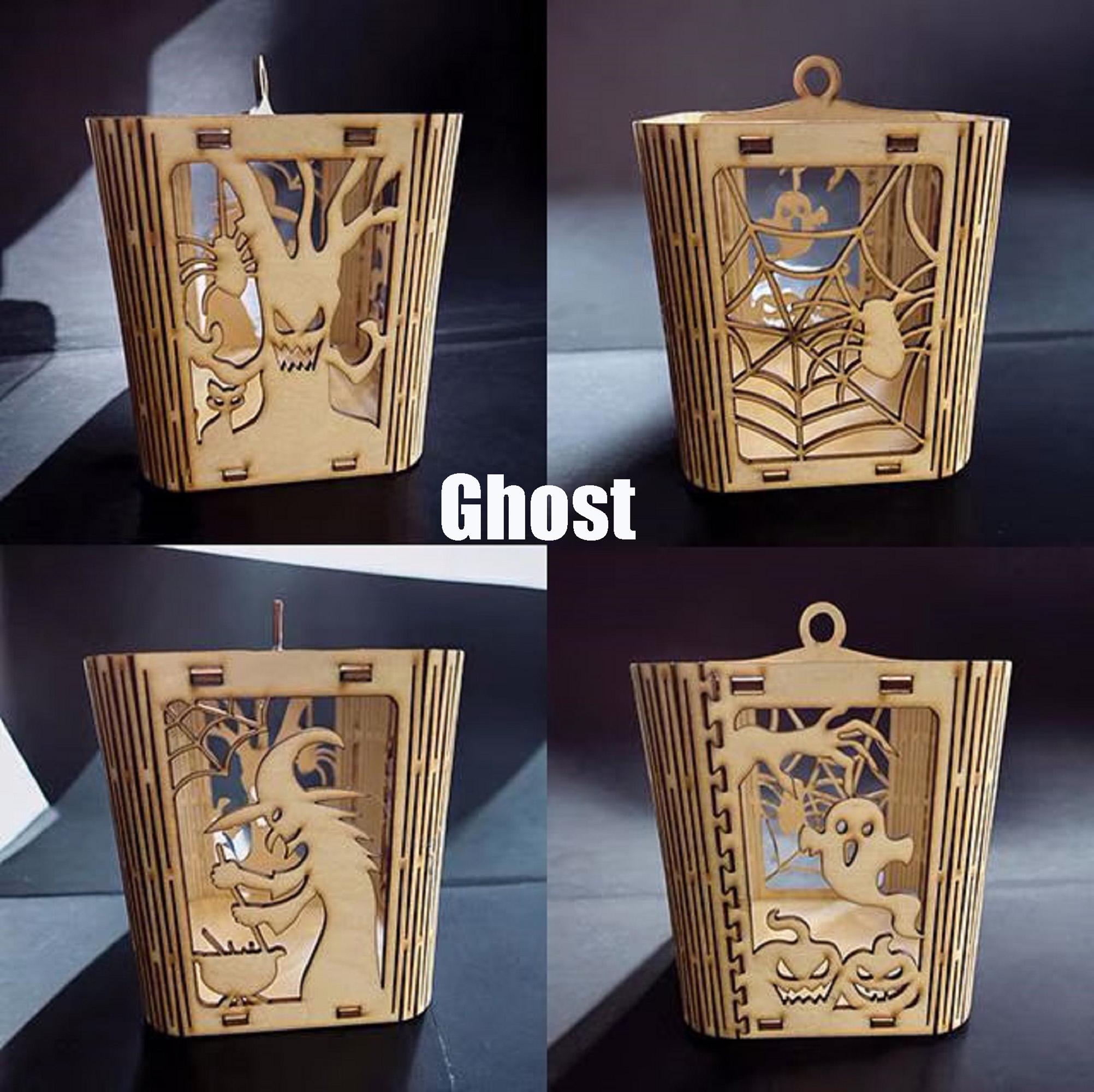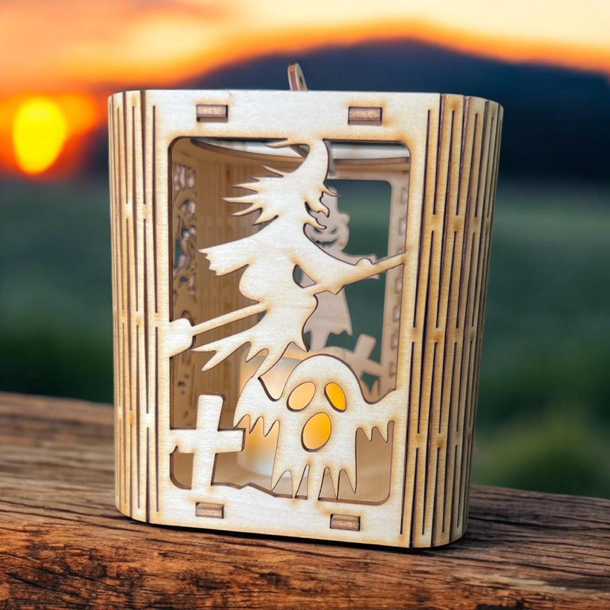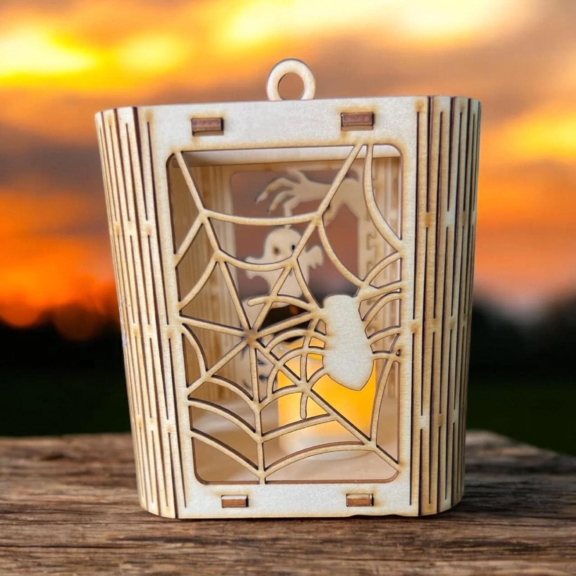 Laser Cut Basswood Halloween Tea Light Holder: Ghost, Witch, Spider