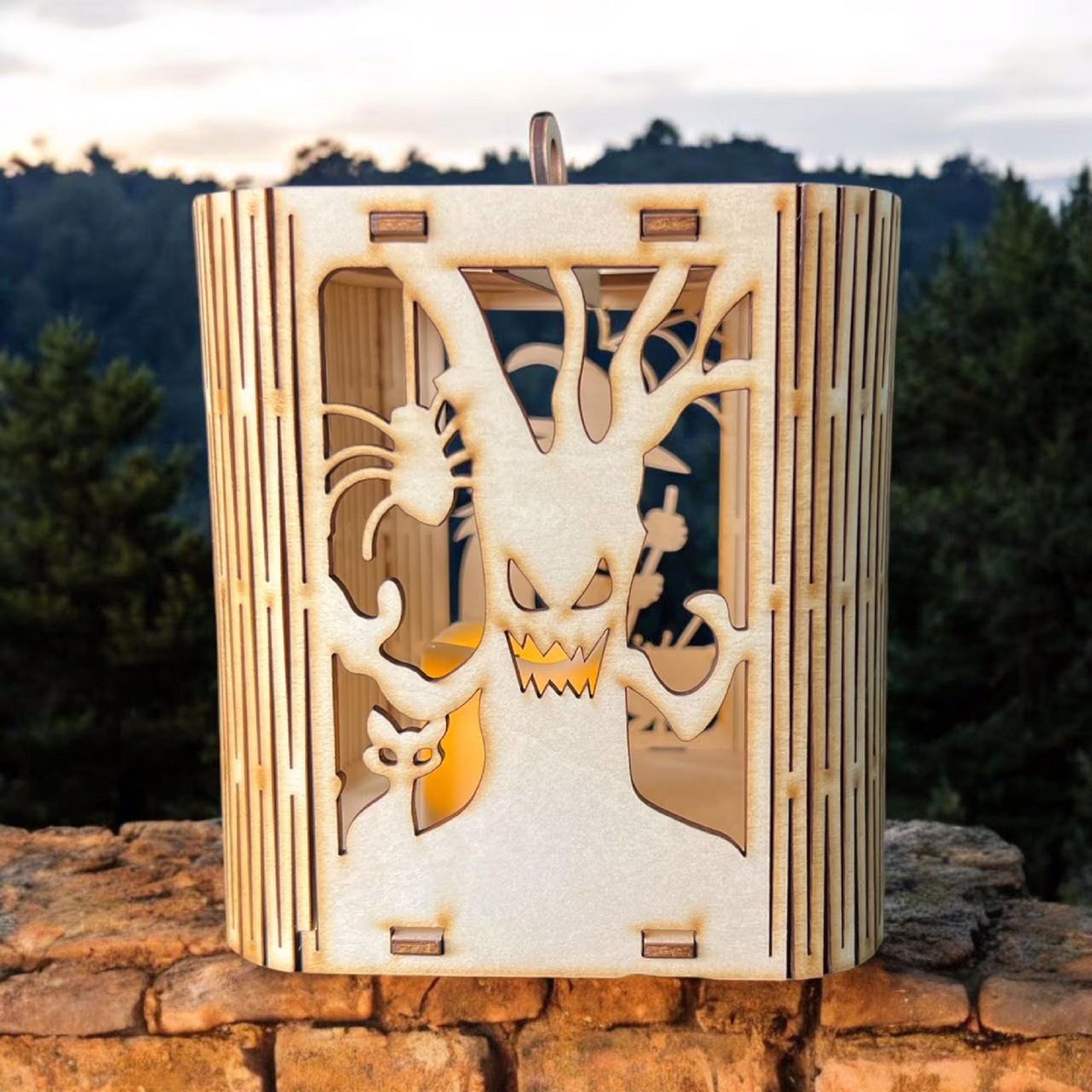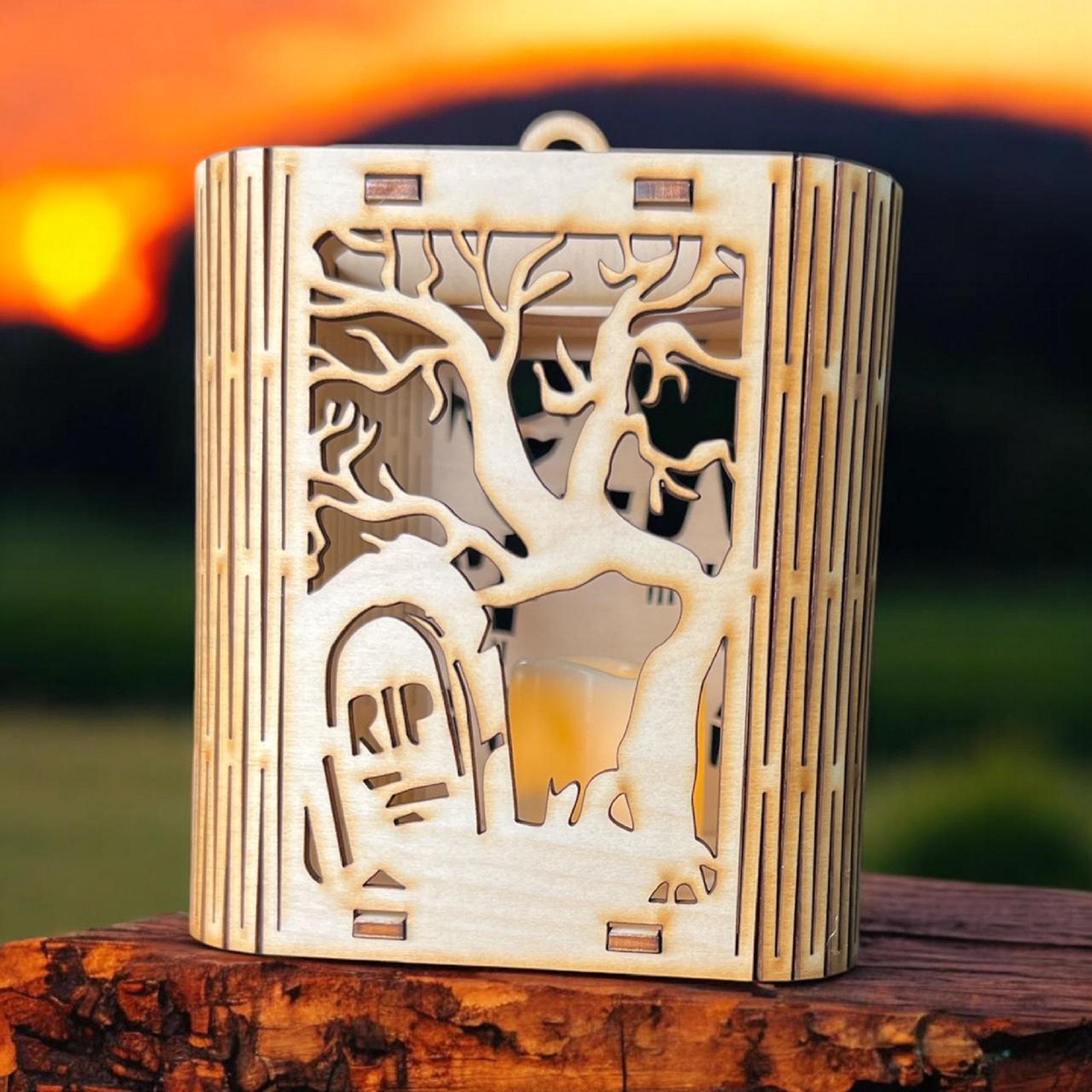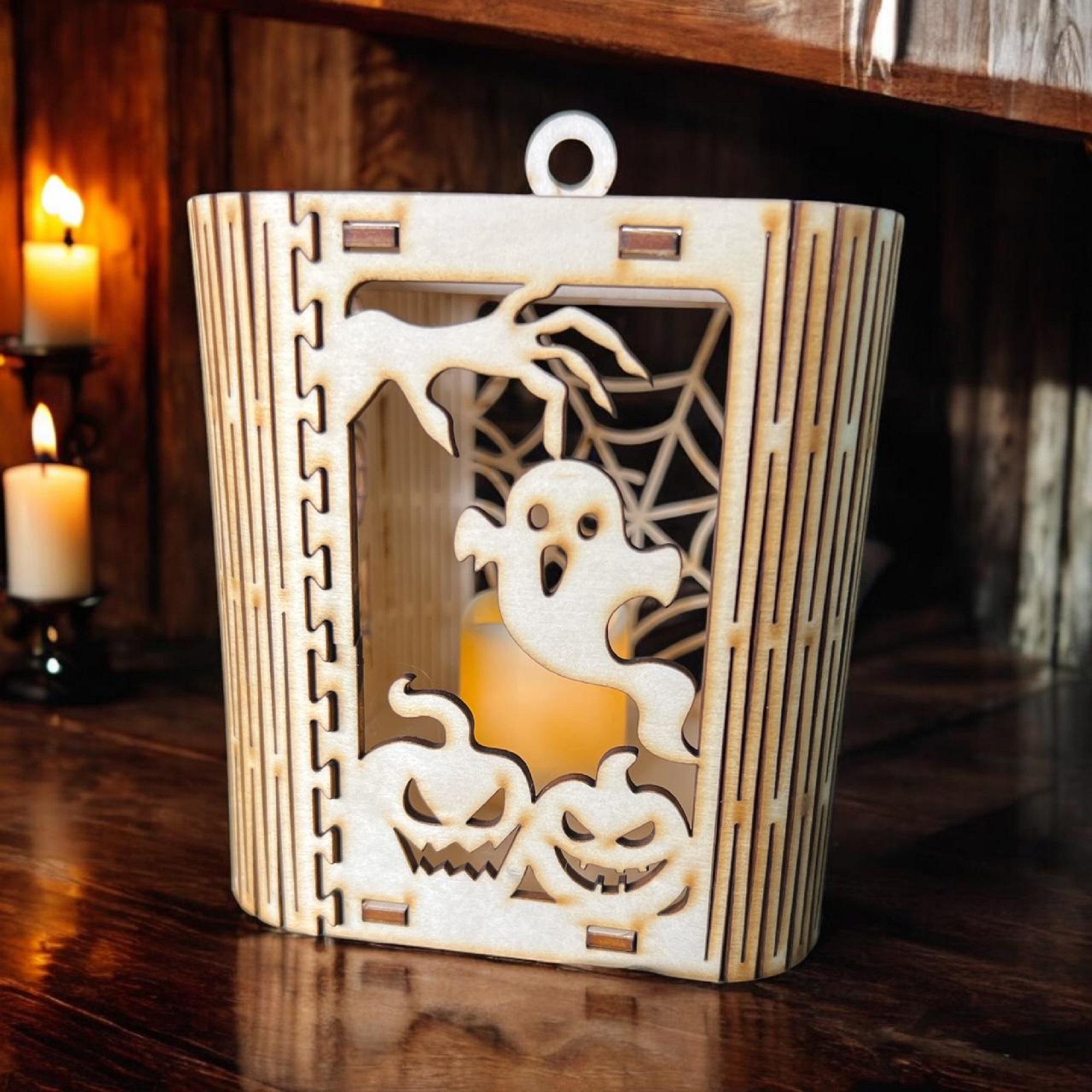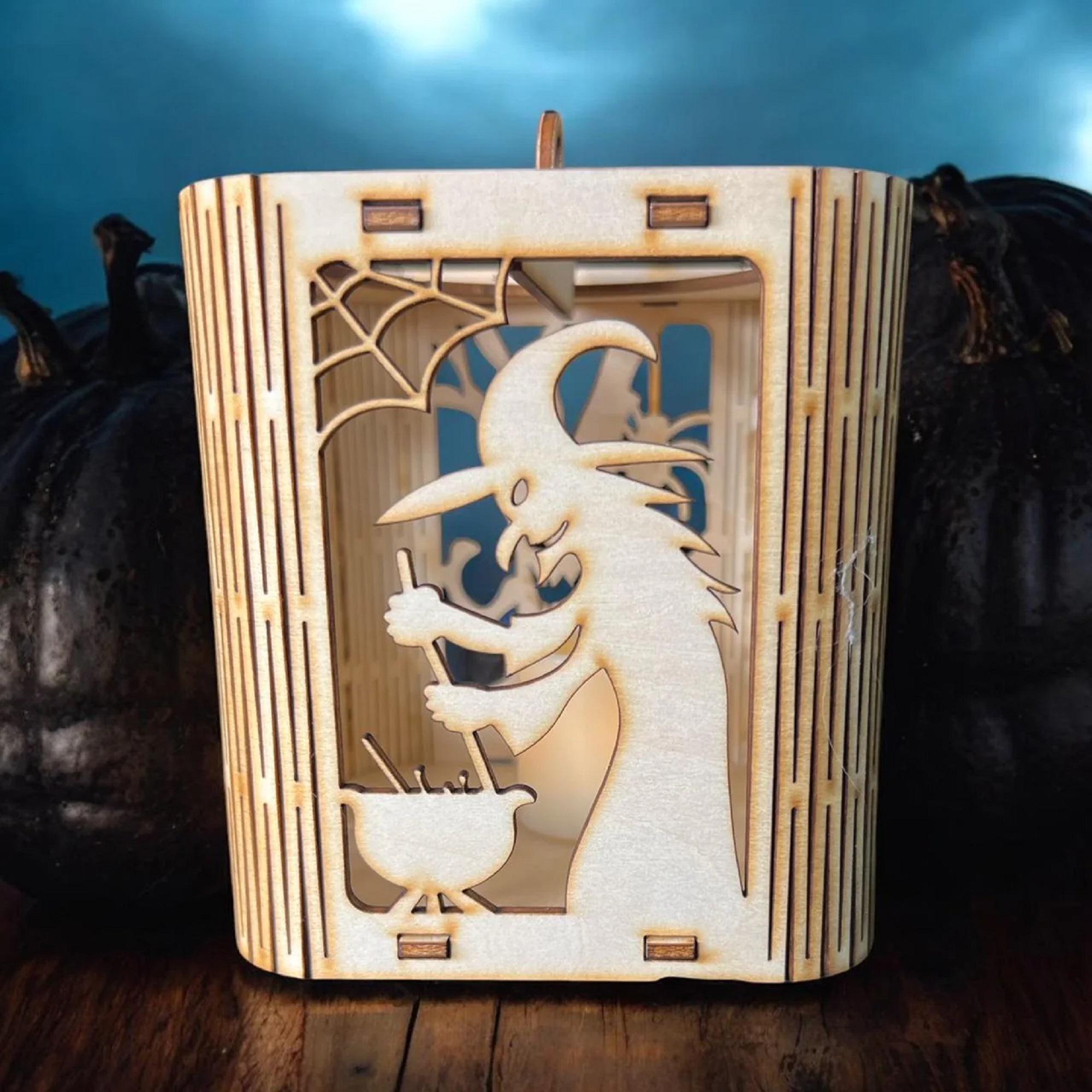 Laser Cut Basswood Halloween Tea Light Holder: Ghost, Witch, Spider