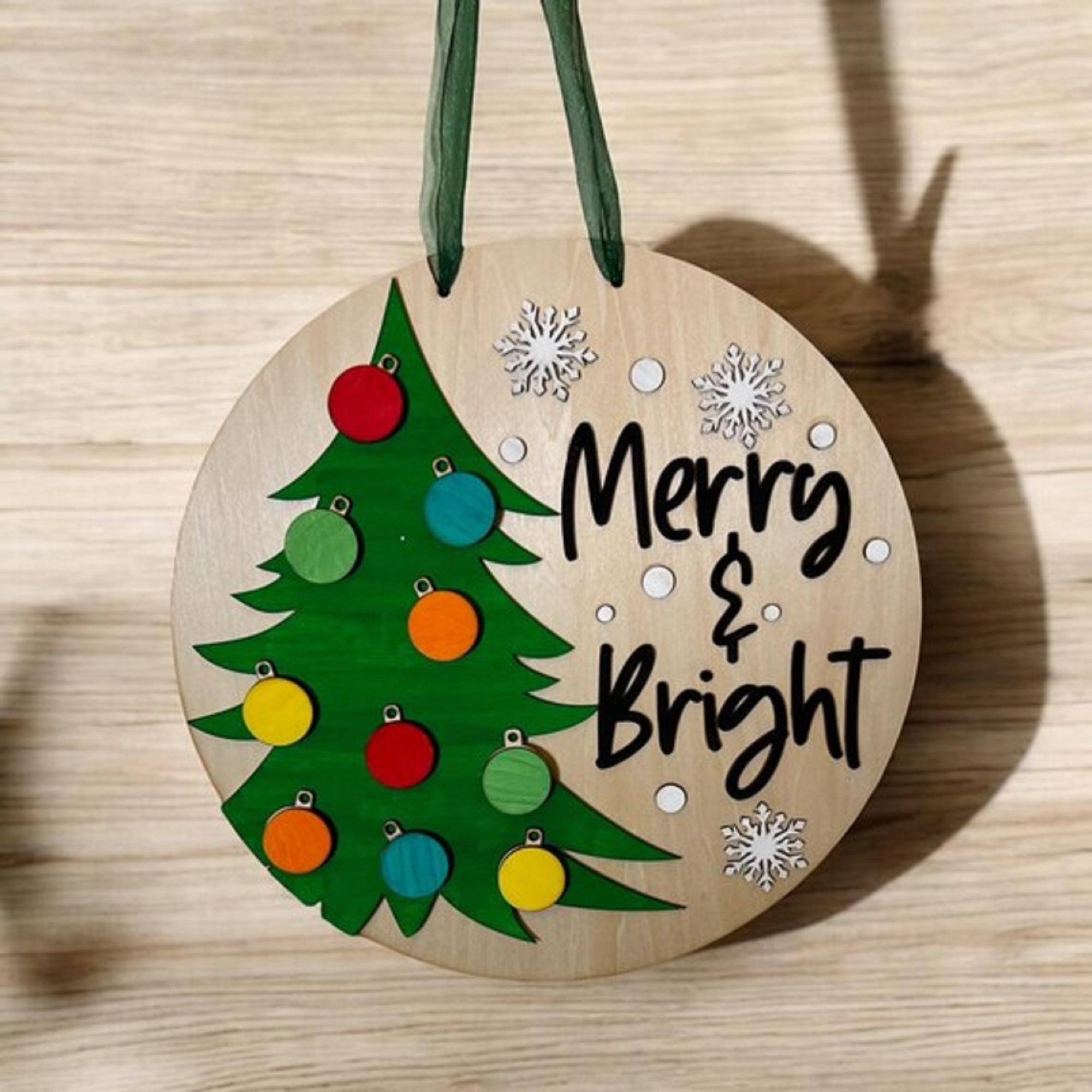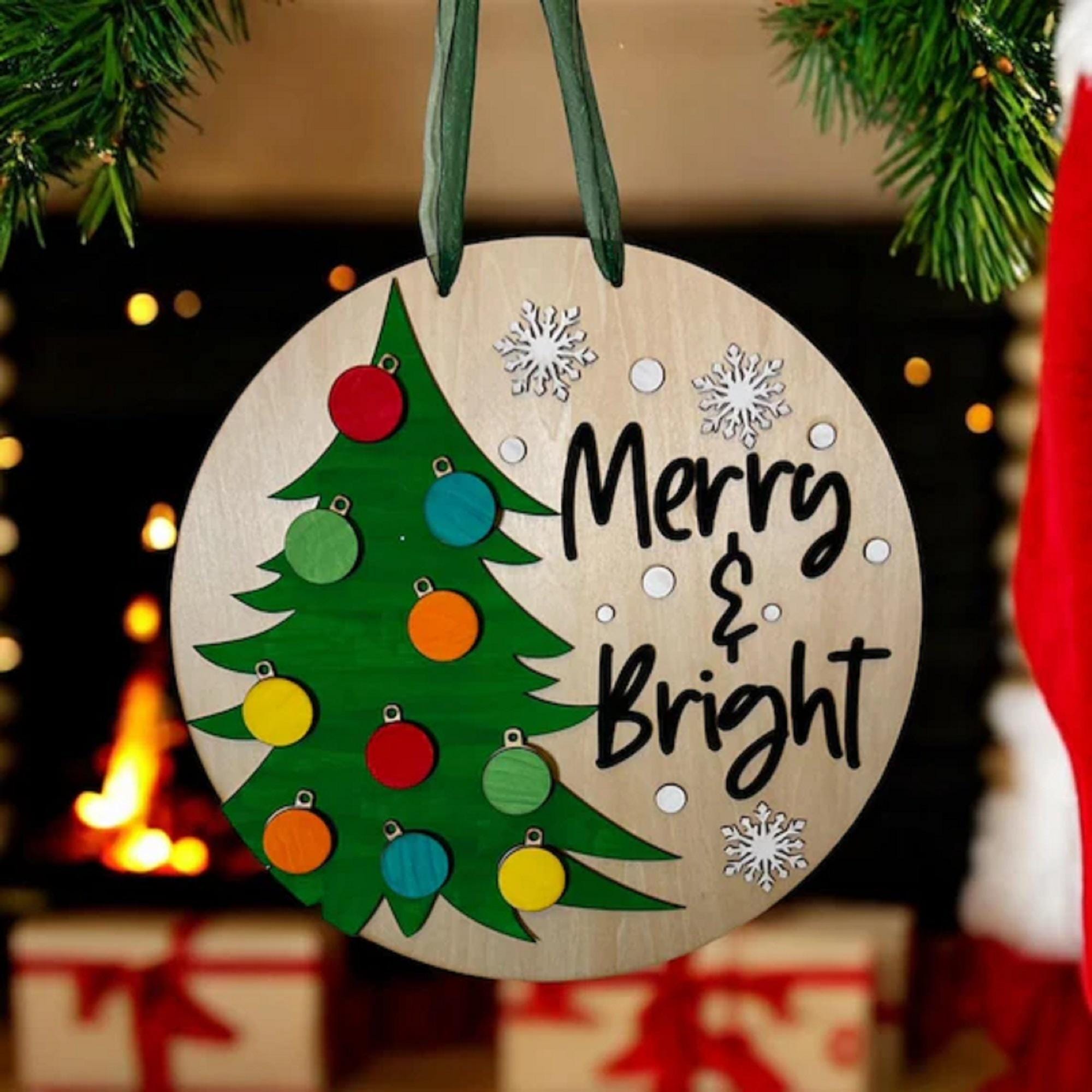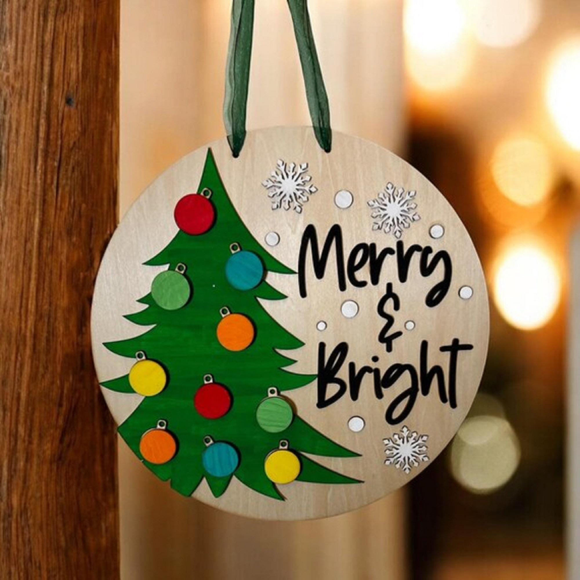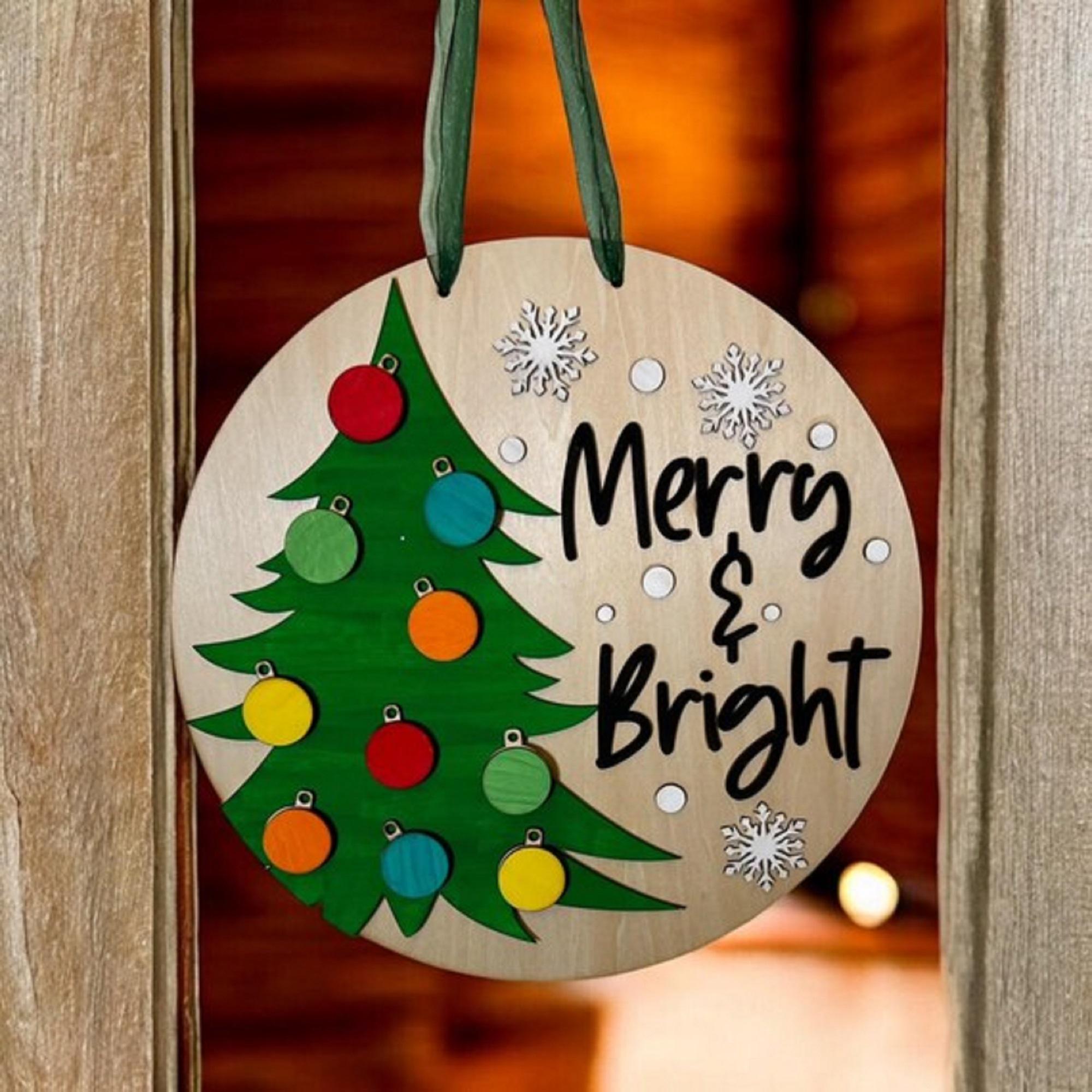 Merry and Bright Christmas Tree Door Hanger: Hand-Painted Basswood