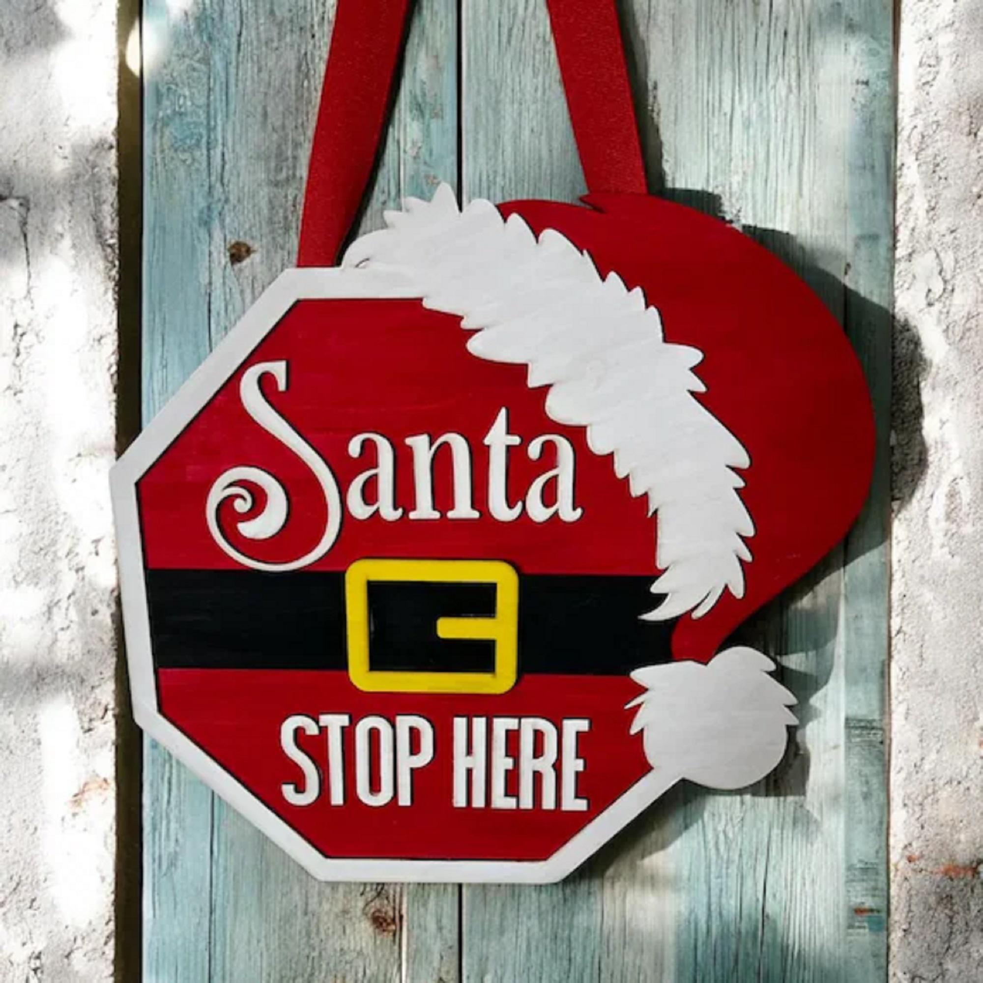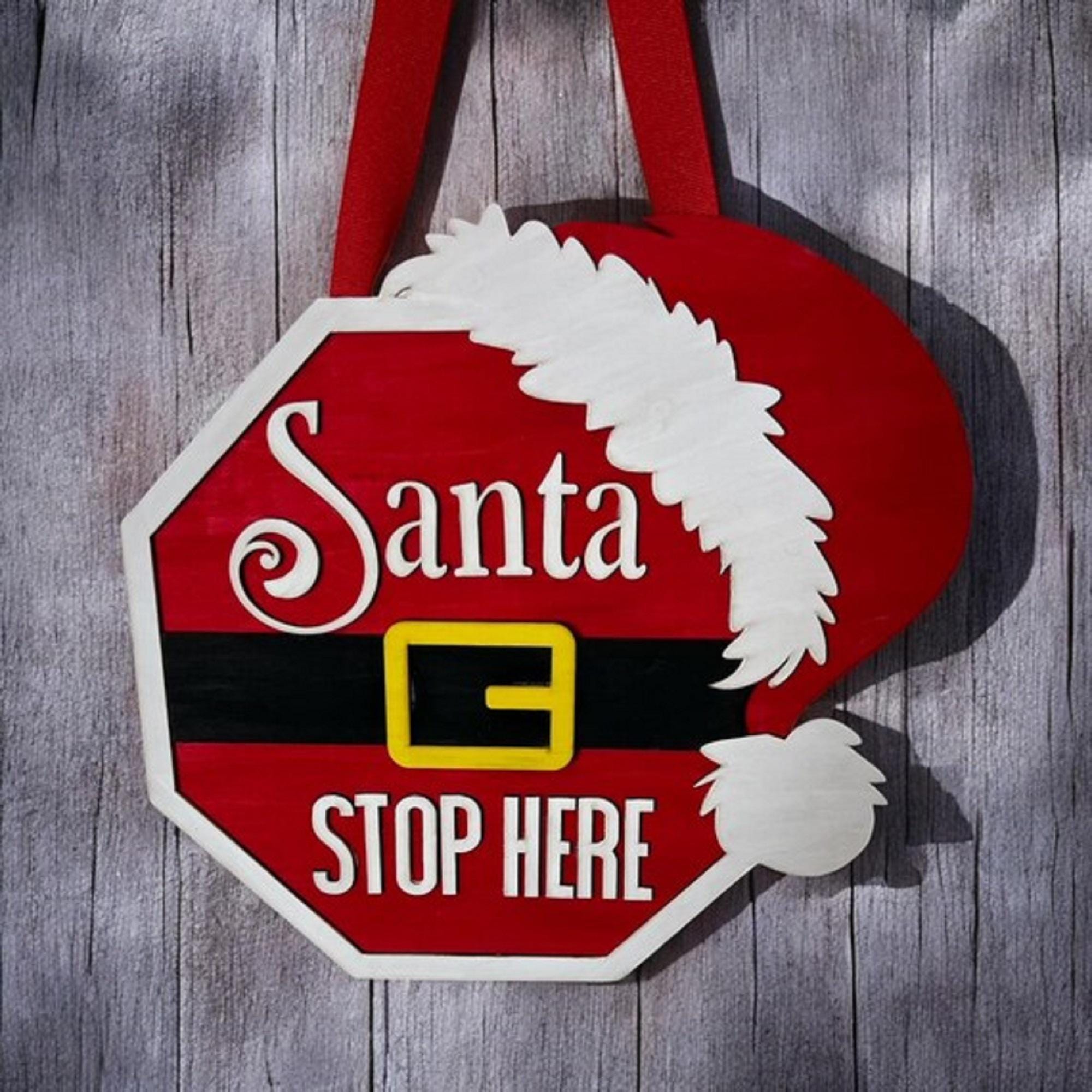Hand Painted Santa Stop Here Door Hanger: Laser Cut Basswood
