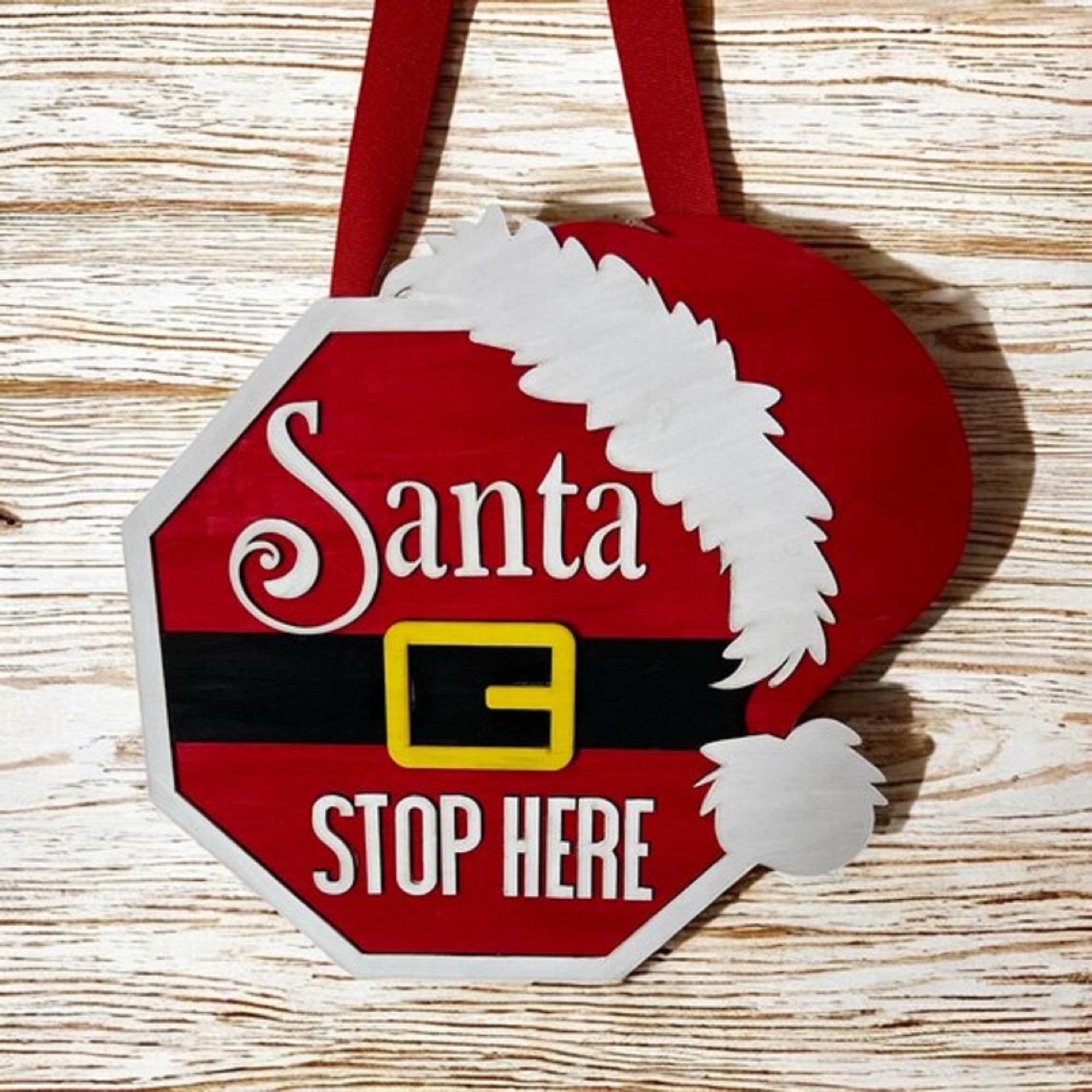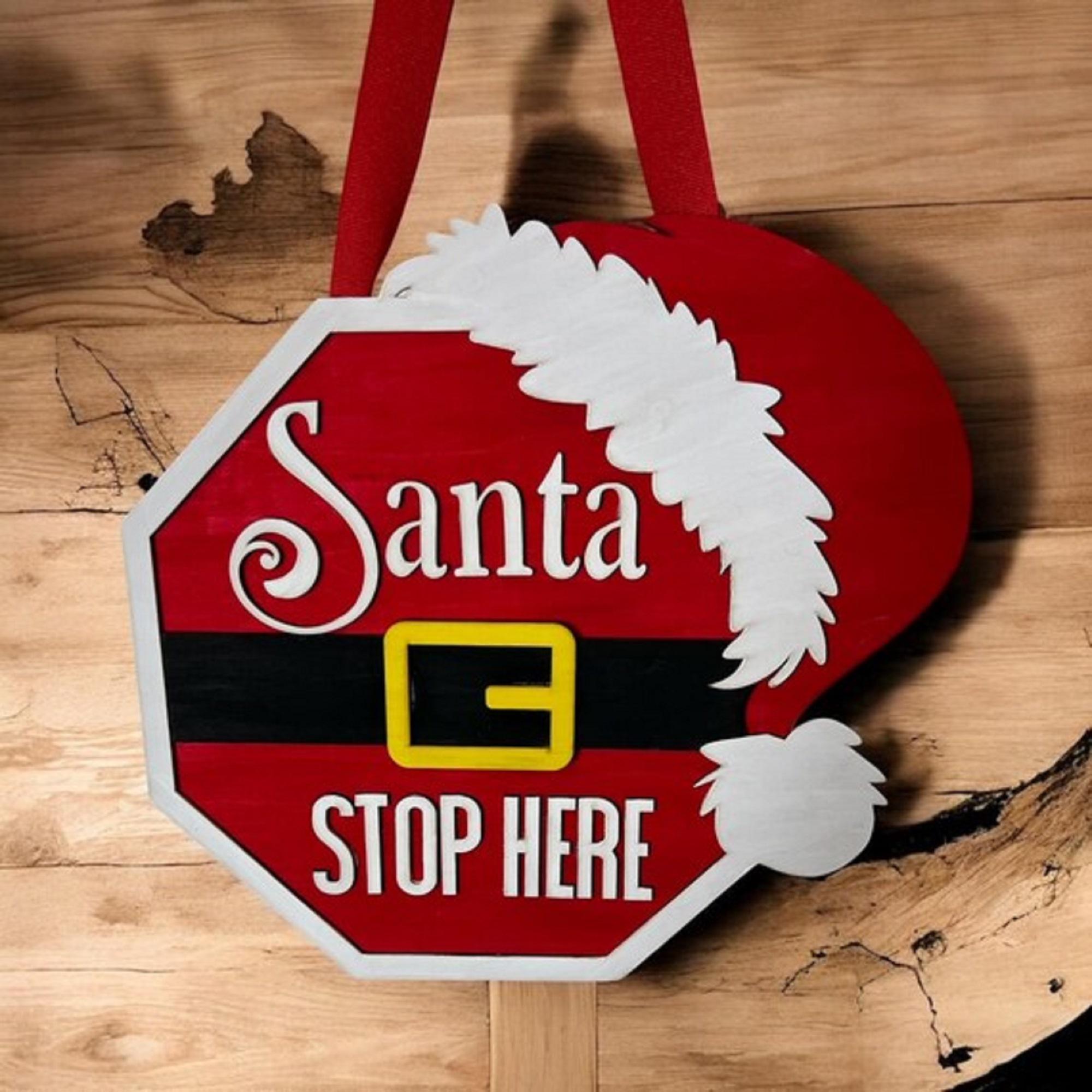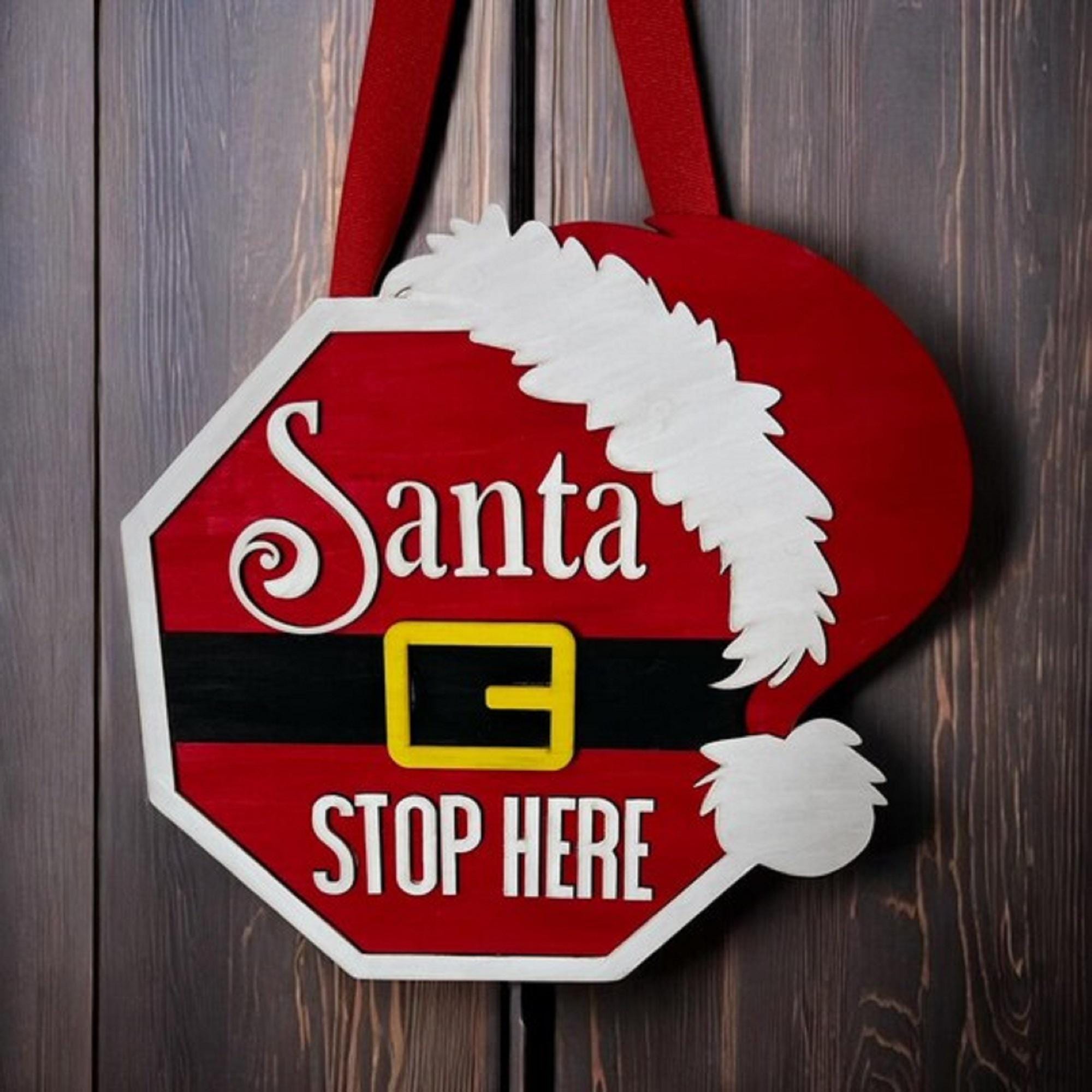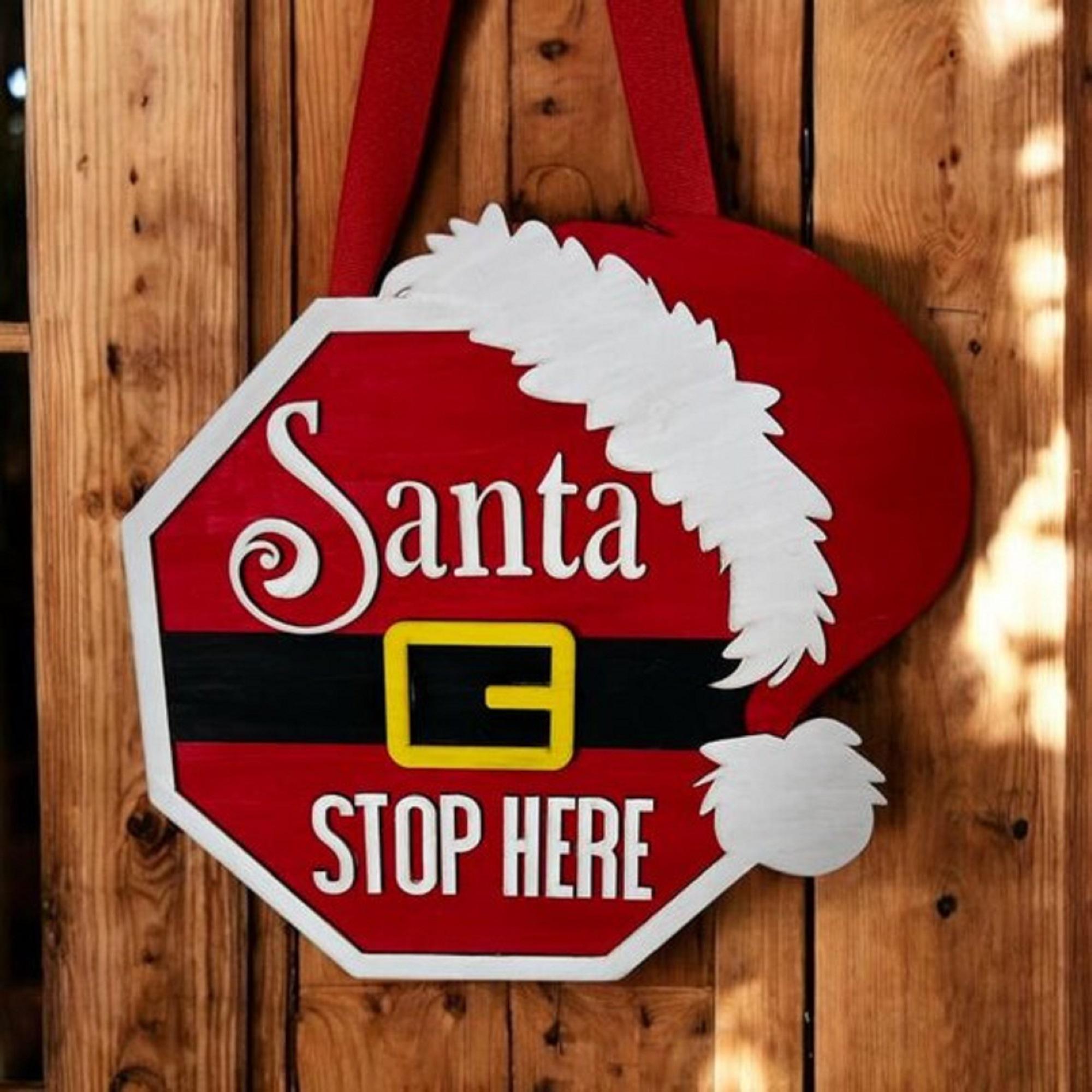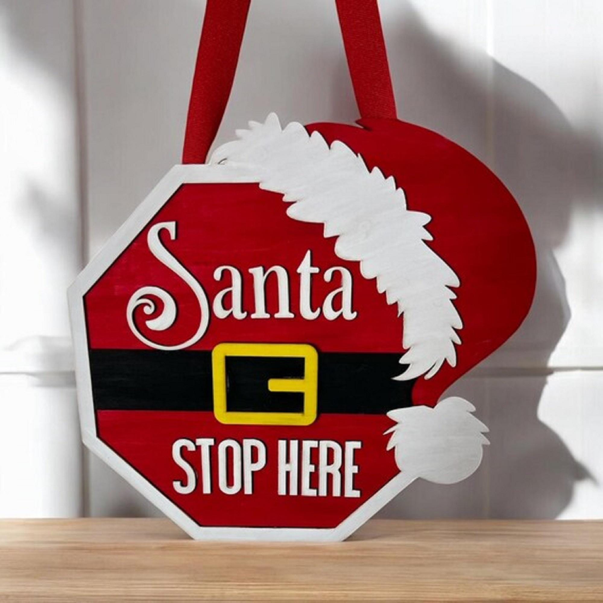 Welcome the holiday spirit with this charming Santa Stop Door Hanger, a unique Christmas decoration that adds warmth and festive cheer to any home. Featuring a hand-painted wooden Santa Stop sign, this holiday welcome sign stands out as a heartfelt seasonal accent perfect for your front door or wall.