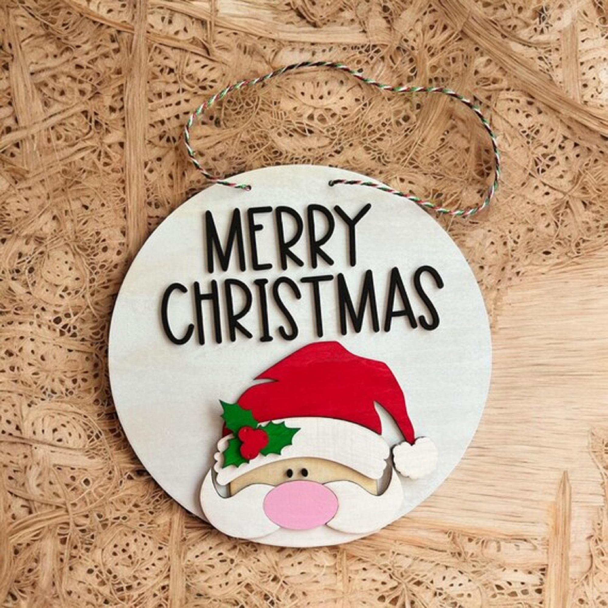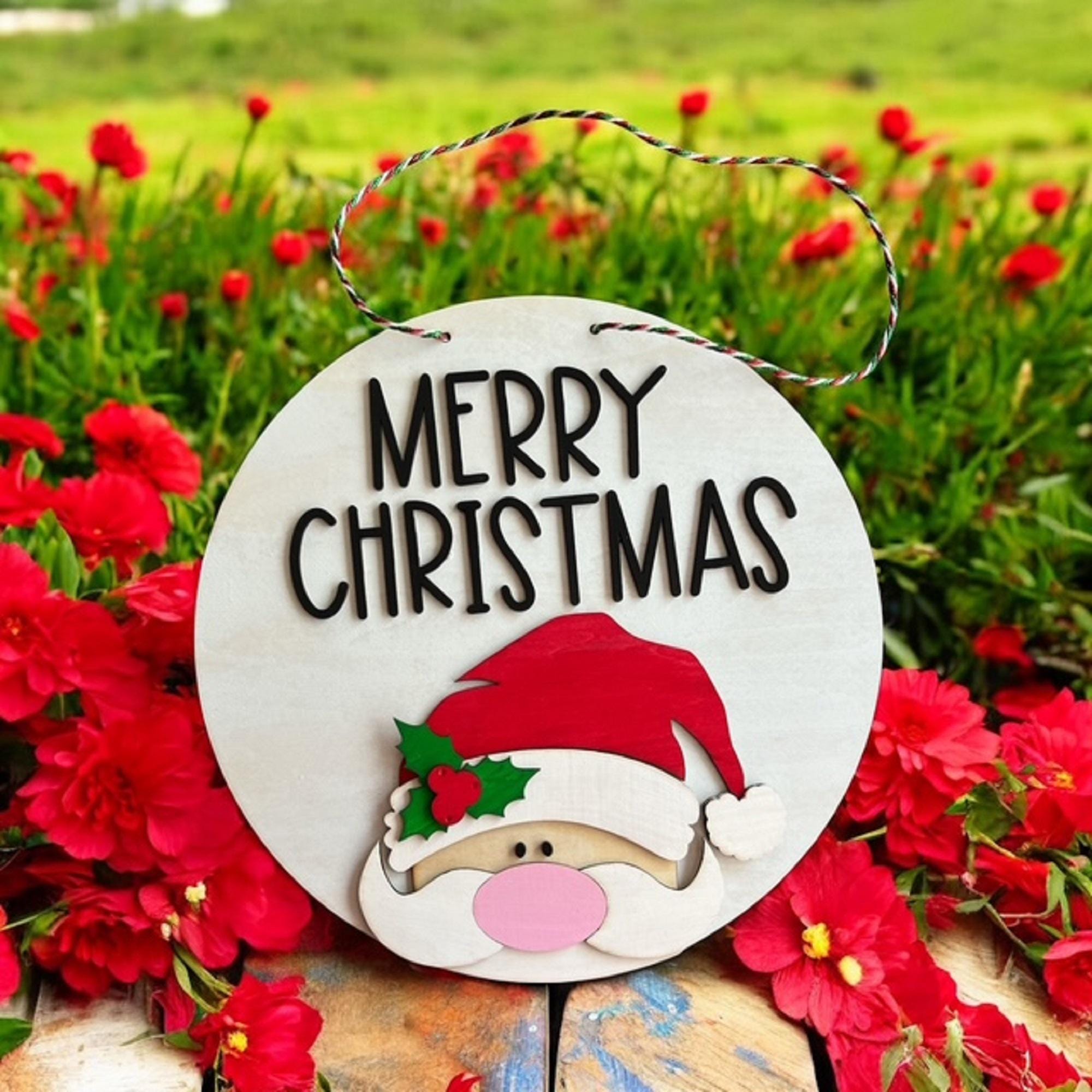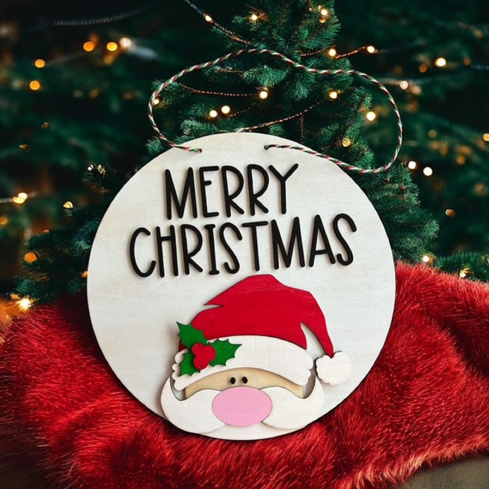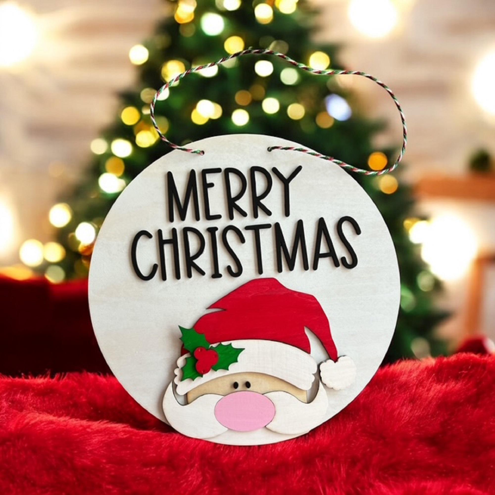 Welcome the holiday season with this charming Santa Merry Christmas Door Hanger, featuring a classic wooden Santa figure dressed in festive red and white attire, complemented by bold Merry Christmas lettering. This handcrafted Xmas sign stands out for its authentic design and sturdy build, making it a joyful seasonal welcome decoration for your front door.