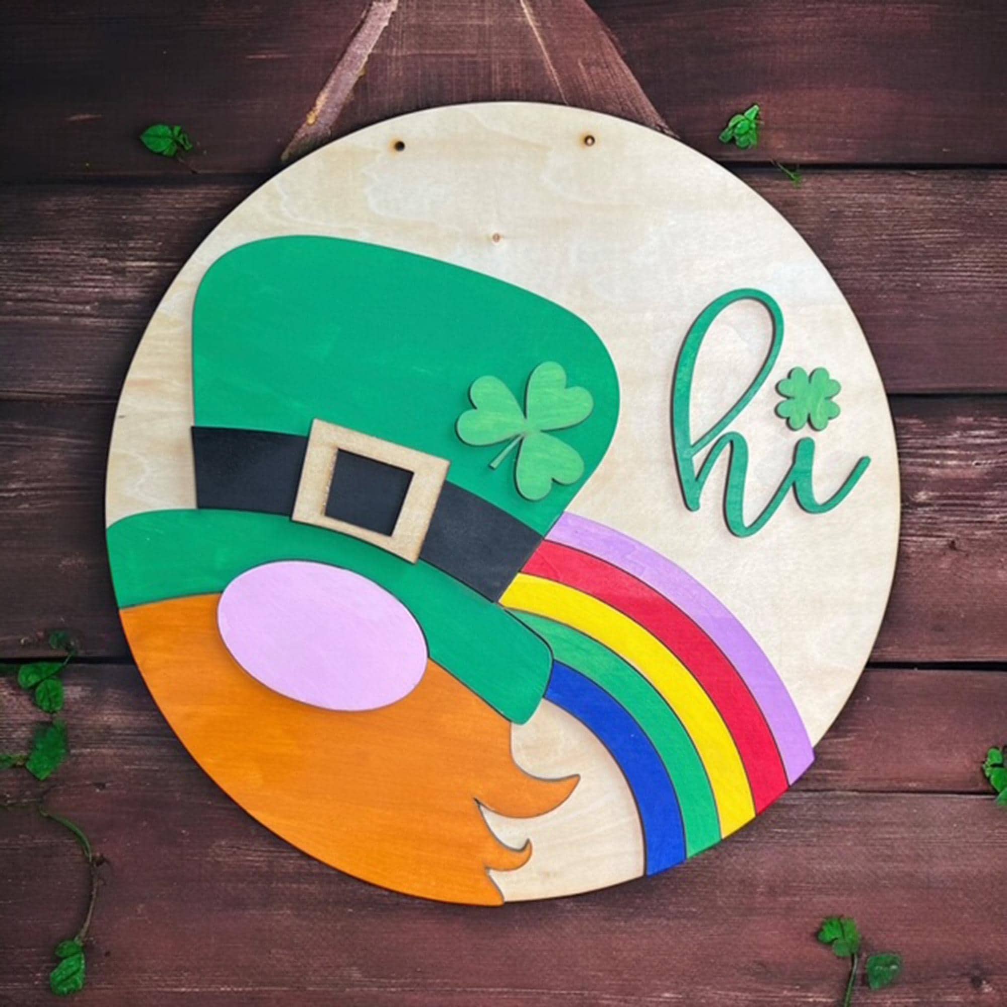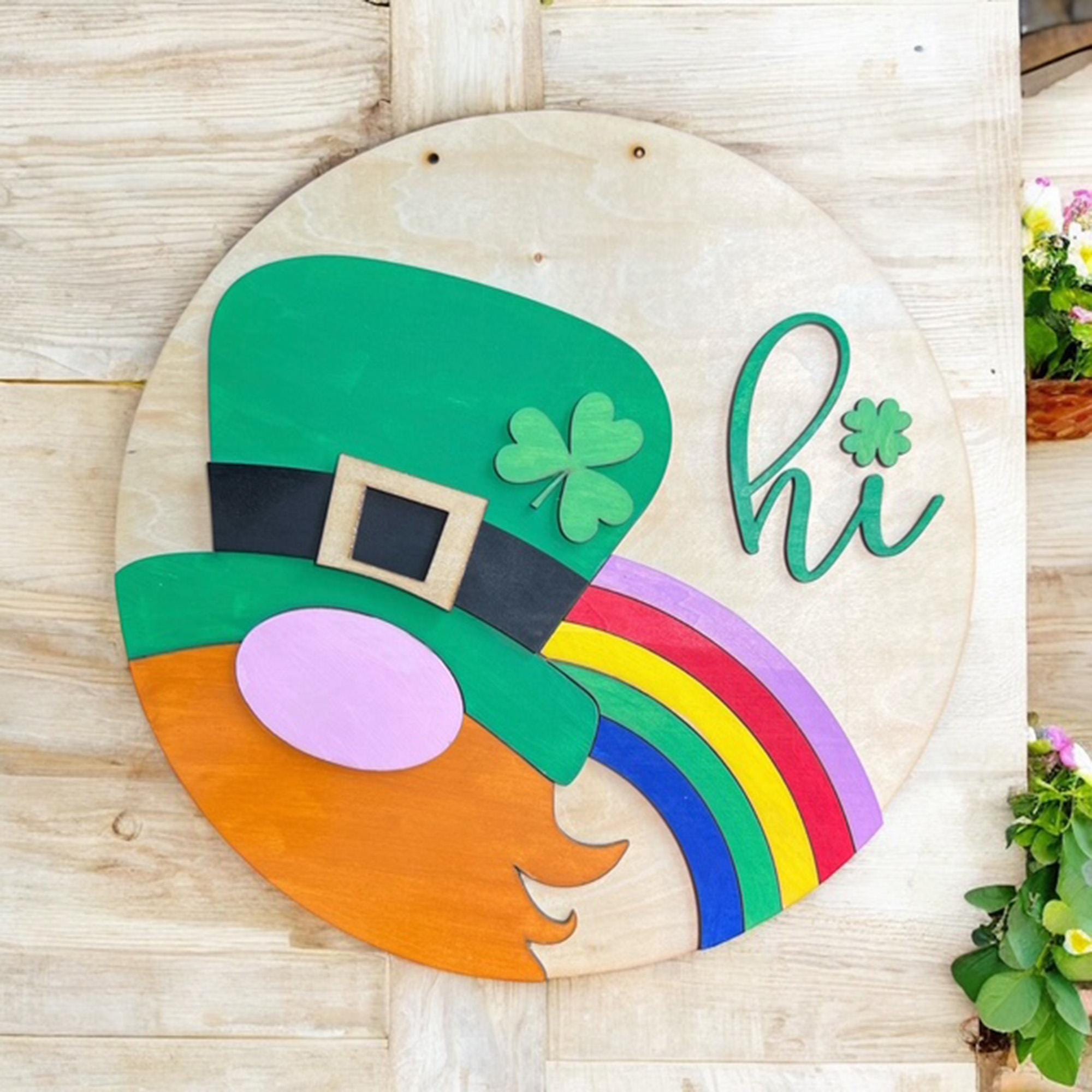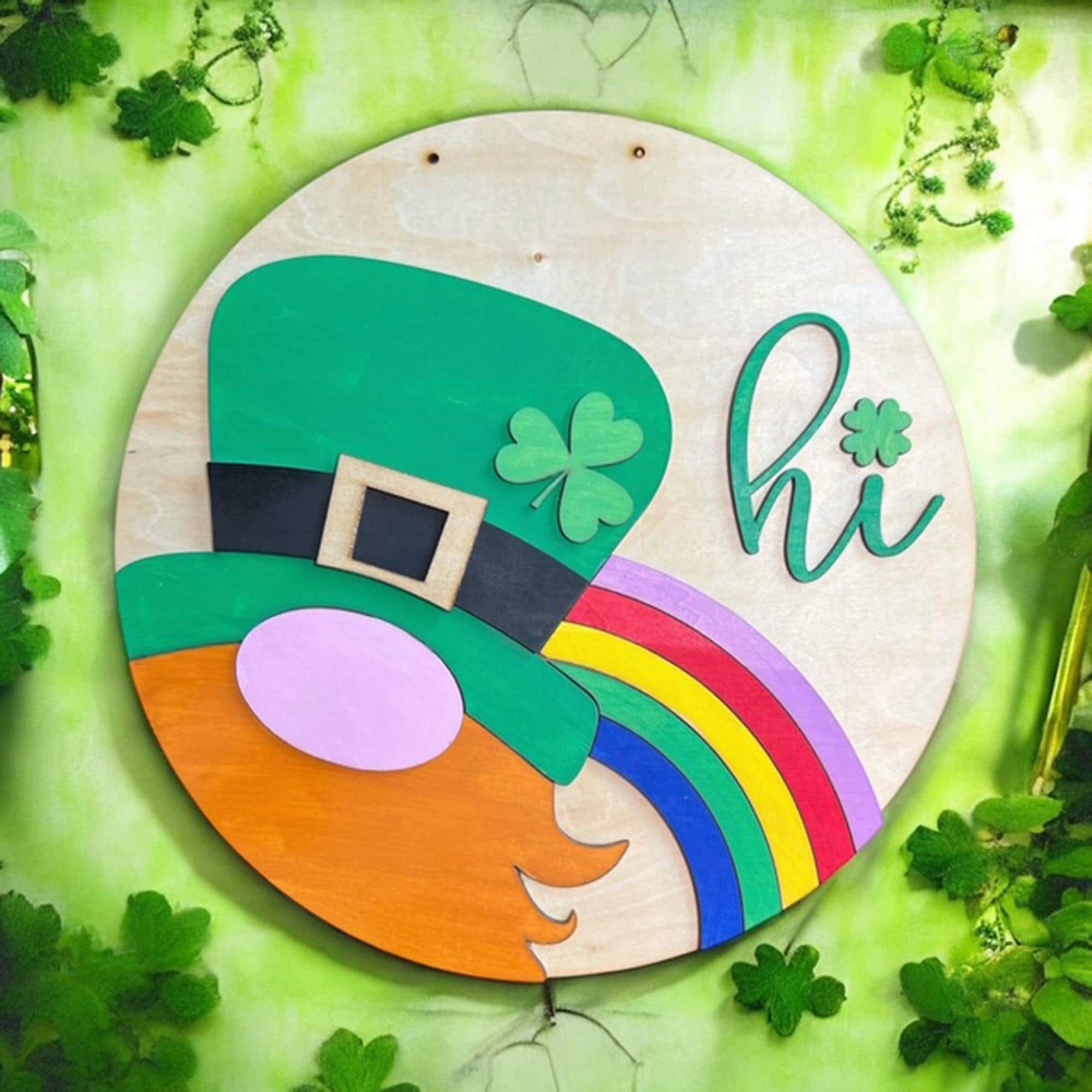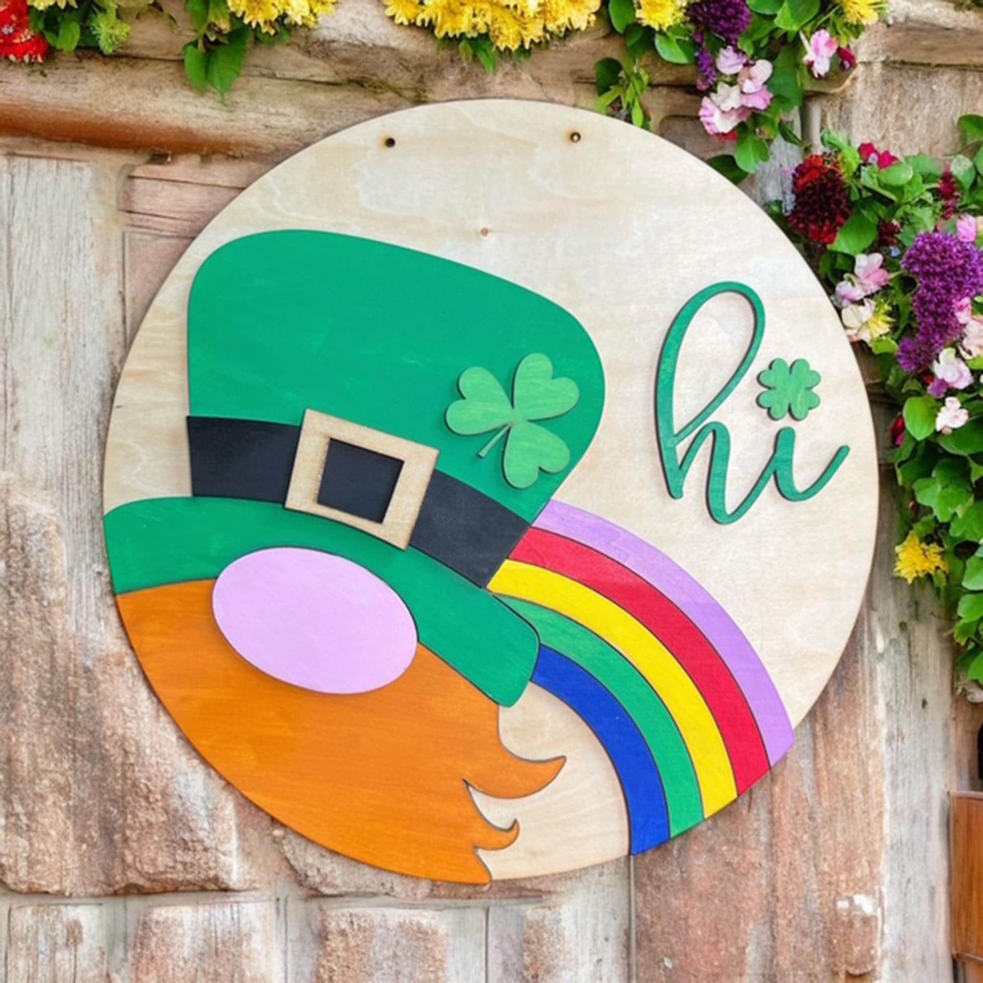 Measuring approximately 12 inches diameter and made from durable, 3mm basswood, this door hanger is designed to welcome visitors with St. Patrick's Day cheer. Each piece is carefully crafted, ensuring the cheerful gnome’s expressive details and the bold rainbow stand out. Lightweight yet sturdy, it’s easy to hang securely on any standard door, making it an effortless way to add festive spirit.