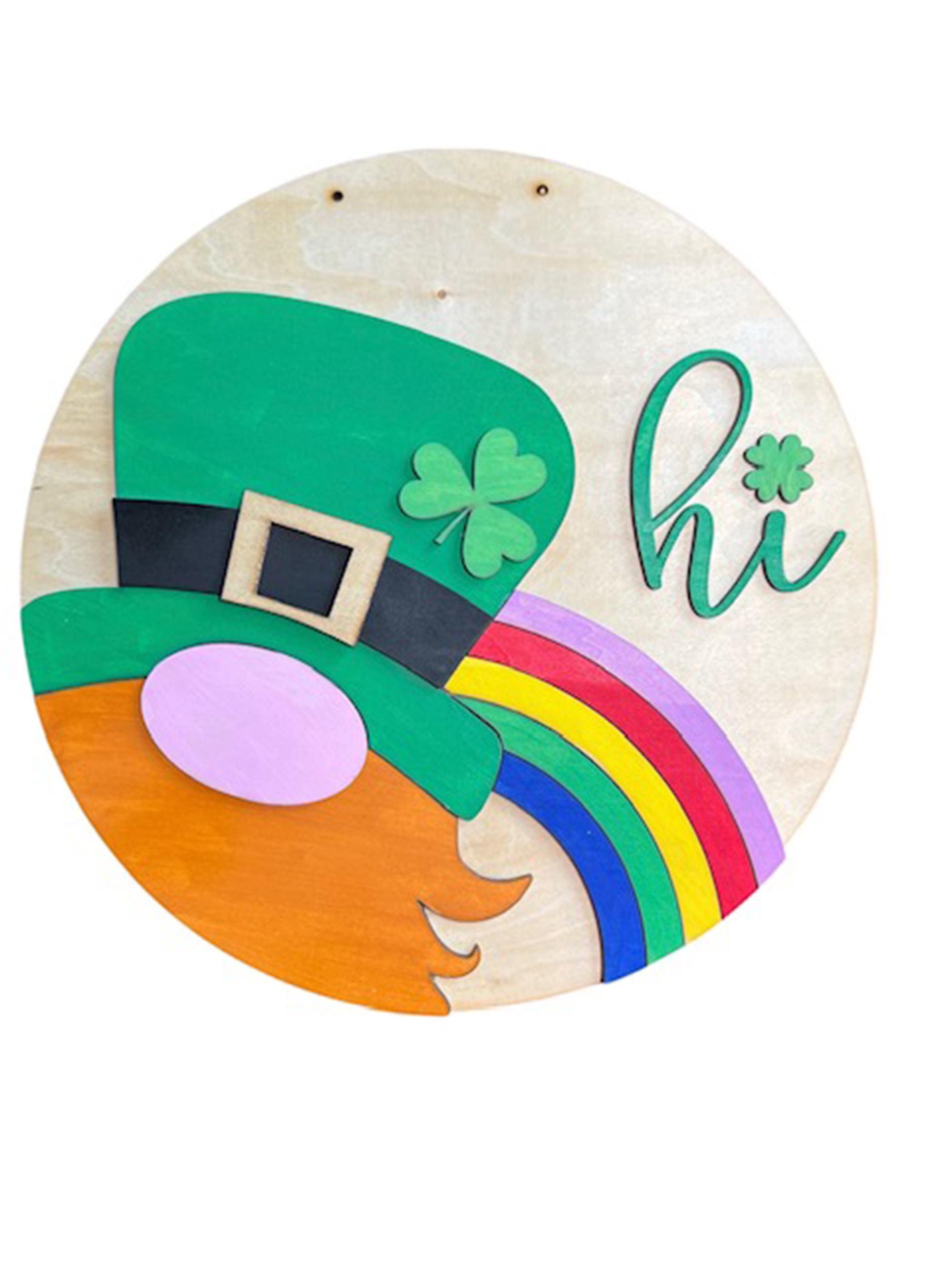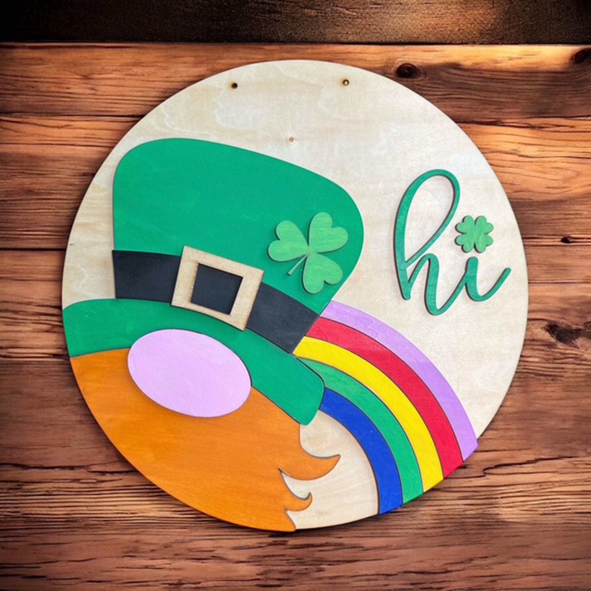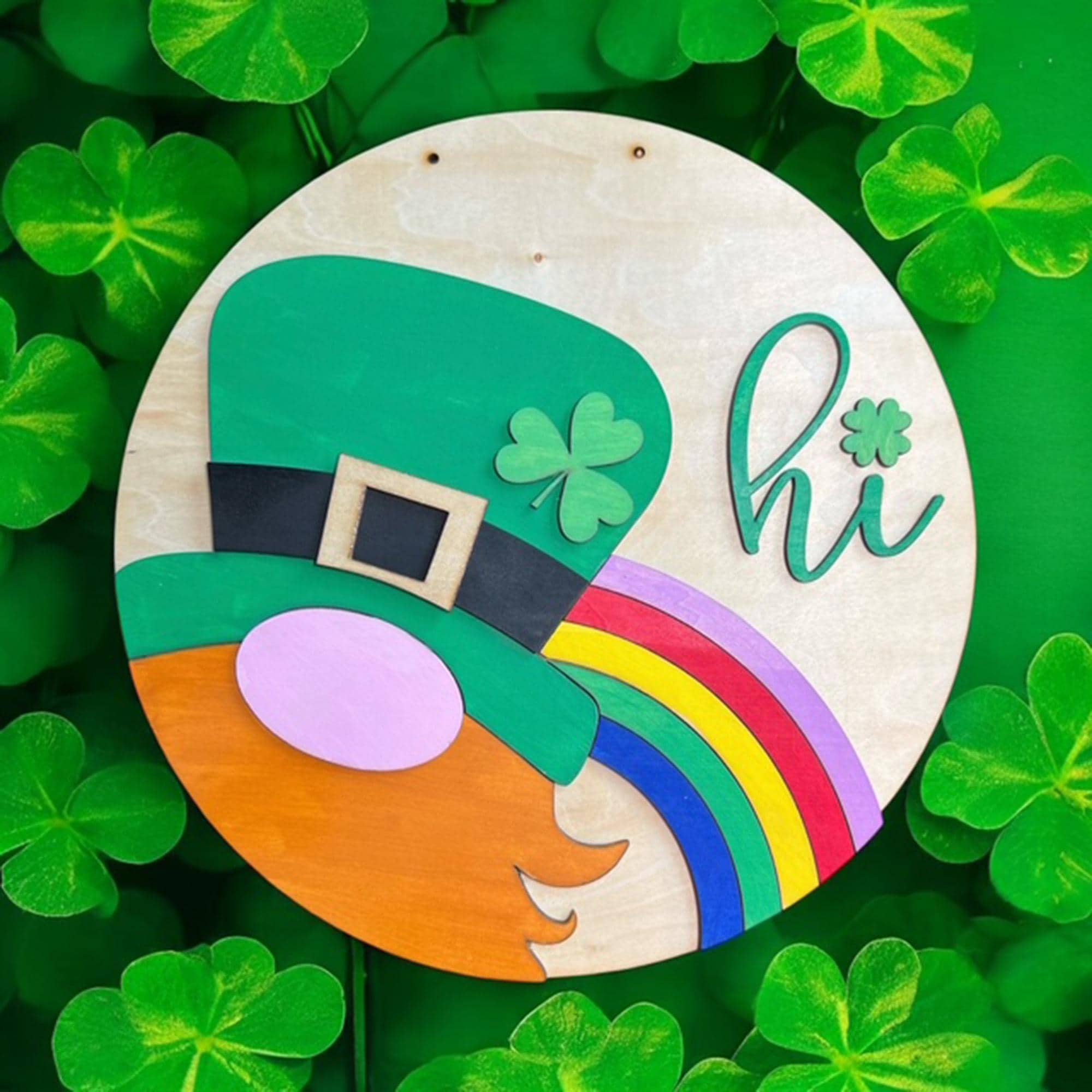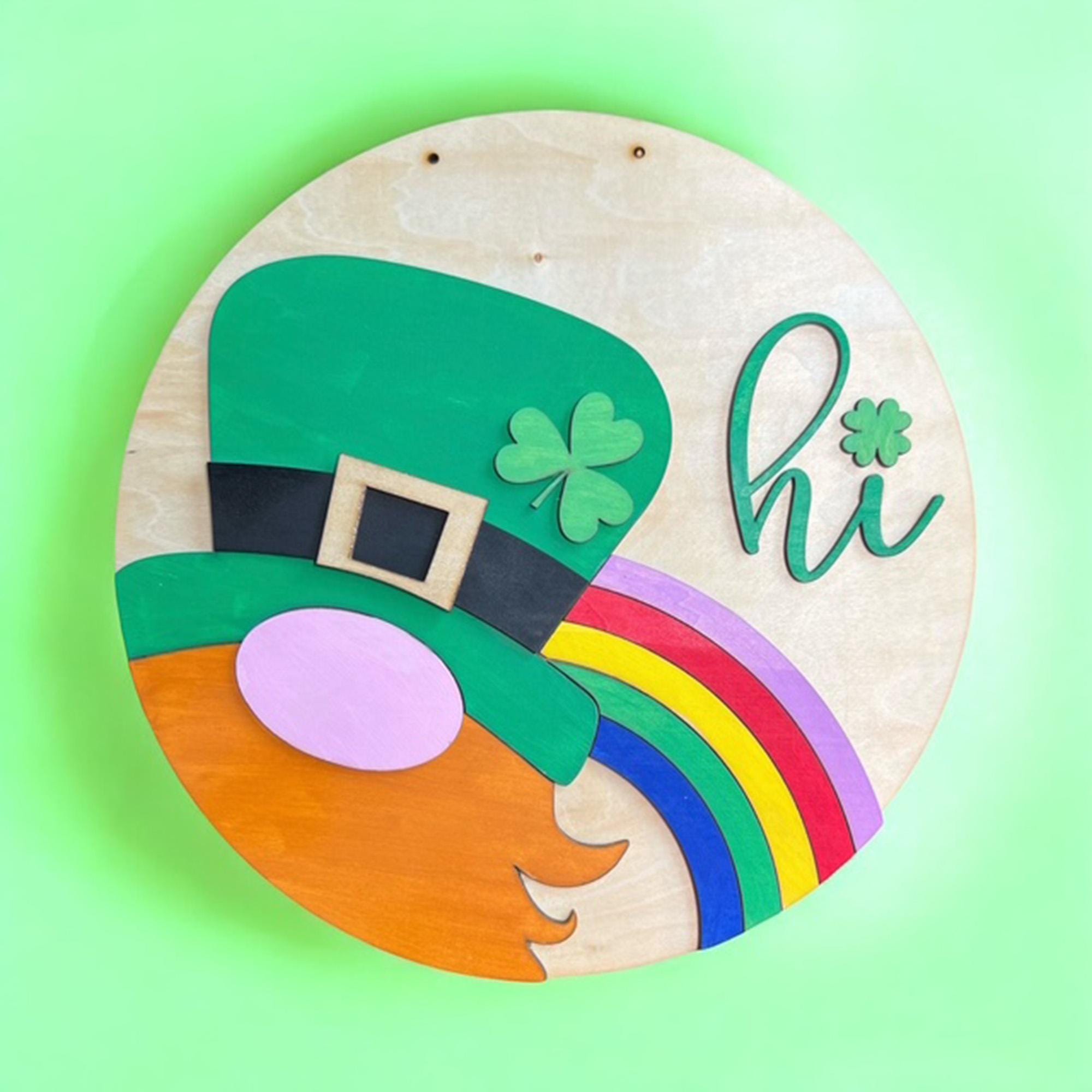 Measuring approximately 12 inches diameter and made from durable, 3mm basswood, this door hanger is designed to welcome visitors with St. Patrick's Day cheer. Each piece is carefully crafted, ensuring the cheerful gnome’s expressive details and the bold rainbow stand out. Lightweight yet sturdy, it’s easy to hang securely on any standard door, making it an effortless way to add festive spirit.