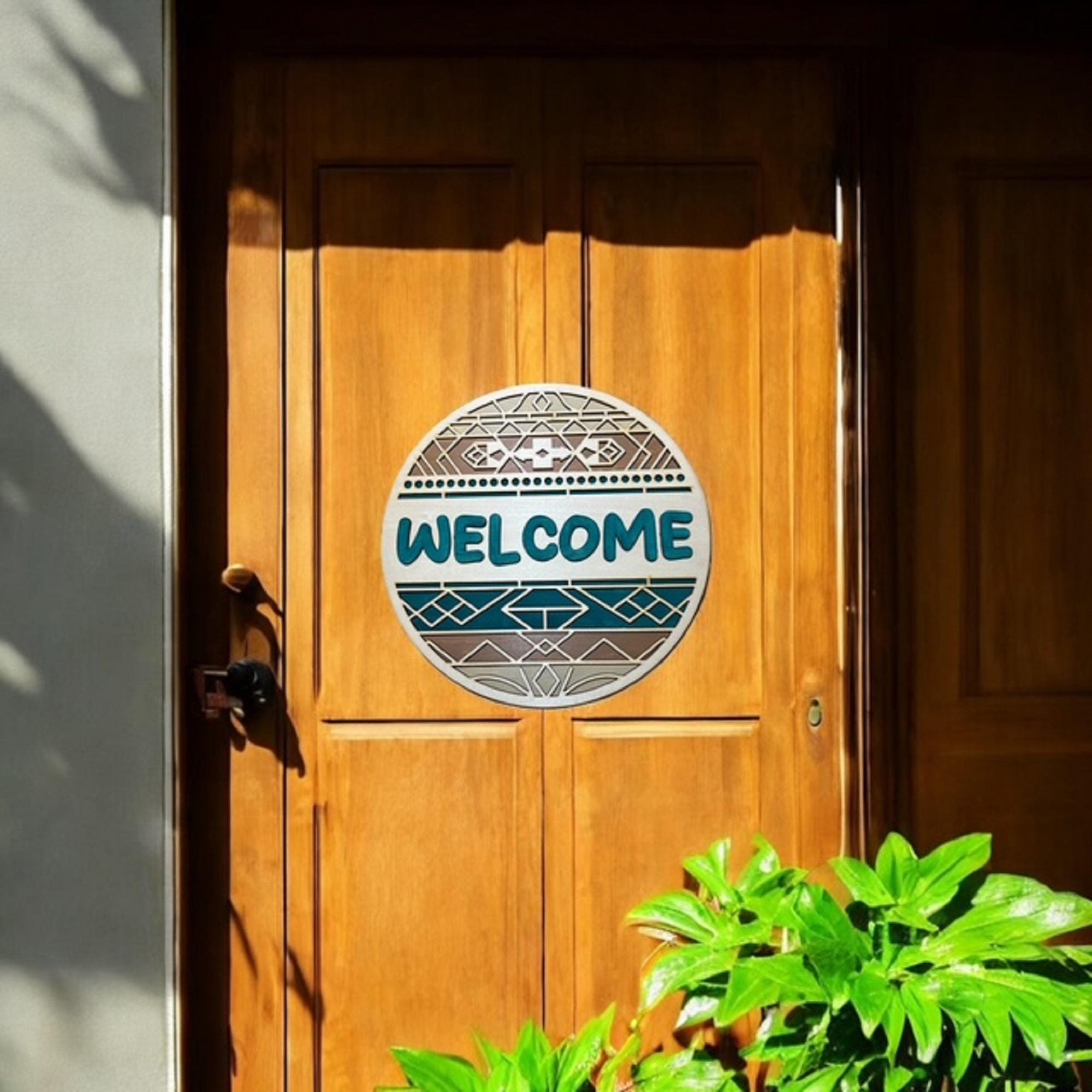 Designed with durability in mind, this rustic wooden décor is ideal for protected outdoor use while maintaining its charming appearance. The bold "WELCOME" message in vibrant teal adds a pop of color and warmth, making it a standout piece on your front door.