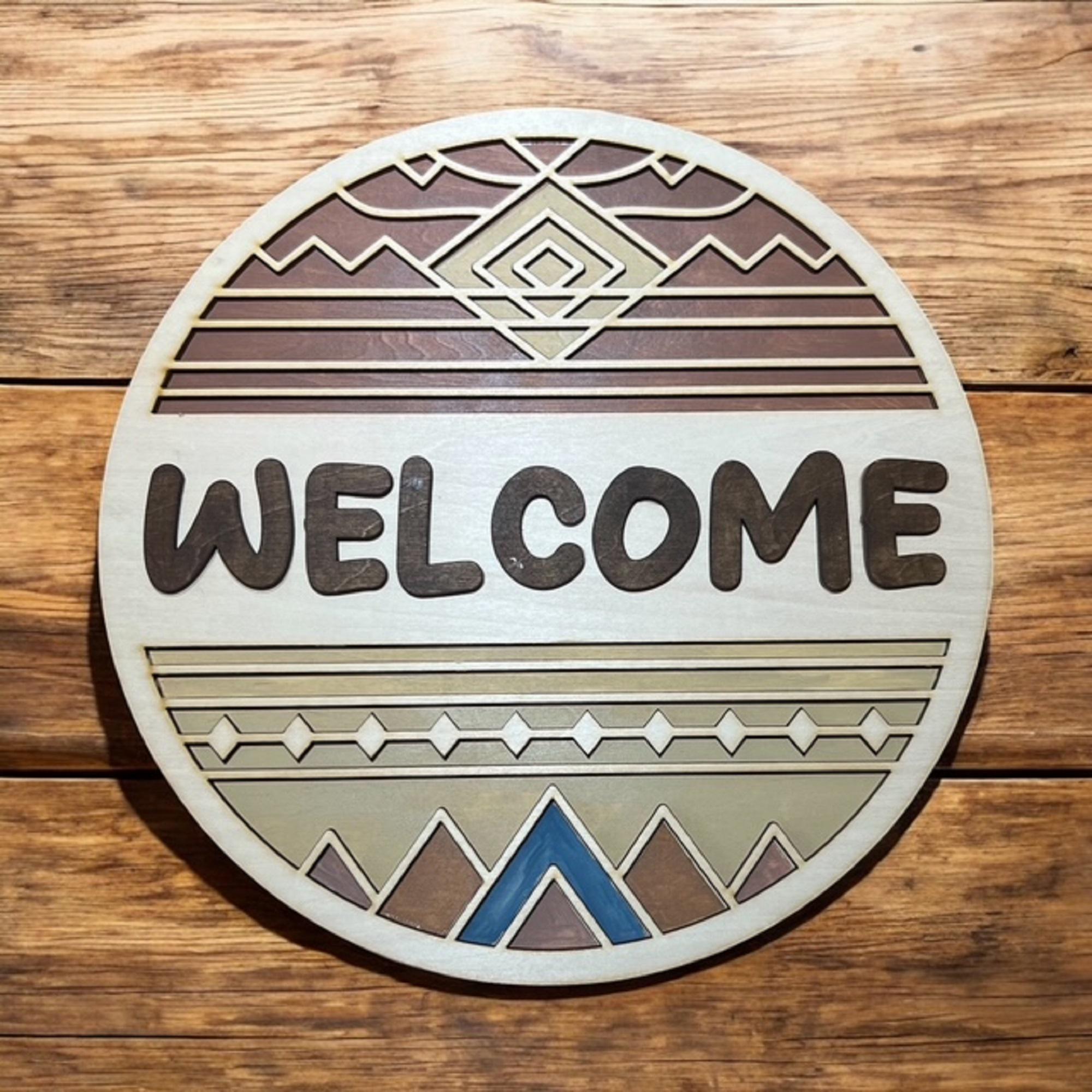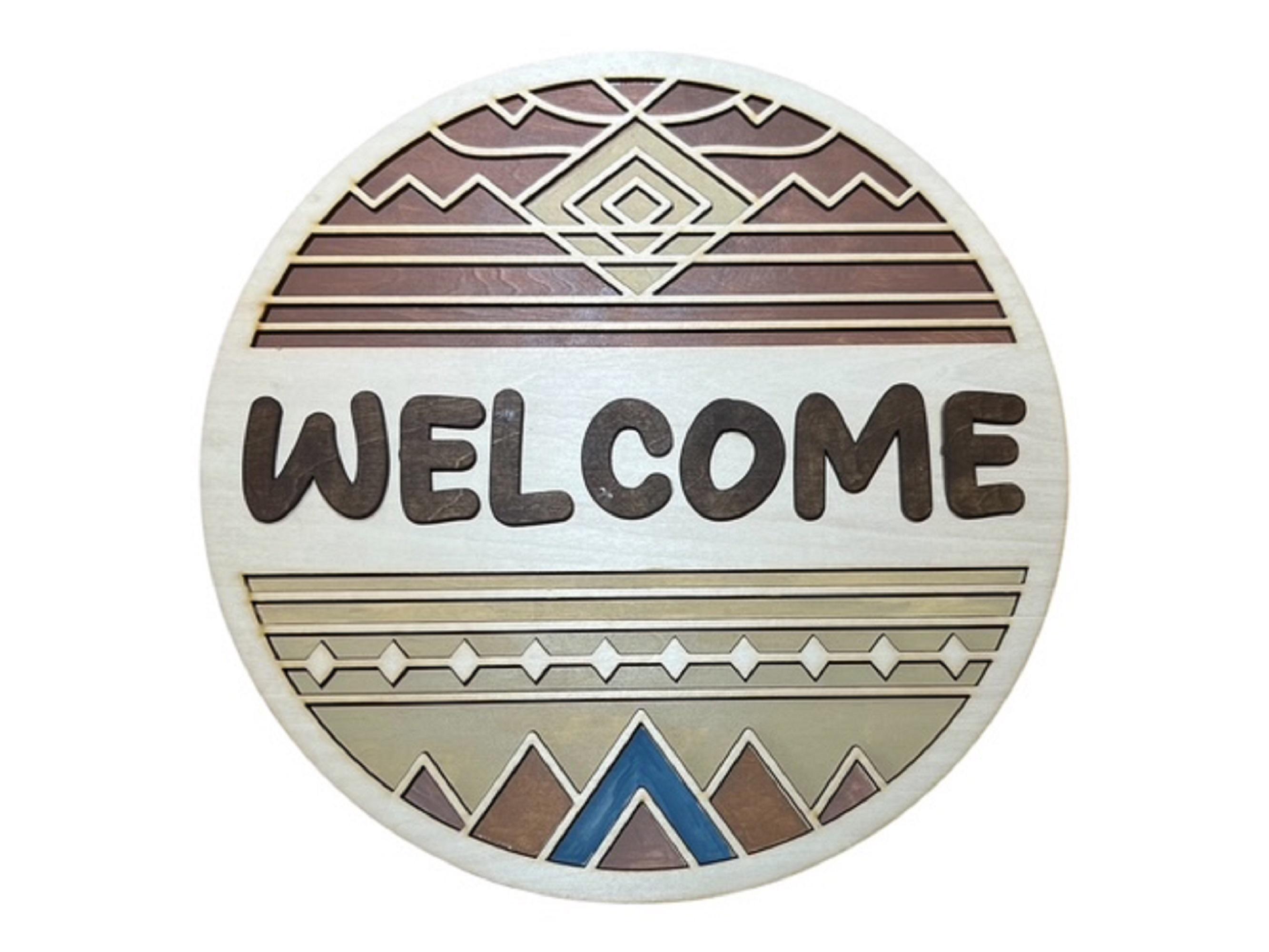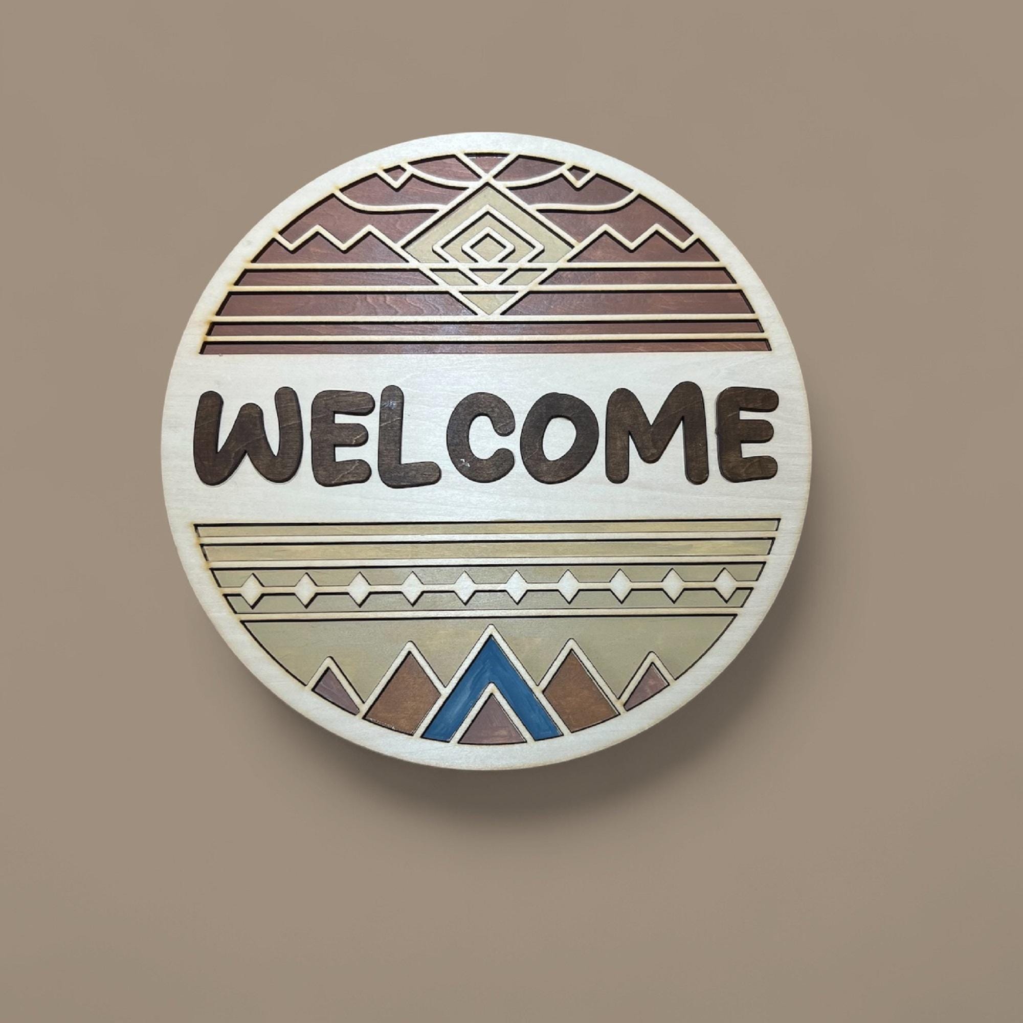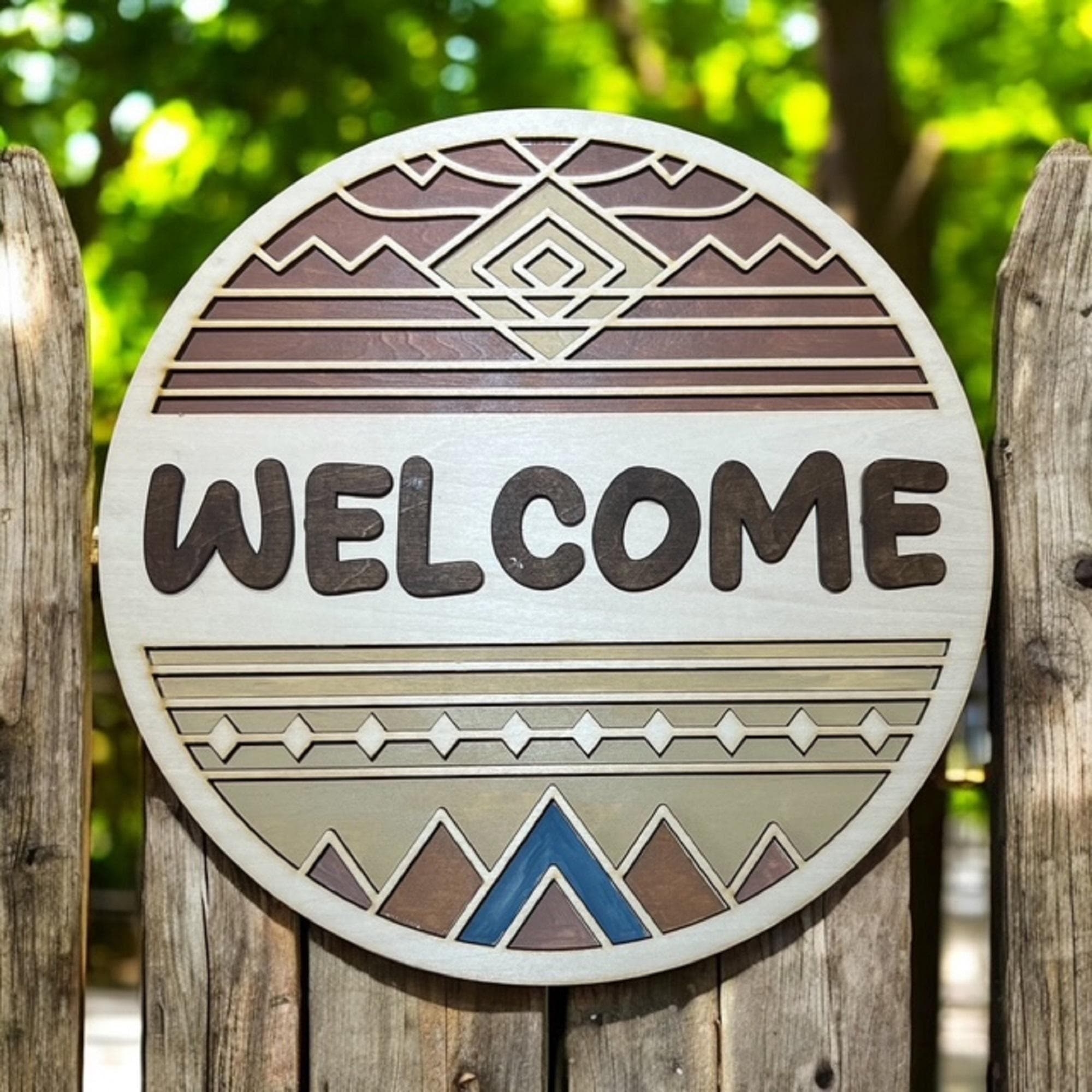 Made from high-quality materials, this unique wall décor features a circular design with intricate geometric mountain motifs and a bold "WELCOME" message at its center. Its rustic finish and earthy tones blend seamlessly with farmhouse, boho, or nature-inspired décor themes. The lightweight construction makes installation easy, and it’s suitable for both protected outdoor and indoor use, ensuring your entrance or wall always looks welcoming.