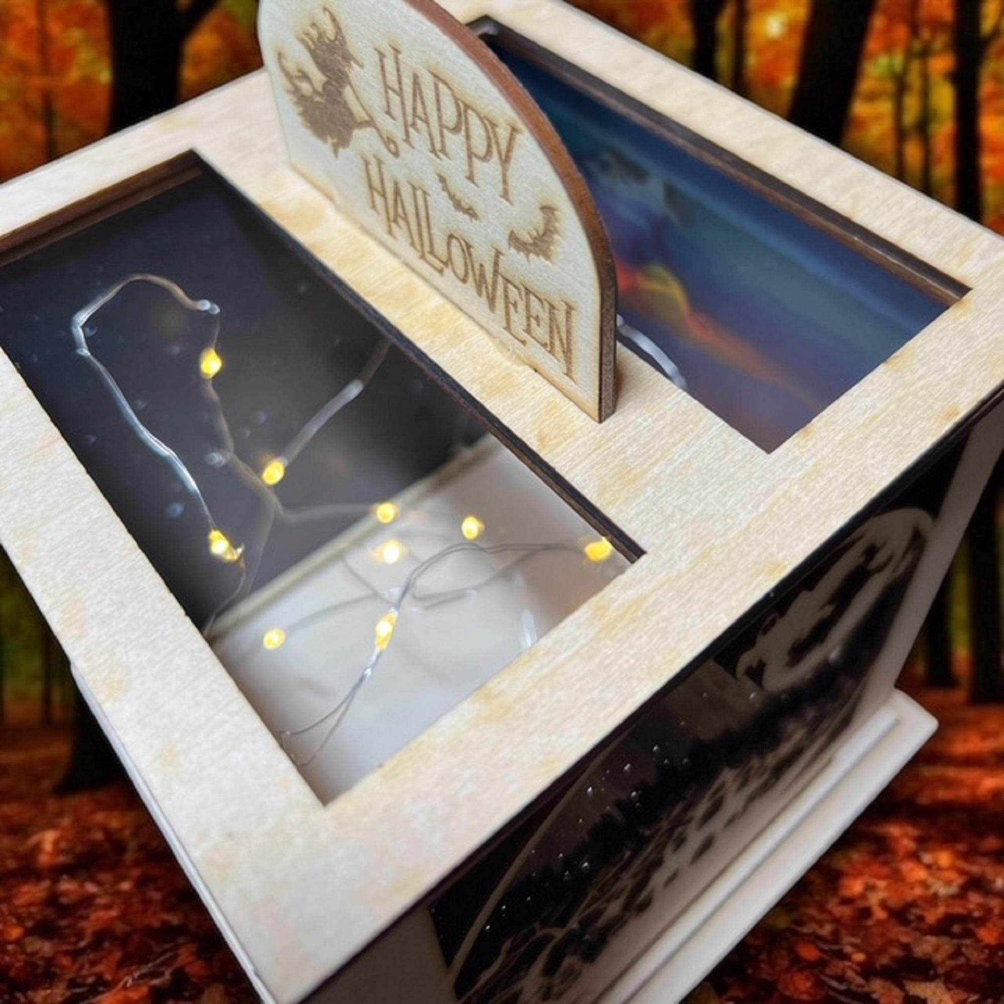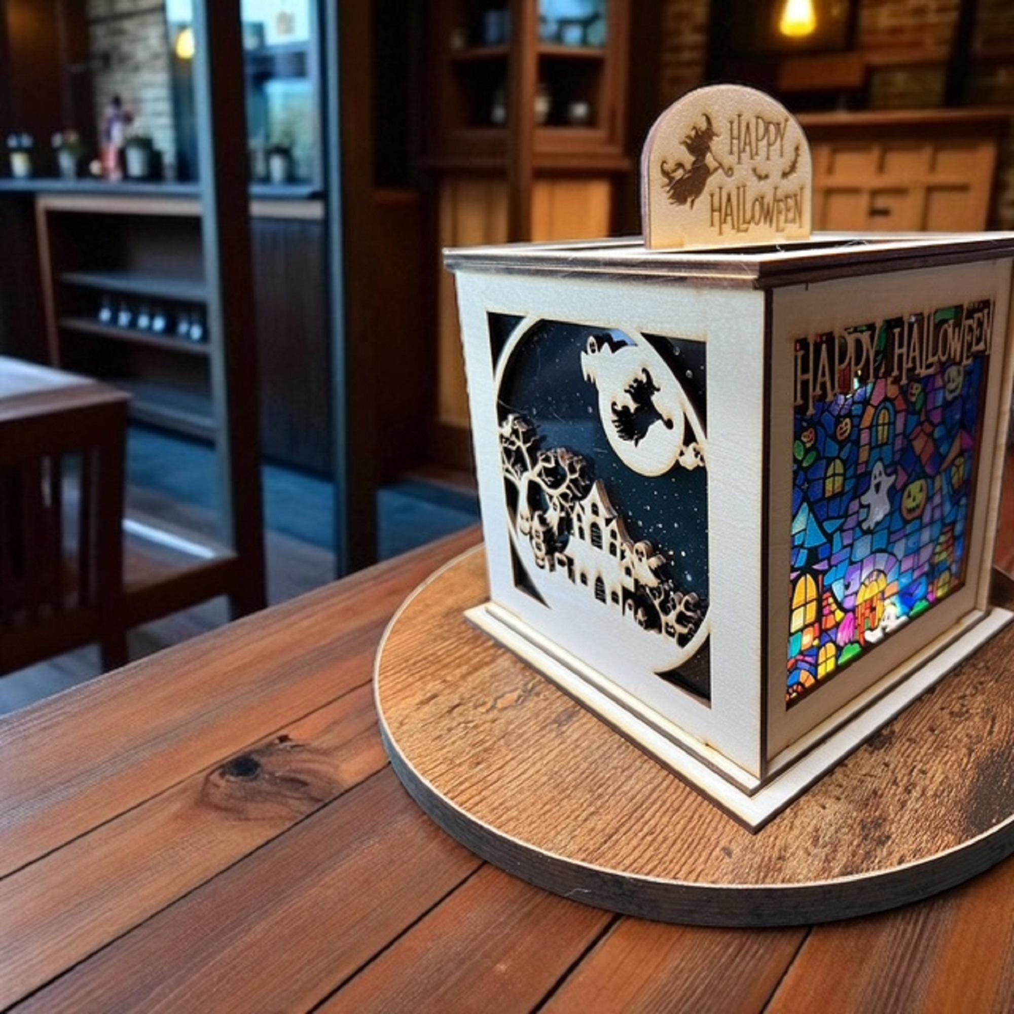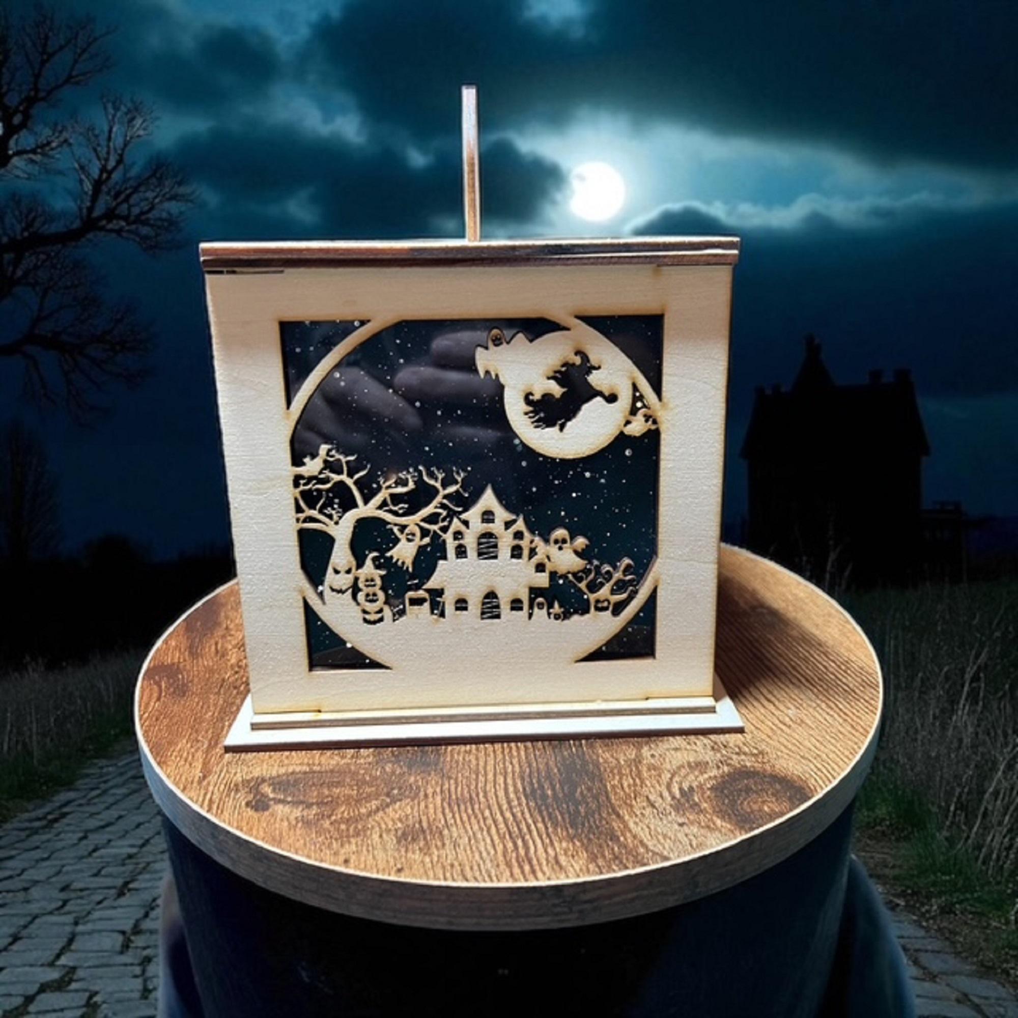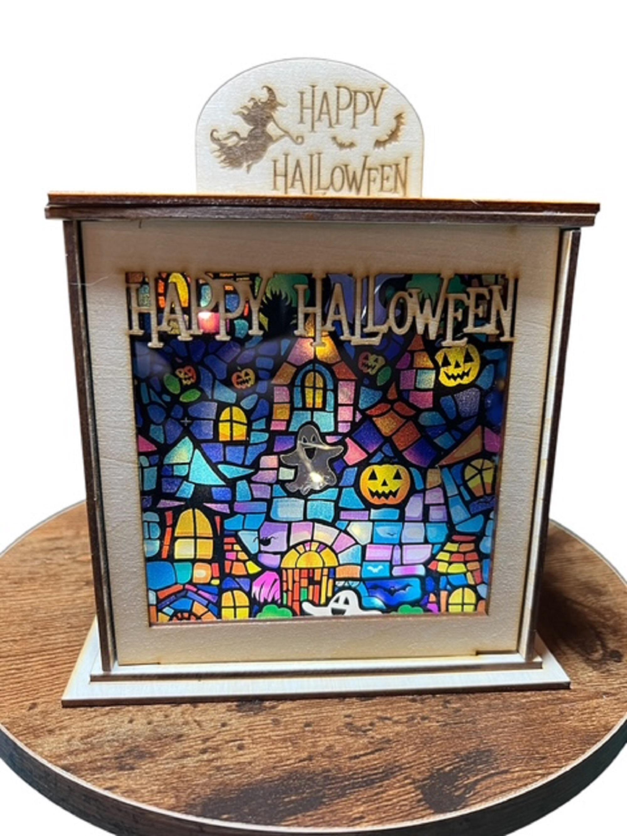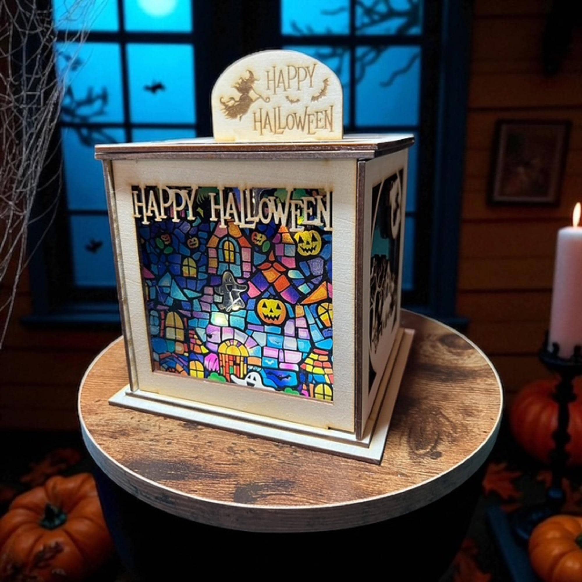 Illuminate your Halloween decor with this enchanting Halloween Fairy Light Lantern. Crafted with vibrant stained glass featuring playful pumpkins, spooky witches, and haunted houses, this lantern creates a warm, spooky glow perfect for setting the mood on your Halloween night. Whether displayed on a windowsill, mantel, or as a centerpiece, it adds a charming and festive touch to your holiday home decor.