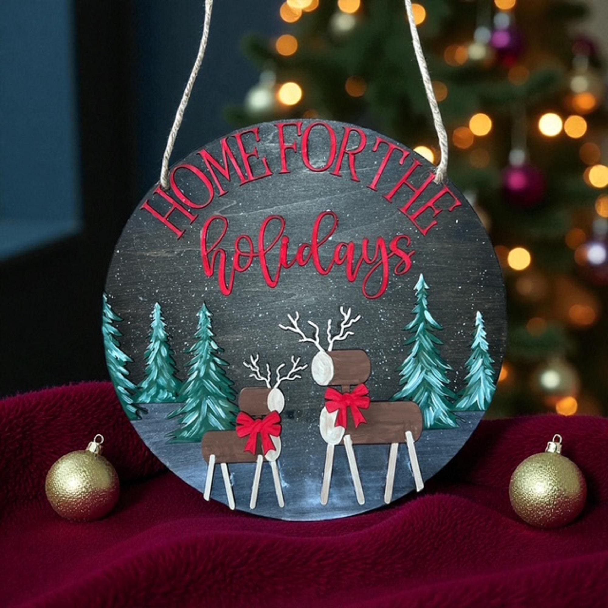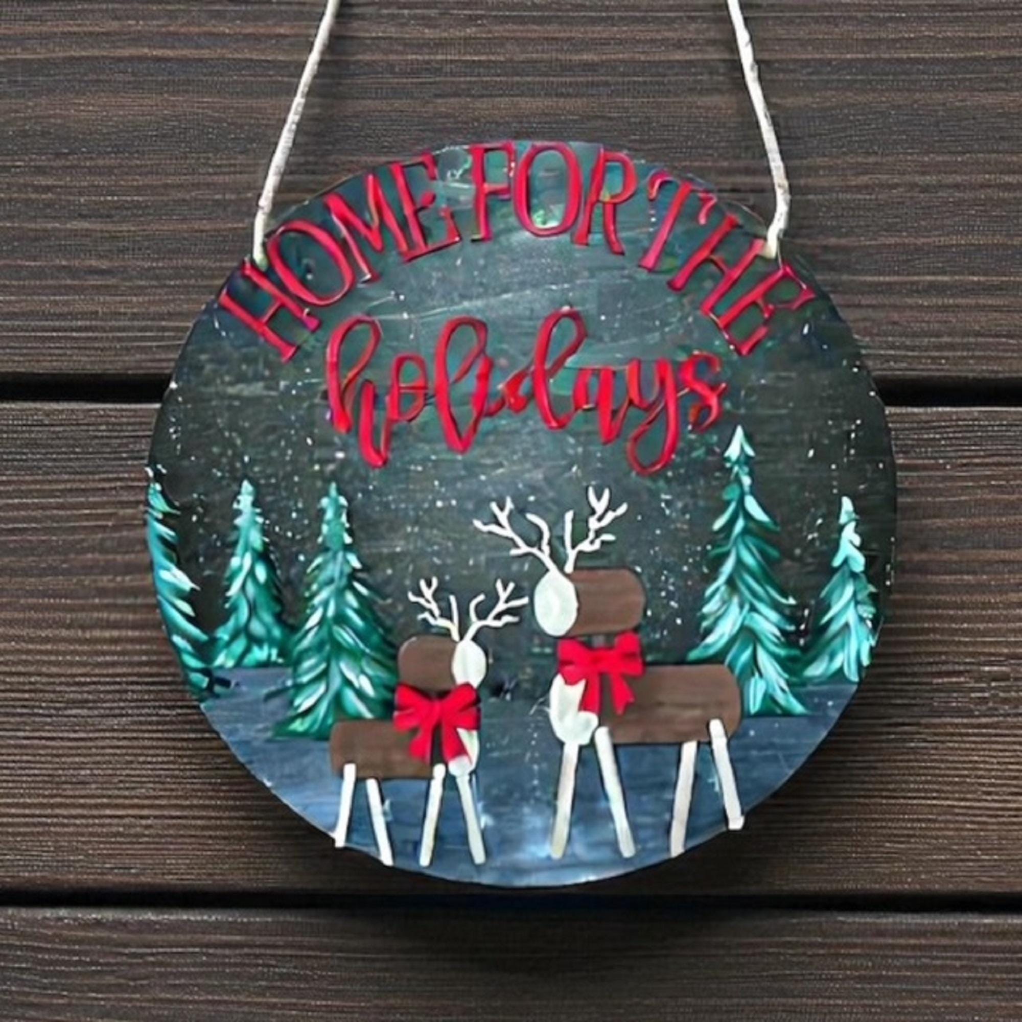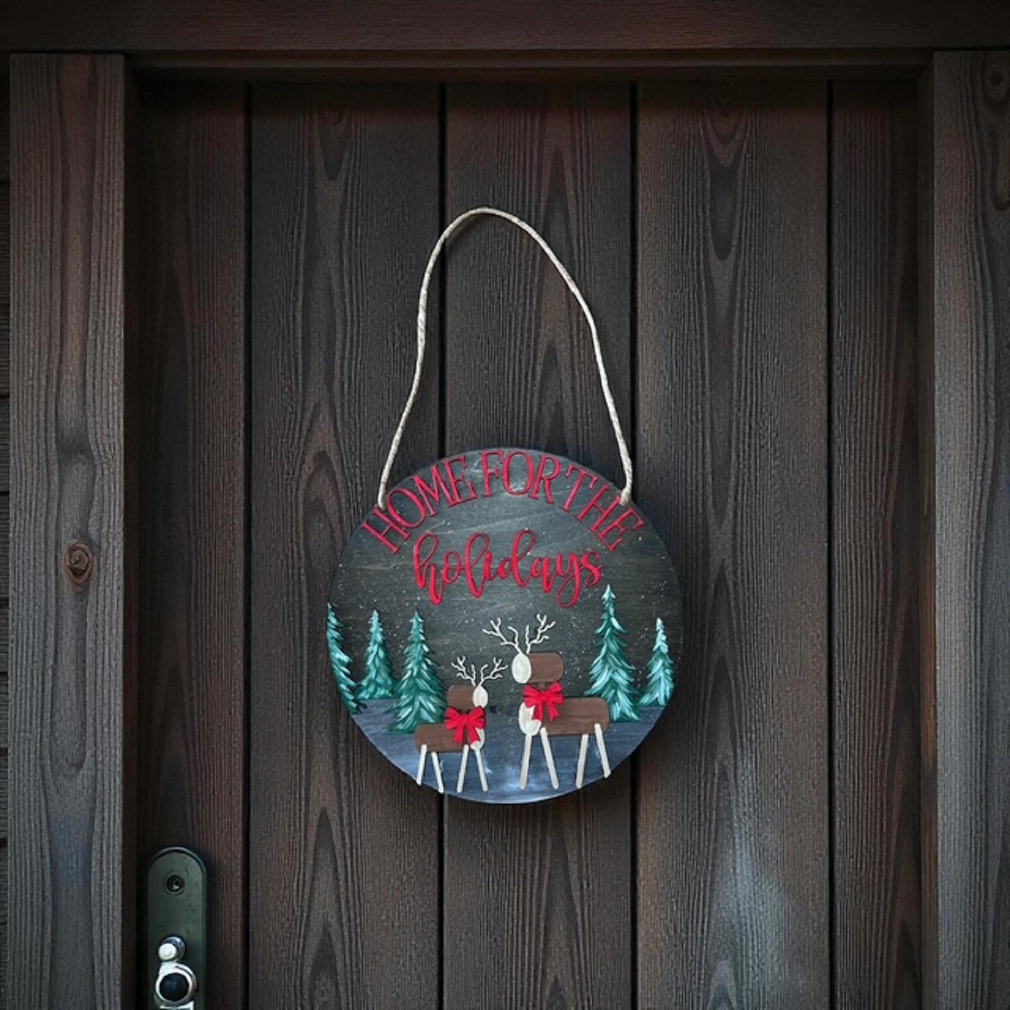 Welcome the holiday season with charm and rustic elegance using this adorable Rustic Deer Holiday Door Hanger! Perfect for adding a cozy, festive touch to your front door, this handcrafted piece features a charming woodland scene with rustic deer, pine trees, and color palette that captures the spirit of winter celebrations.
