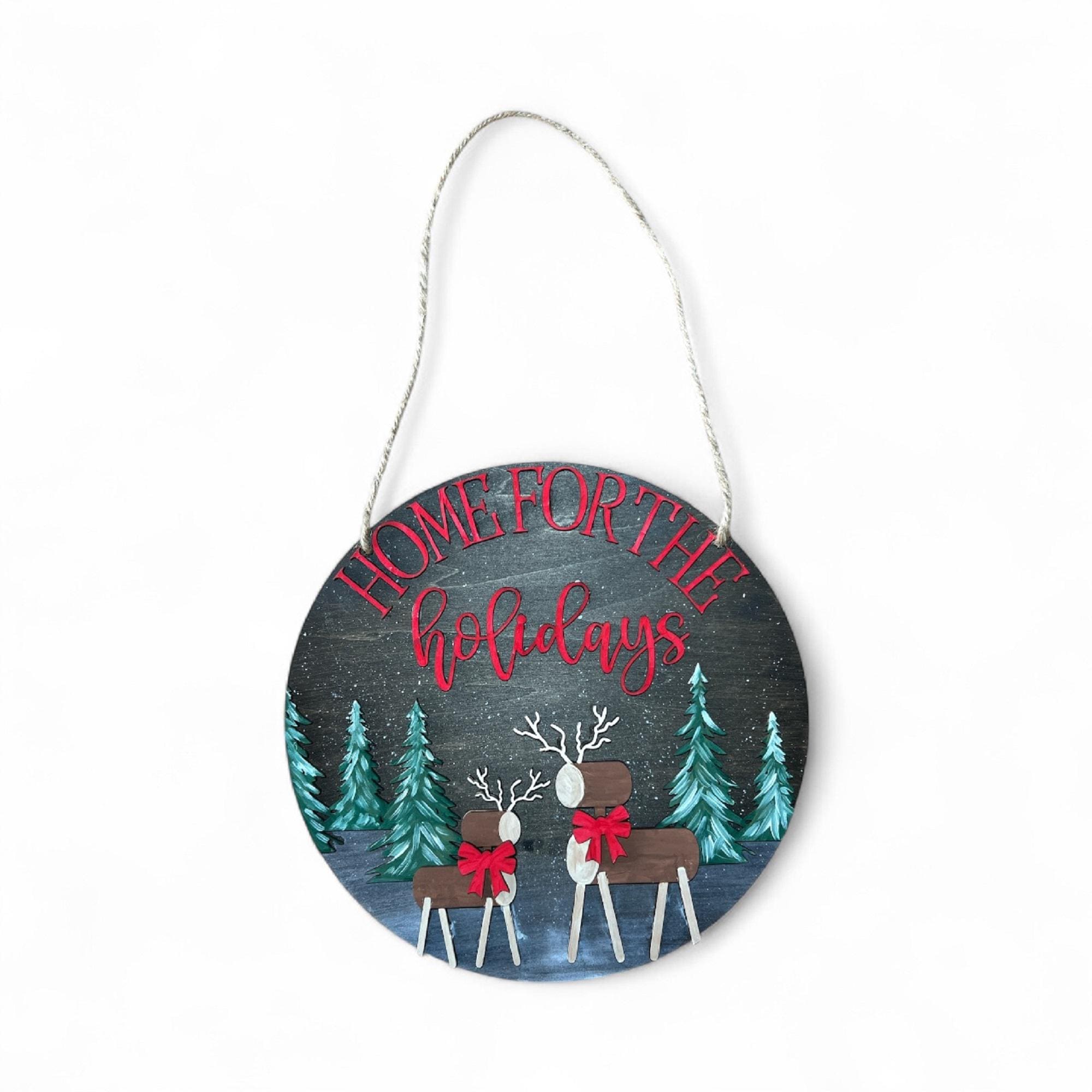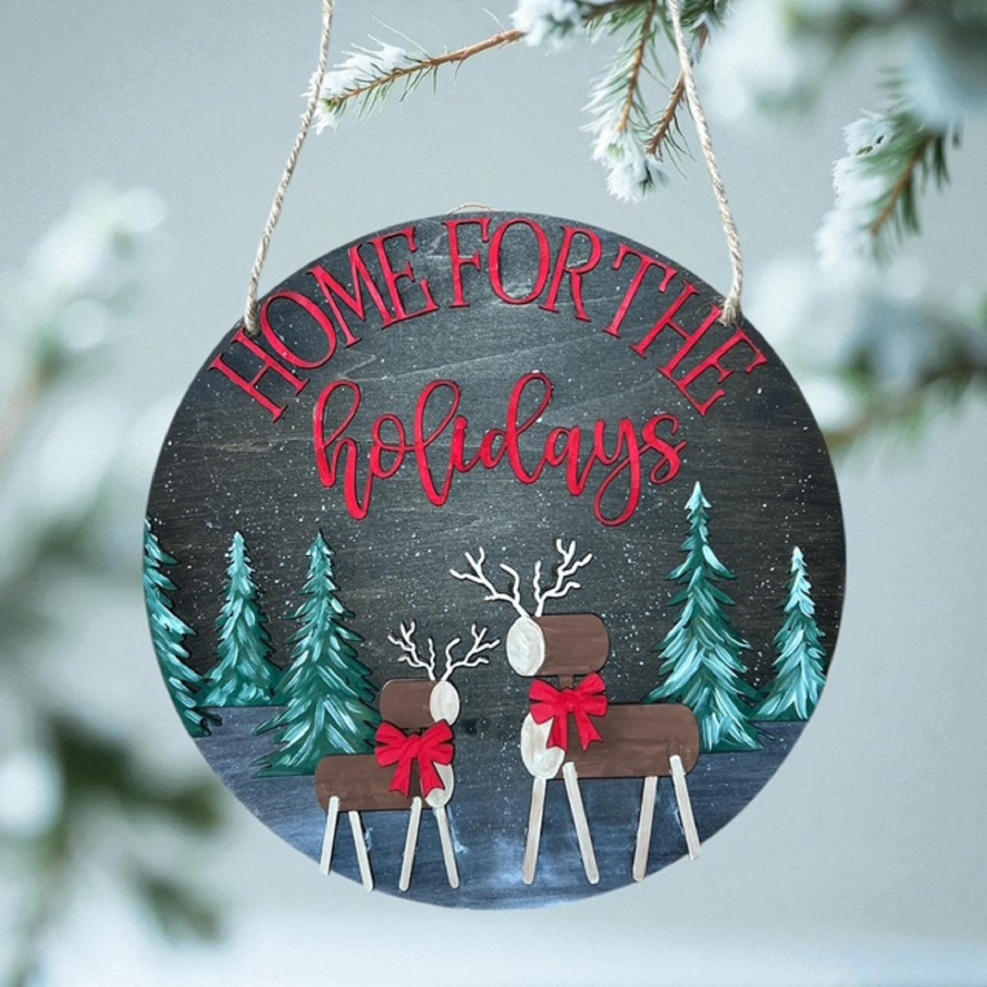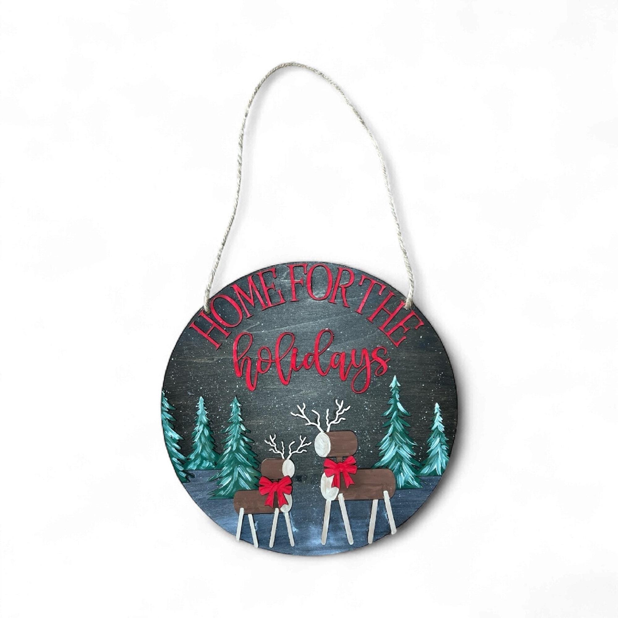 Welcome the holiday season with charm and rustic elegance using this adorable Rustic Deer Holiday Door Hanger! Perfect for adding a cozy, festive touch to your front door, this handcrafted piece features a charming woodland scene with rustic deer, pine trees, and color palette that captures the spirit of winter celebrations.